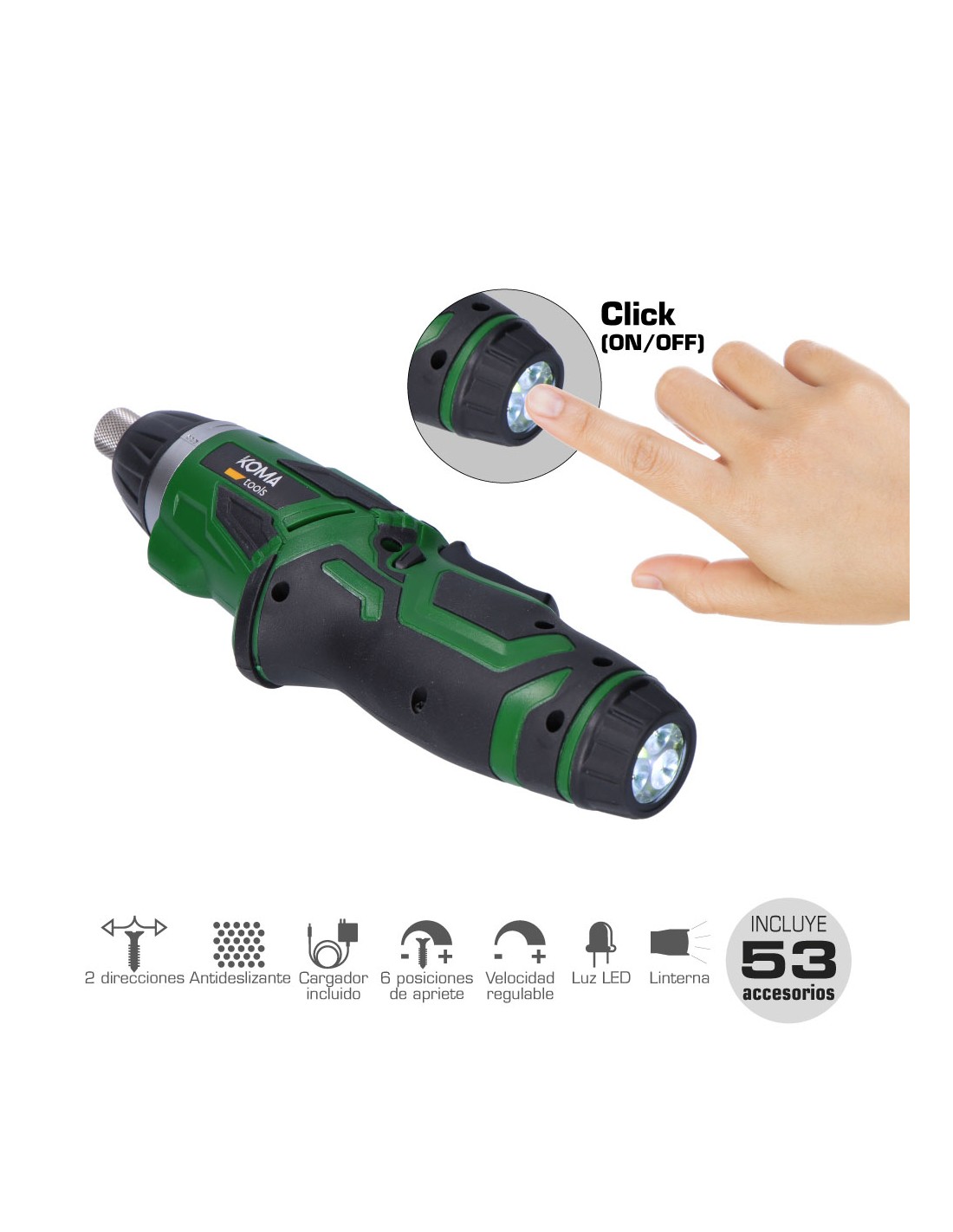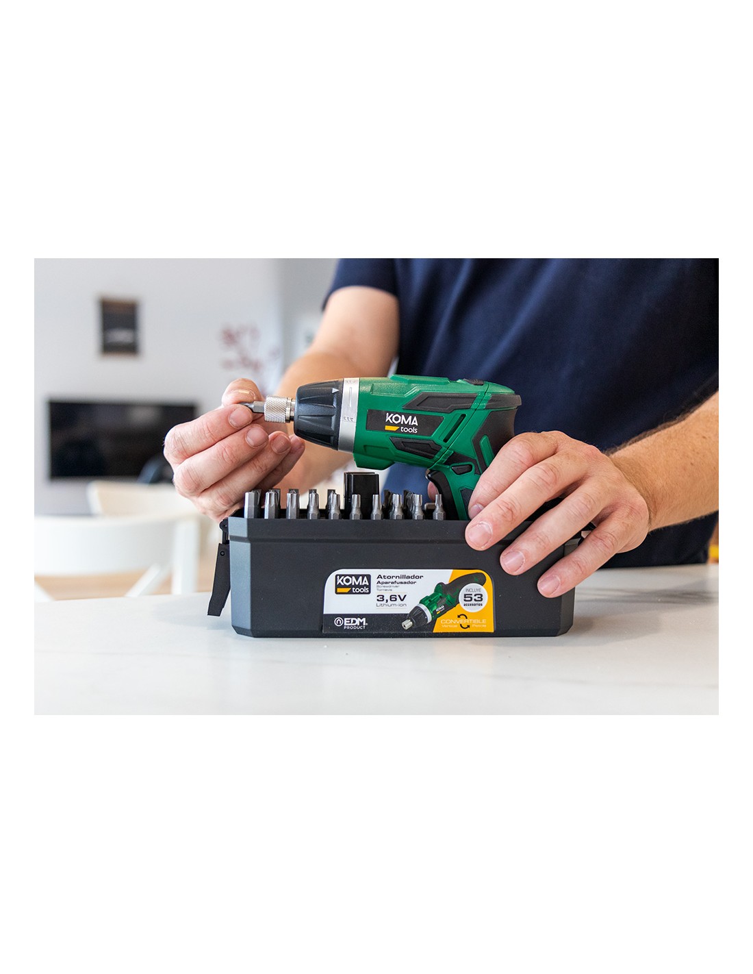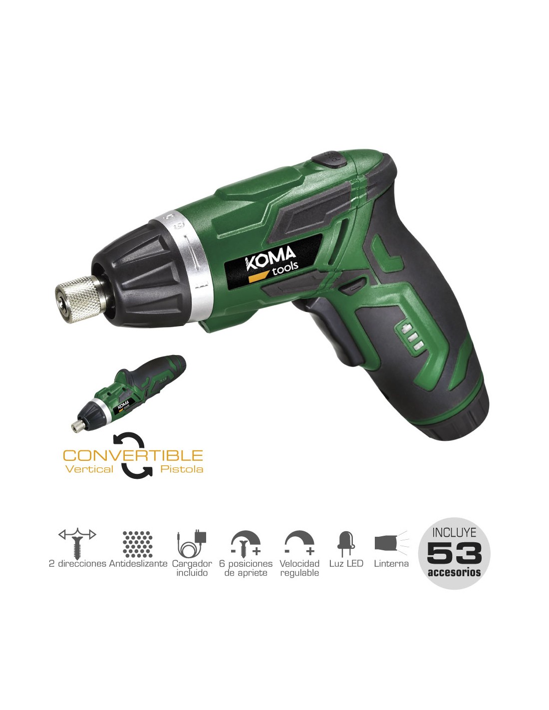 Atornillador a bateria 3,6 v litio 1300mah. con 53 accesorios. convertible vertical/pistola. dos direcciones de giro. antideslizante. cargador incluido. 6 posiciones de apriete. velocidad regulable. luz led, 3v-ar53, 175 x 148 mm