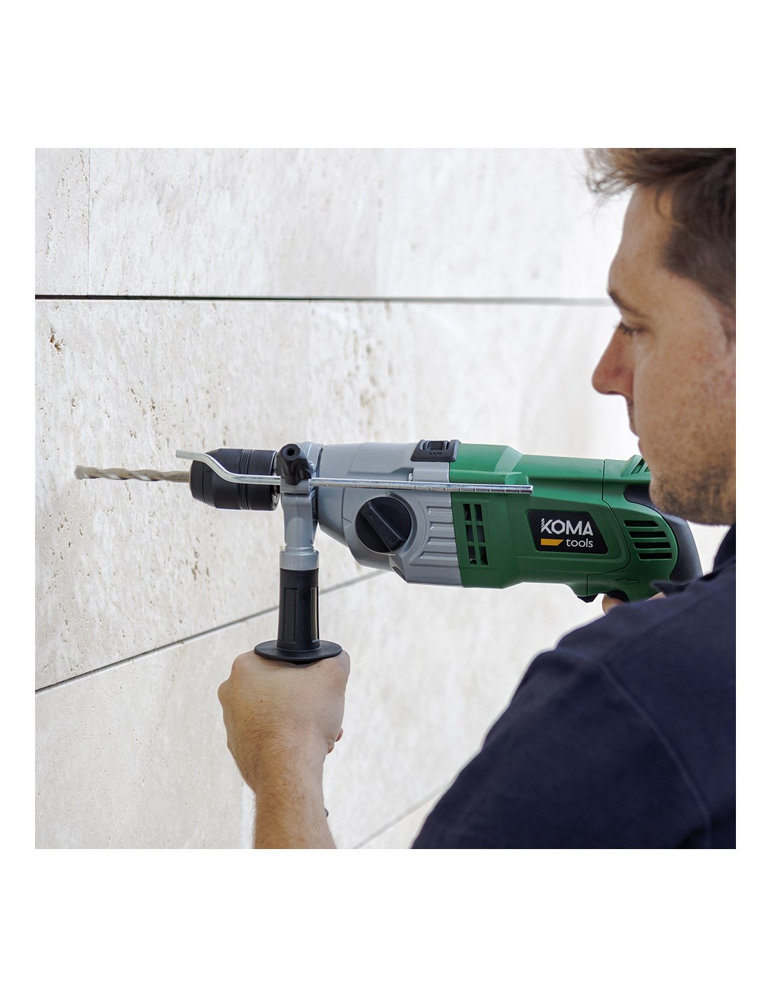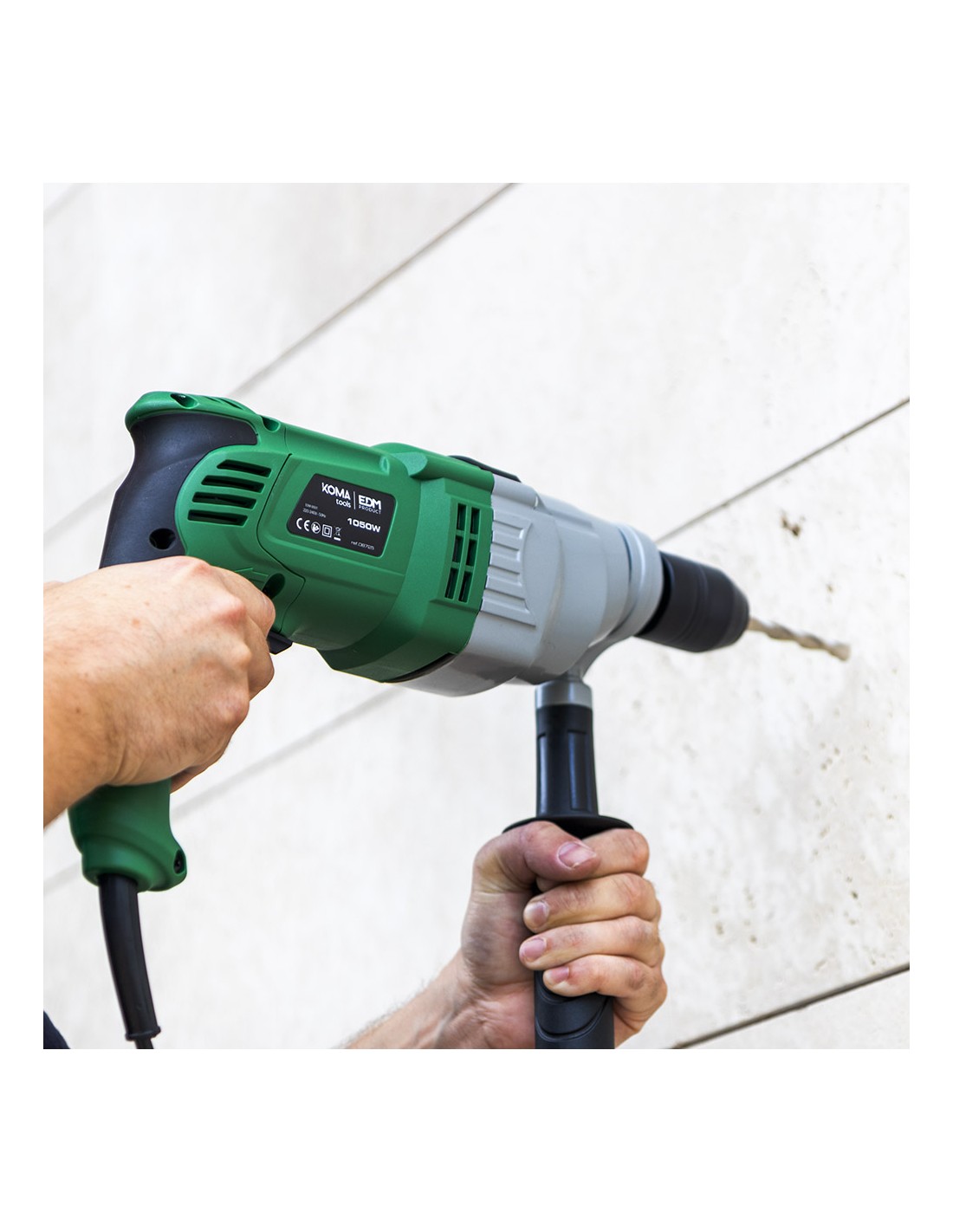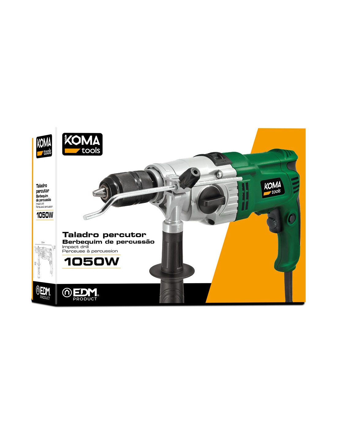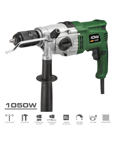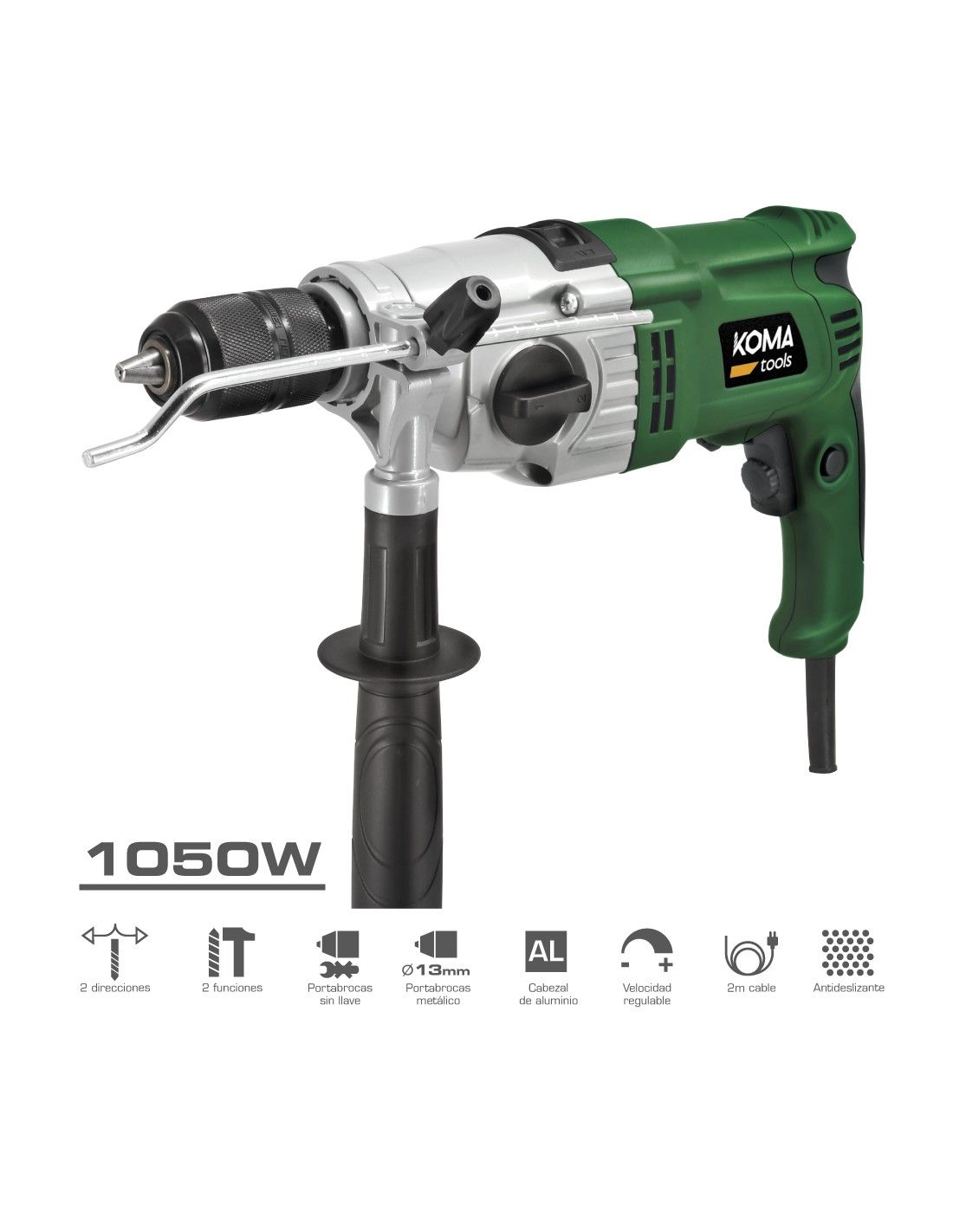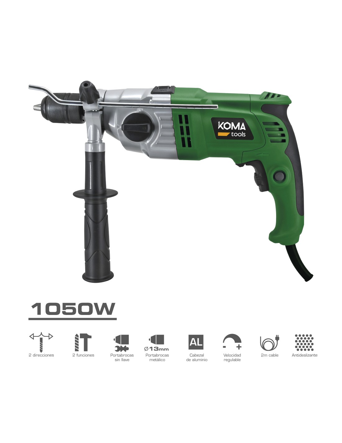 Taladro percutor eléctrico. poténcia: 1050w. con control de poténcia, portabrocas automático de ø13mm. mango ergonómico de tacto suave. mango adicional con varilla de profundidad. 2m de cable. velocidad variable de 0-1100 a 2800rpm, 220-240v 50hz, tp-1050, 130 x 390 x 260 mm