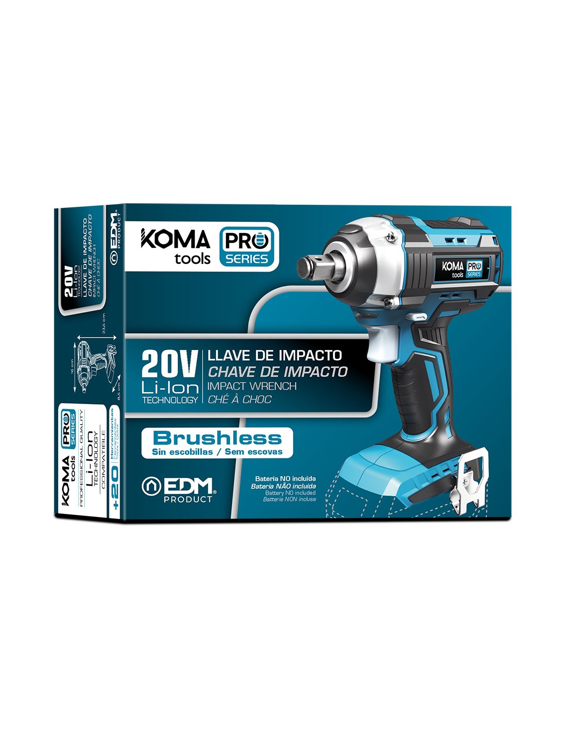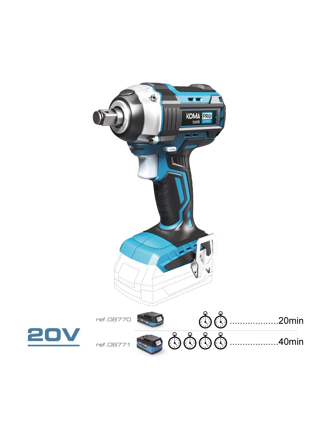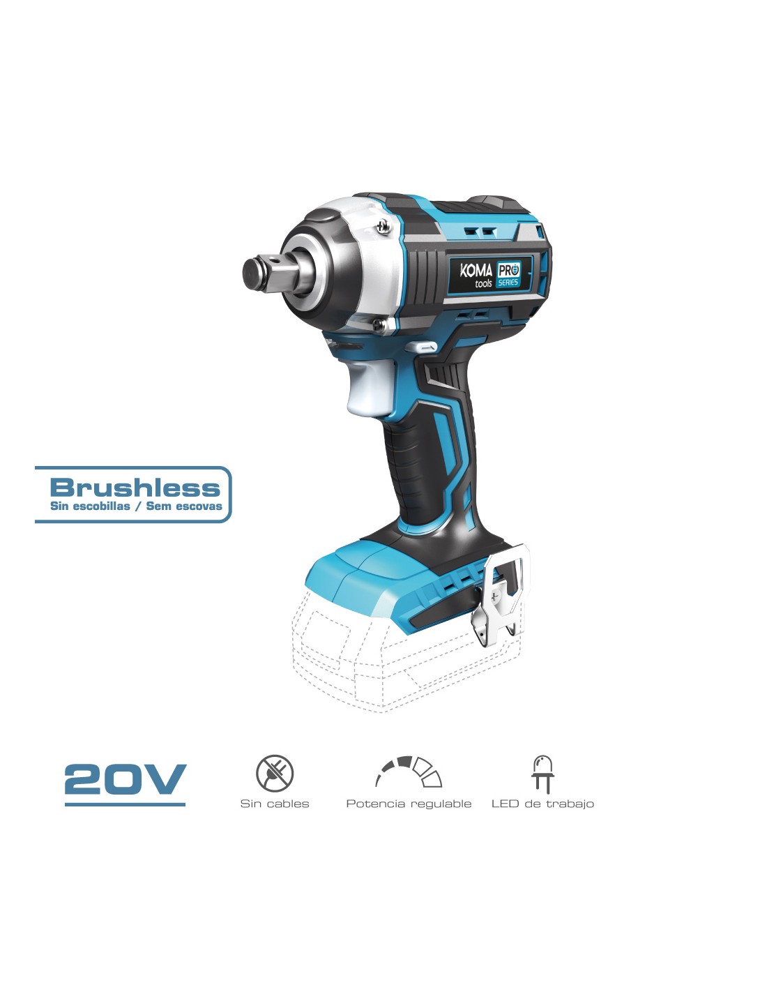 Llave de impacto 20 v brushless li-ion (sin batería ni cargador) portaherramientas 1/2. par de apriete 280nm. 0-2300rpm/0/3400ipm. clip para colgar. luz de trabajo. dimensiones: 16x23,5cm