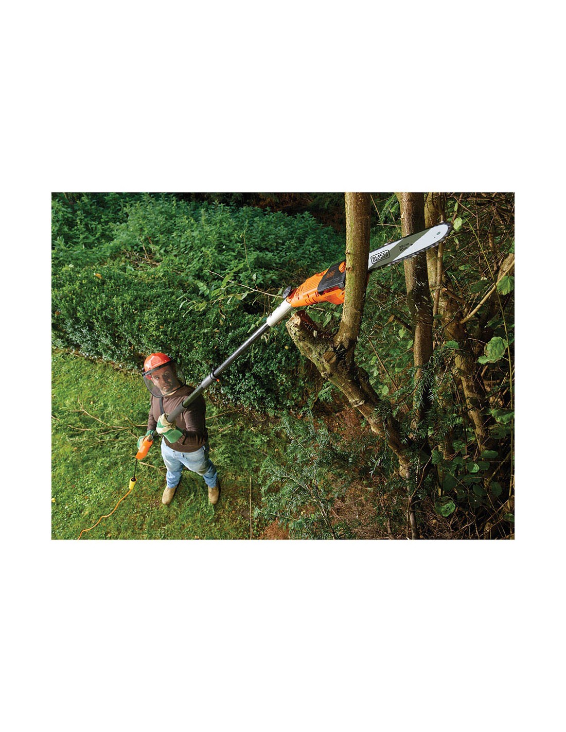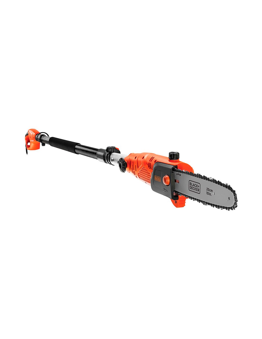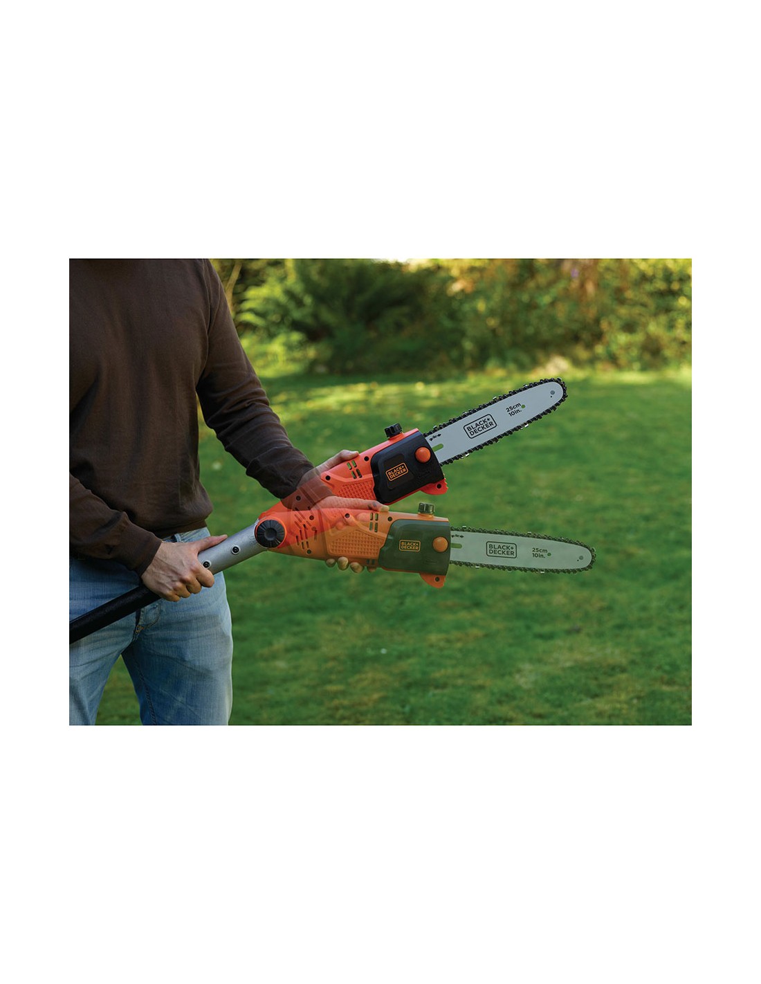 Sierra de pertiga 800w ps7525-qs black+decker. velocidad de cadena de 11m/s, para un corte rápido y efectivo. cadena de bajo retroceso para un corte suave y rápido en madera húmeda y seca. sistema de freno de cadena, cabezal giratorio. mayor alcance hasta 2,7m. 220-240v. vibracion 2,5m/s. 78db. longitud de espada 25cm.
