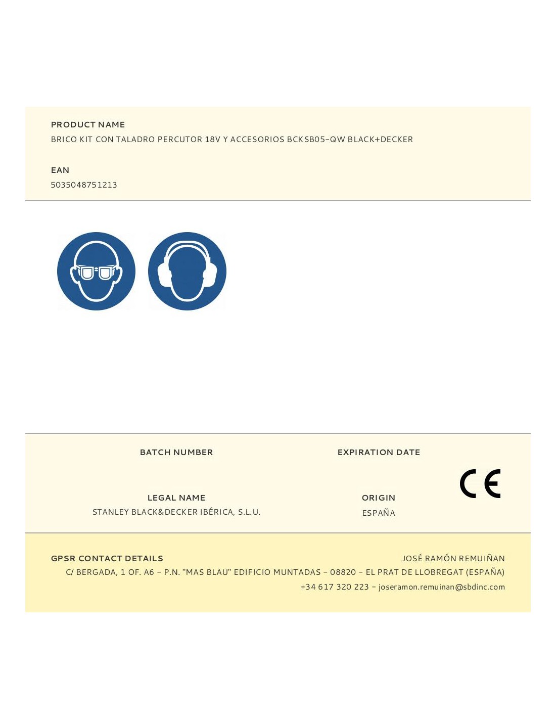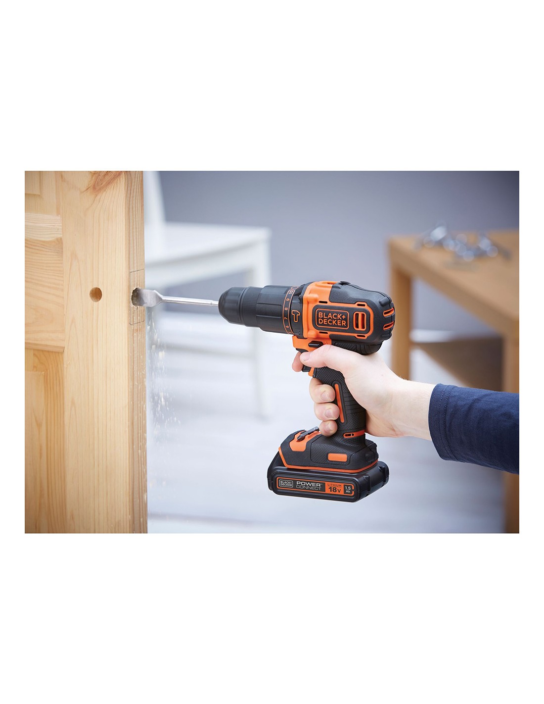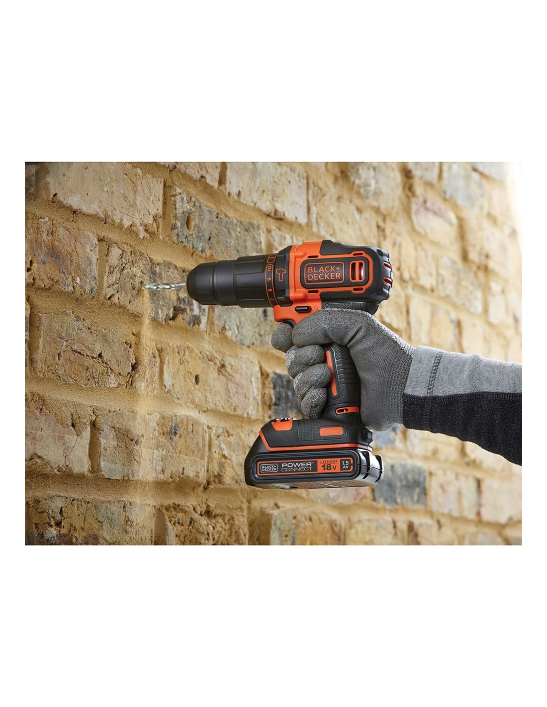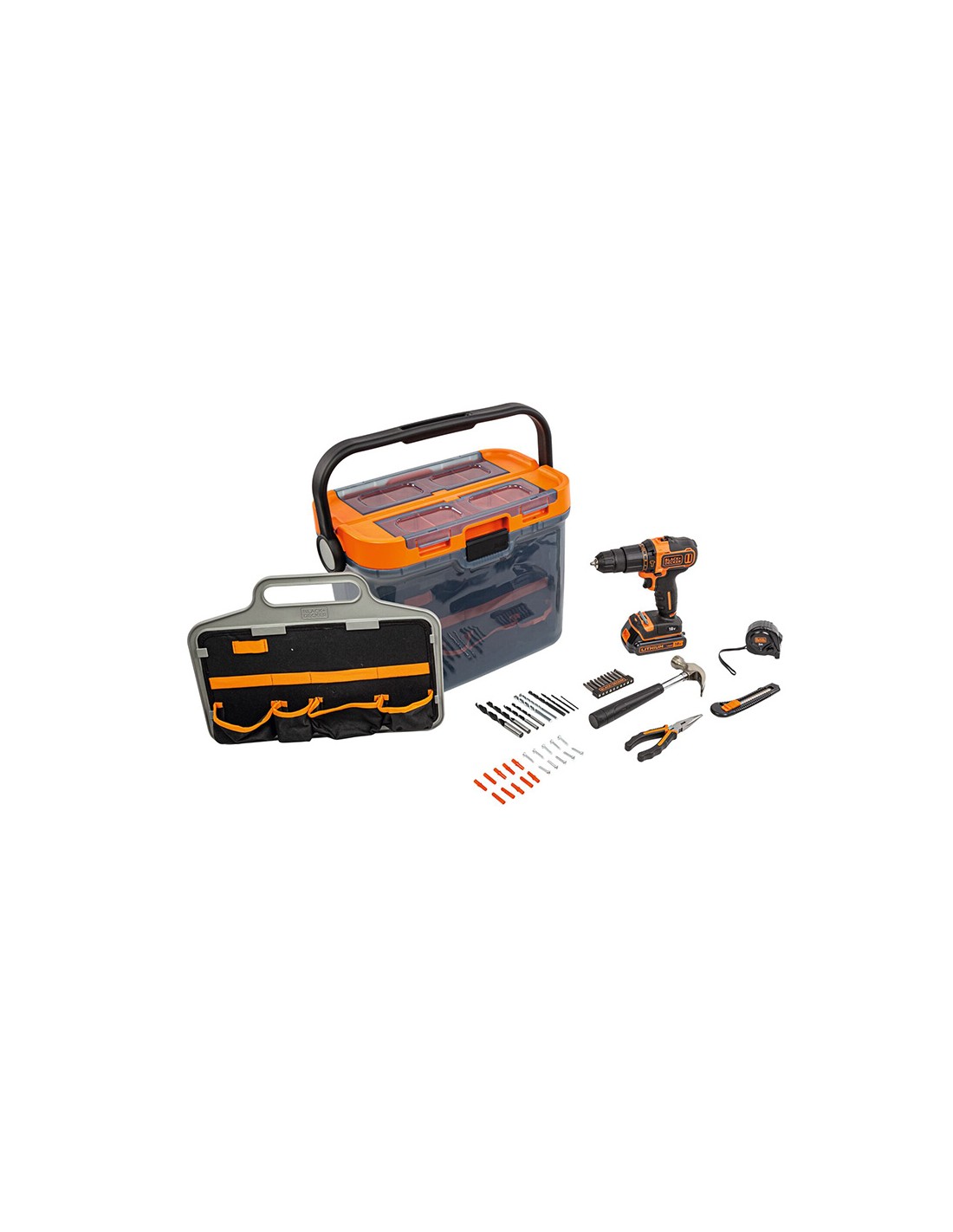 Brico kit con taladro percutor 18v y accesorios bcksb05-qw black+decker. con portabrocas 10mm, 10+1 posiciones de par de apriete, 2 velocidades 0-360/1400rpm, par máximo 40nm, impactos 21000ipm, incluye 1 bateria de 1,5ah de litio, cargador, 4 herramientas manuales (martillo, alicate de boca larga, cuter y flexometro, 40 accesorios (10 puntas para atornillar, 10 brocas y fijaciones)
