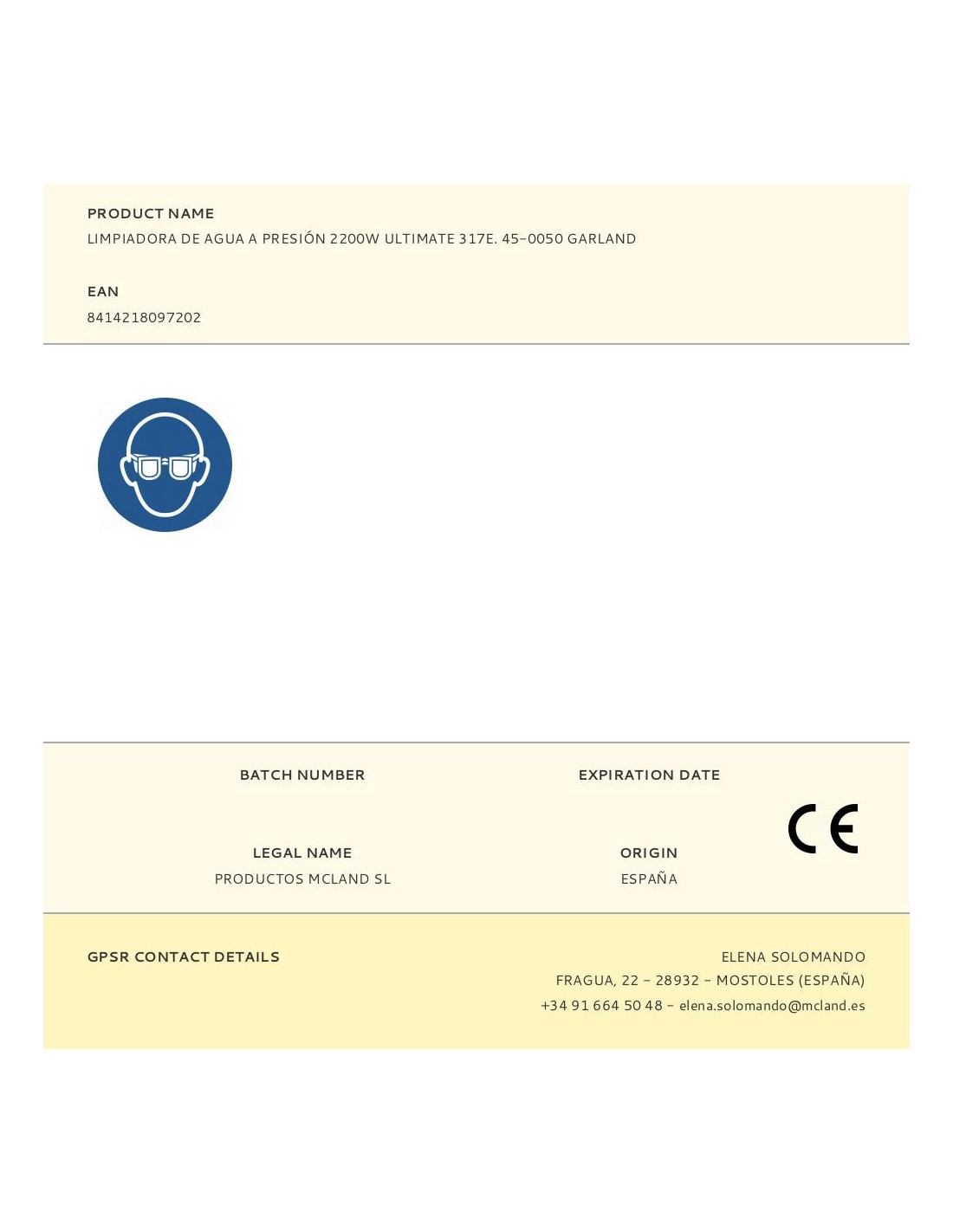 Limpiadora de agua a presión 2200w ultimate 317e. 45-0050 garland. motor eléctrico . voltaje 230v frec. 50hz . potencia 2,2kw. bomba acero caudal 450l/h. autoaspirante. presión máx. 170 bar incluye manguera de pvc de 8m, depósito de jabón, pistola con conector rápido, lanza regulable, lanza rotativa y cepillo temp. máx. entrada de agua 45°c. medidas 86x36x33cm. peso 8,9kg.
