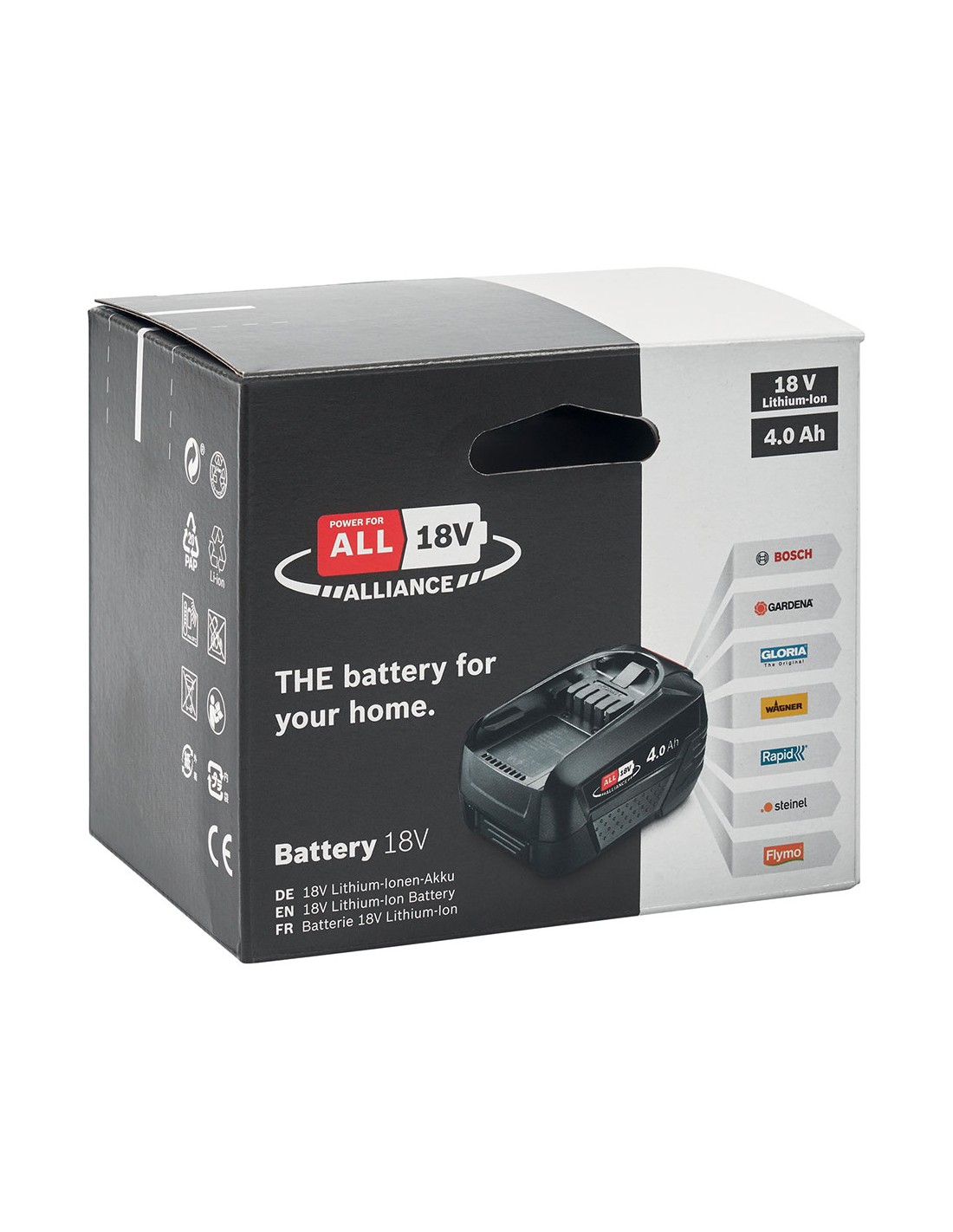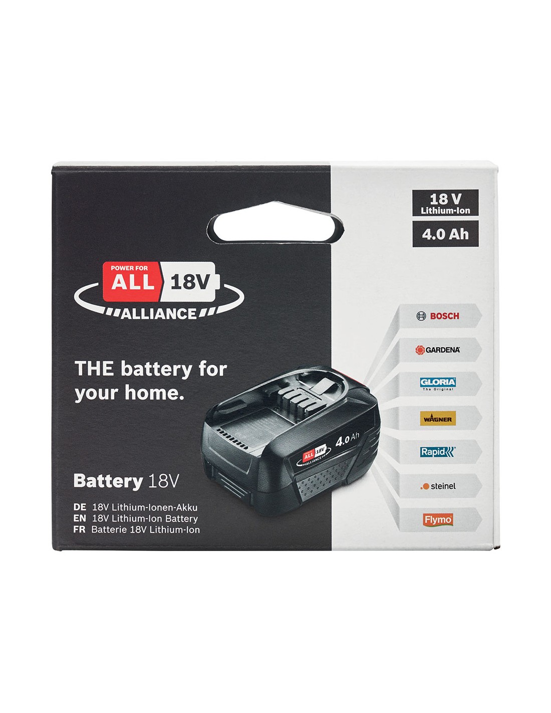 Batería 4ah bosch p4a 5001519. con una capacidad de 4,0ah, esta batería power for all 18v mantendrá cualquier herramienta en funcionamiento durante el tiempo suficiente para realizar una amplia gama de trabajos de bricolaje con una sola carga. compatible con marcas: bosch, gardena, gloria, wagner, rapid, steinel, flymo. tiene el equilibrio perfecto en cuanto a peso y tiempo de funcionamiento. las celdas de iones de litio del interior de la batería pueden cargarse rápidamente sin efecto memoria para una larga duración de la batería. 8,5x10,4x11,9cm
