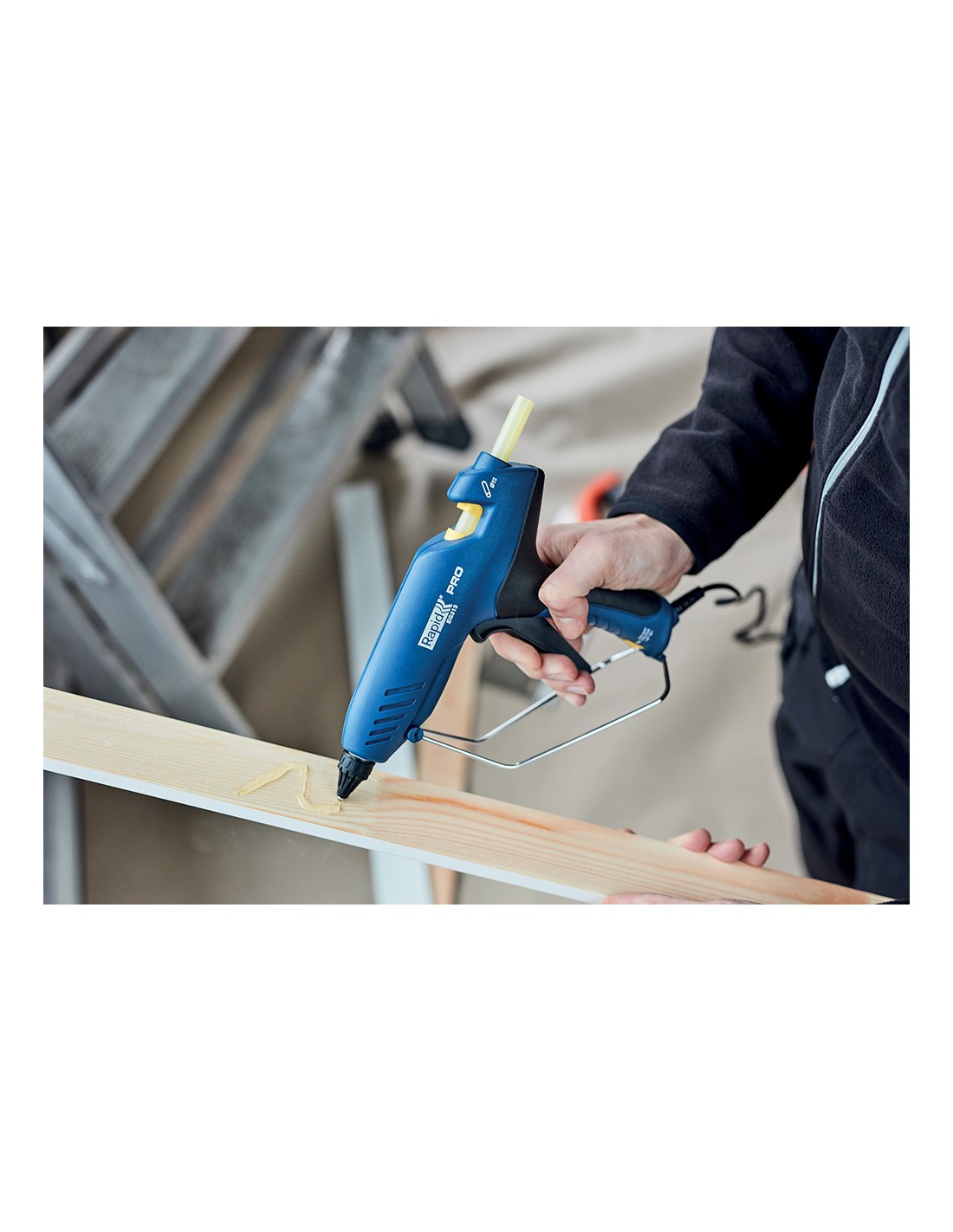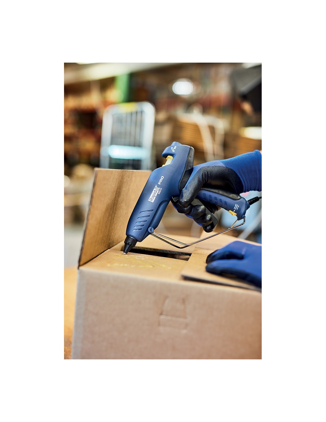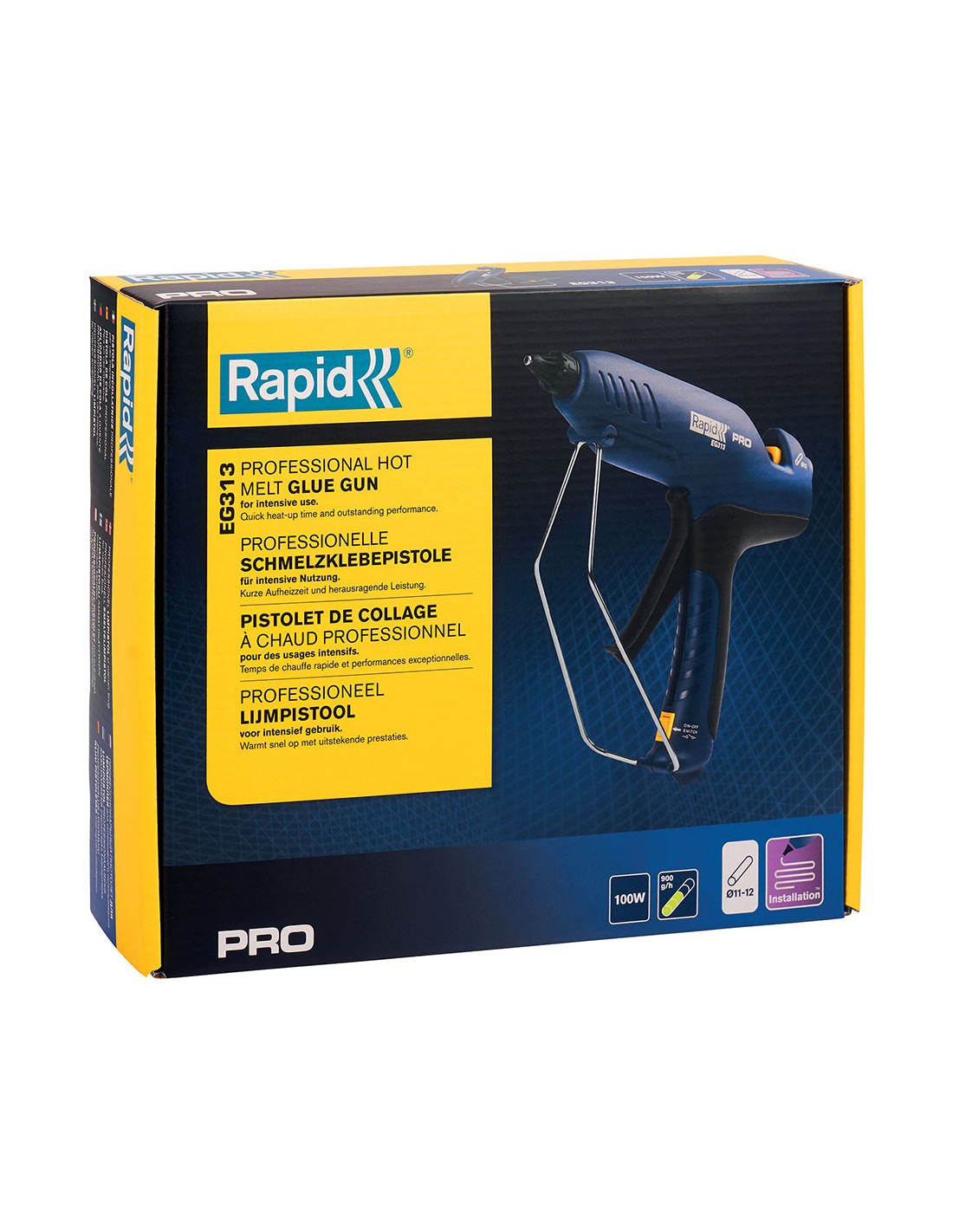 Pistola de cola pro eg313 100w 5001490 rapid. pistola de cola profesional, compacta y práctica con un alto rendimiento y un tiempo de calentamiento de sólo 3 minutos. cómoda de manejar, bien equilibrada y diseñada para trabajar con precisión incluso cuando se trabaja intensamente, la eg313 se suministra con un soporte fijo estable y una boquilla reemplazable. ofrece una producción de cola de 900g/h y cuenta con un control de temperatura autorregulado de 195°c. 23,5x6,5x28,5cm