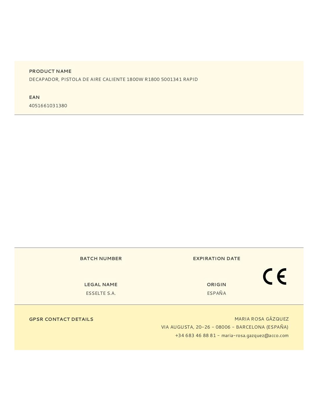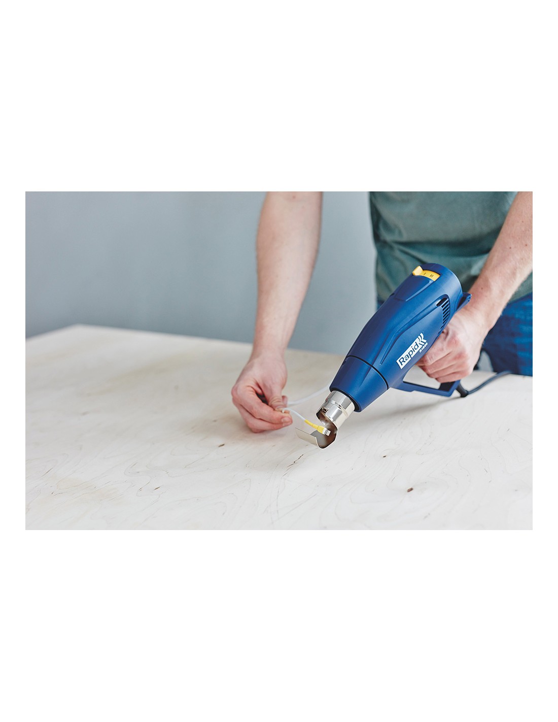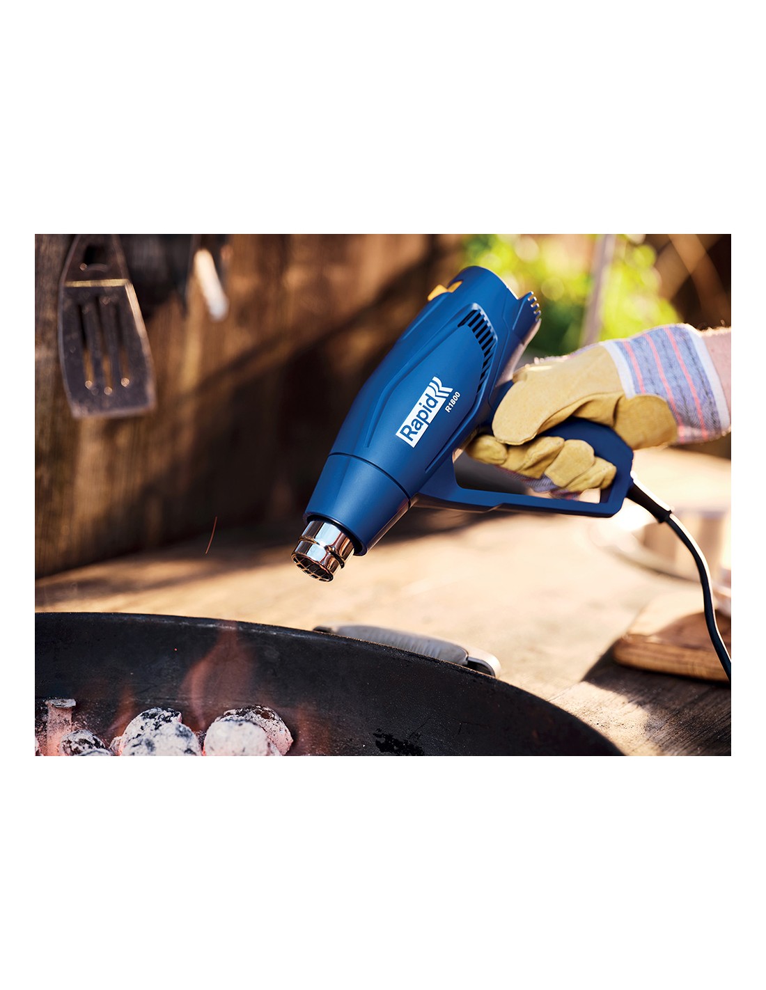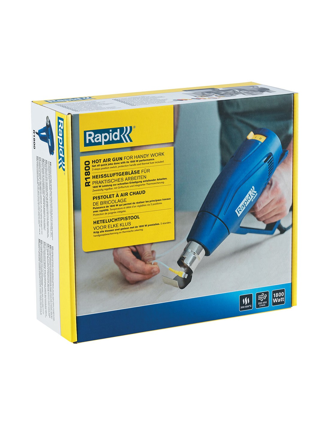 Decapador, pistola de aire caliente 1800w r1800 5001341 rapid. la r1800 es una pistola de aire caliente sencilla y práctica creada especialmente para tareas como descongelar, encerar esquís y tablas de snowboard, desbrozar un camino pavimentado y muchas otras tareas cotidianas en el hogar, el jardín o el garaje. con 1800w de potencia, dos posiciones de regulación de temperatura (300°c y 550°c) y flujo de aire ajustable, la r1800 realiza el trabajo rápidamente y con precisión. 25,3x10x29cm