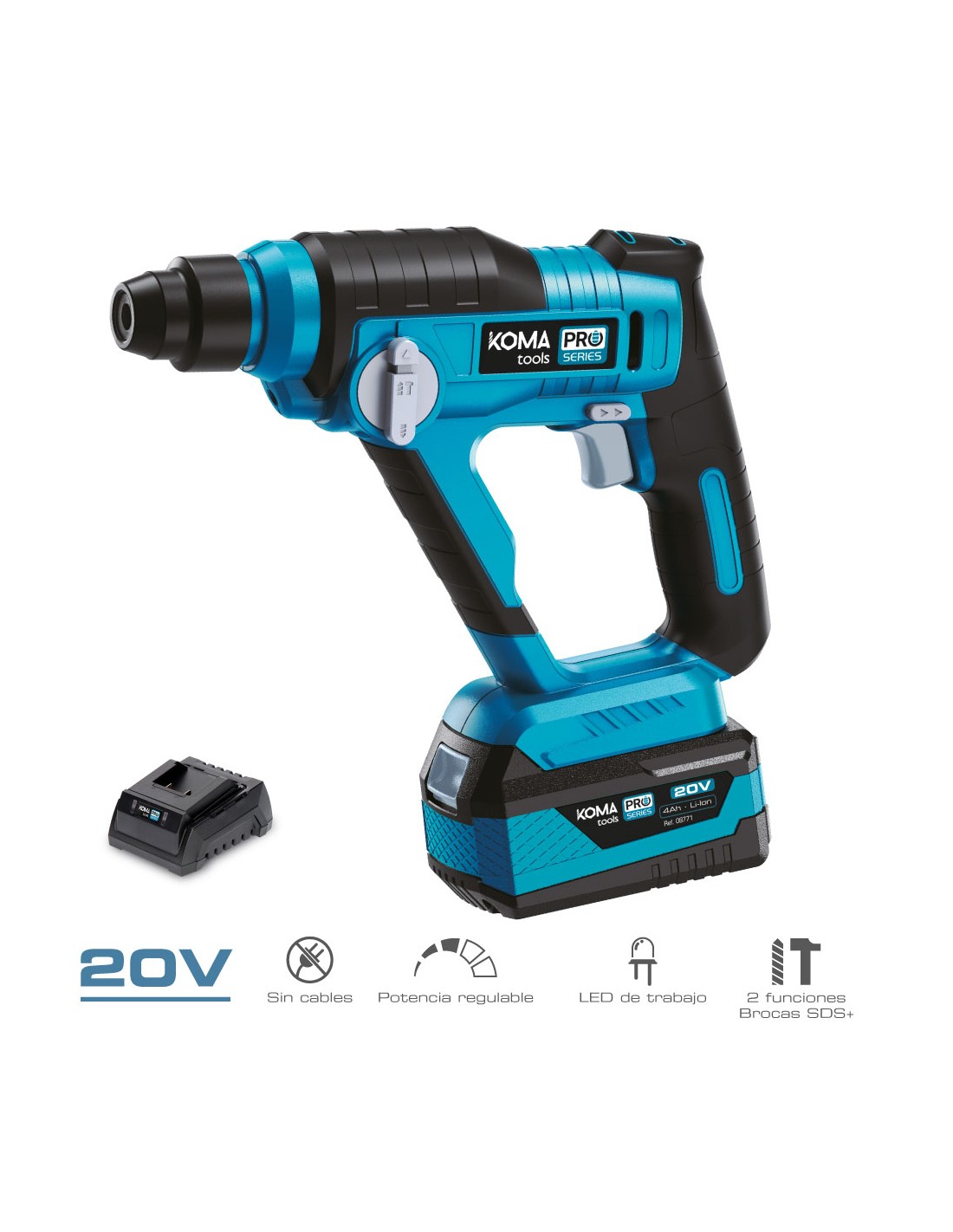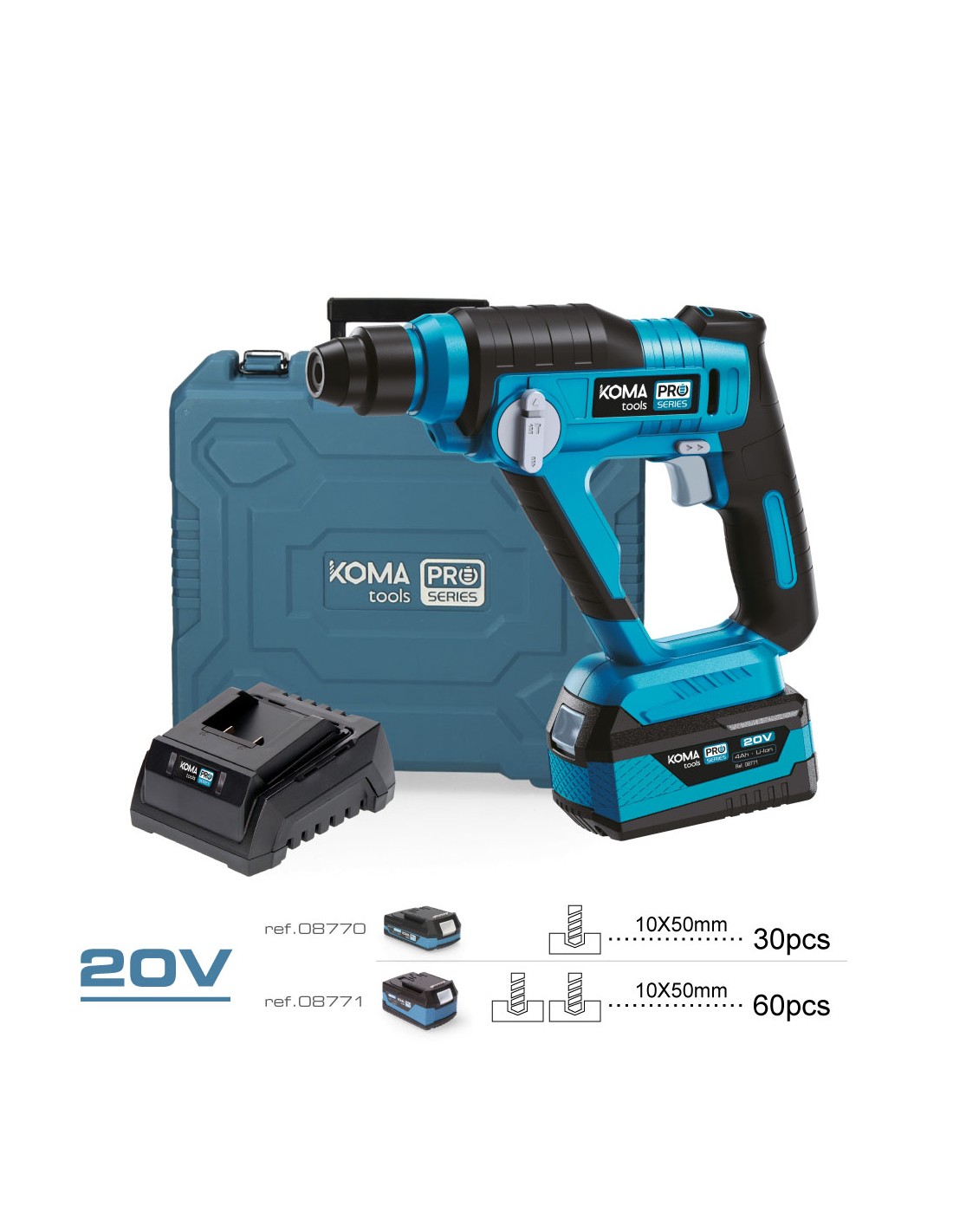 Kit maletin con martillo percutor 20 v, batería y cargador con dos tipos de función taladro/ taladro + percutor, diseño ergónomico y compacto. maletín de transporte incluido. velocidad 0-850 rpm percusión 0-5000 ipm. bateria incluida 1 x 4,0 ah luz de trabajo y portabrocas sds plus. fuerza de impacto 1,3 julios. 20v-mpc-k