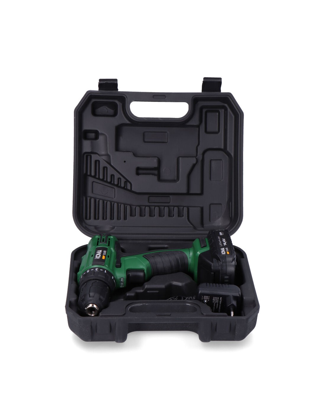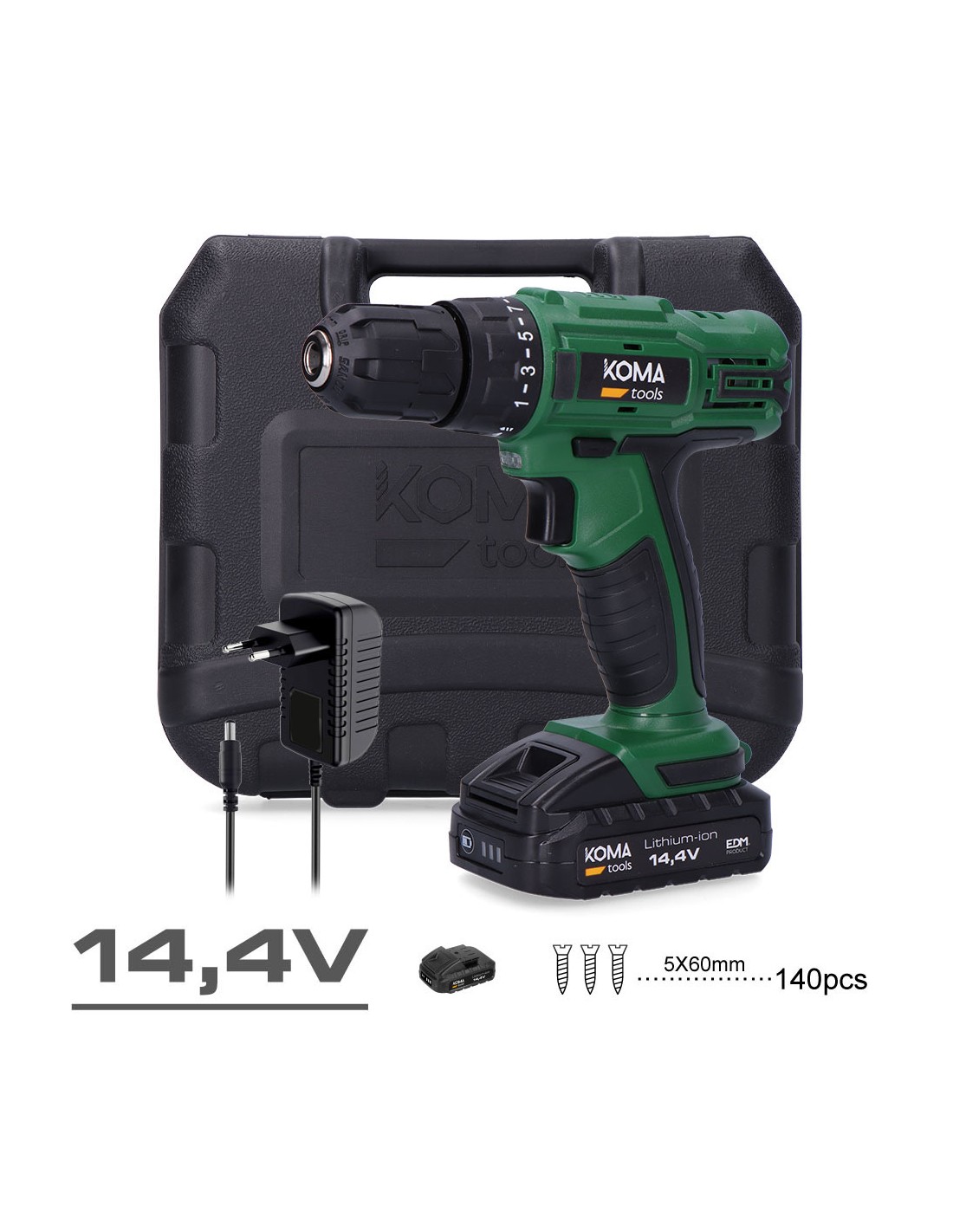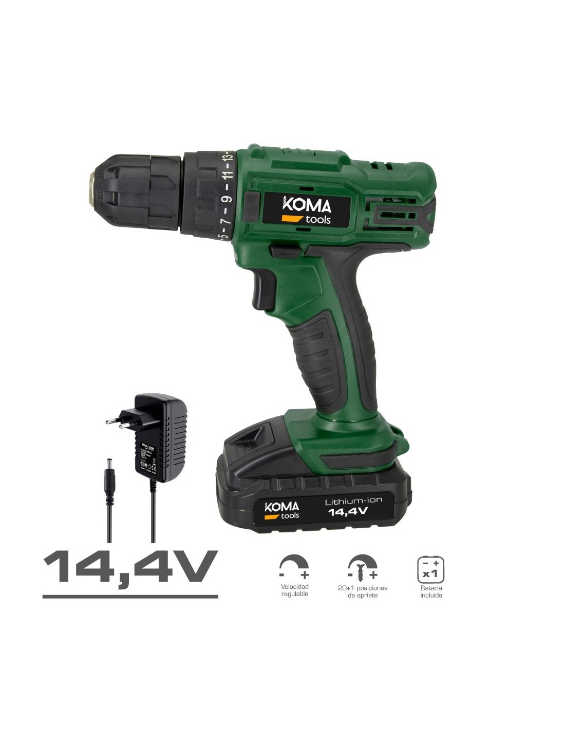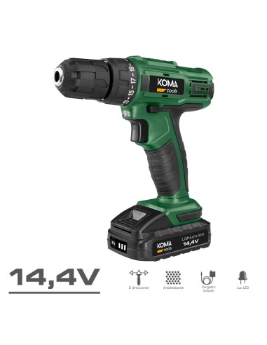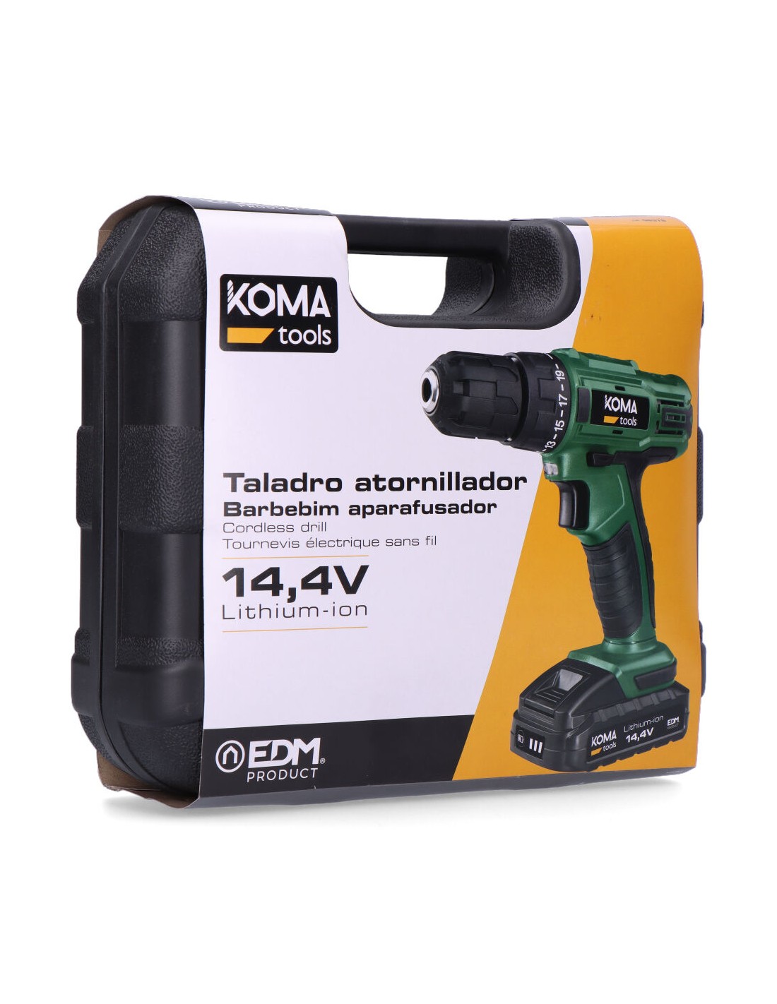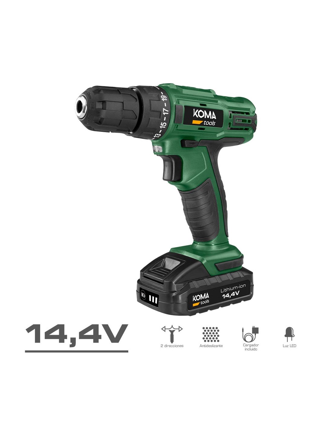 Maletín con taladro atornillador a batería 14.4 v 1.500 mah. velocidad variable de 0-700 rpm. 19 posiciones de apriete ajustable (máx. 18 nm). potencia regulable, portabrocas automático de ø10mm. rotación izquierda/derecha. luz led para iluminar zona de trabajo. incluye maletín de transporte. incluye batería y cargador