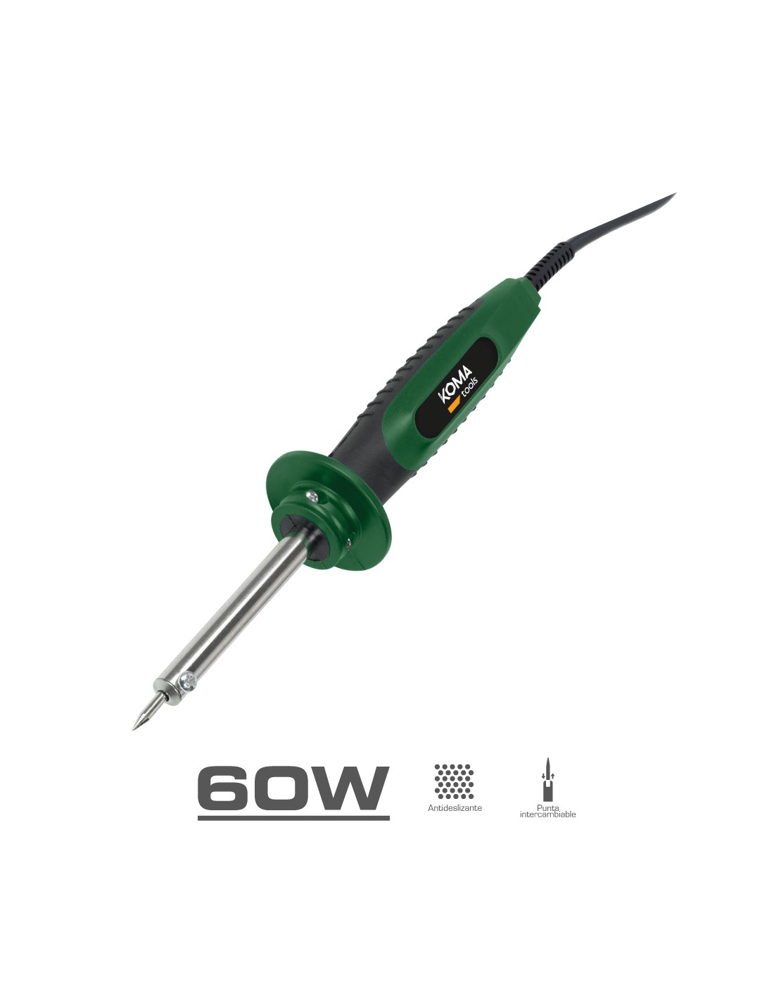 Soldador 60w 230v, punta de 5,8 mm, temperatura máxima 500°c, tiempo de calentado 90 segundos aprox, empuñadura suave, 1,3 m cable. s-60