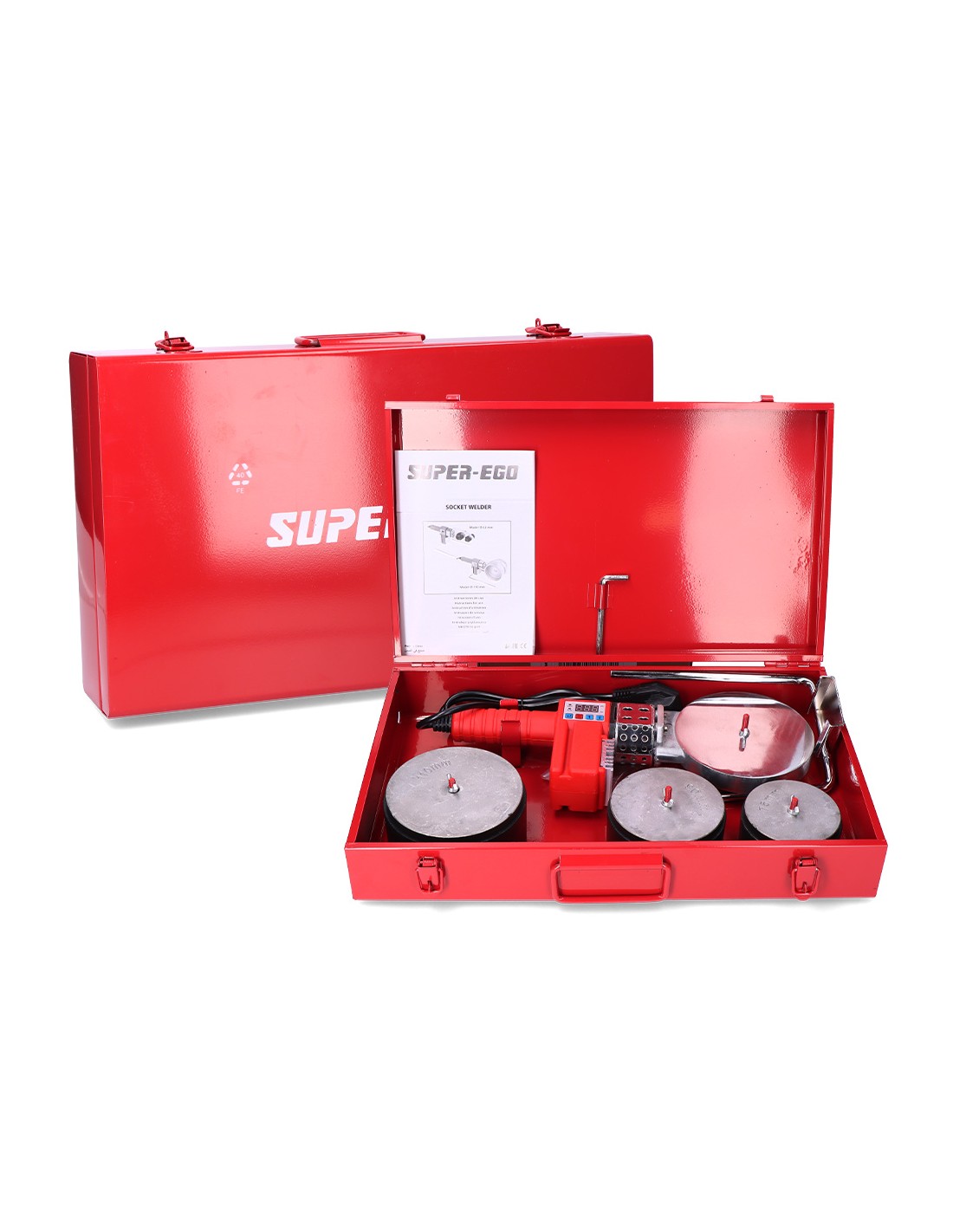 Polifusor para ppr 75-90-110mm 230v 1500000449 super ego. polifusor electrónico con regulación de temperatura para tuberías y accesorios de plástico diseñado para soldar tuberías y accesorios de pe, pp, pb y pvdf, tanto en taller como en obra. panel de control y regulación electrónico. ø75, 90 y 110mm. aplicación: pe, pp, pb y pvdf. voltaje 110v/50-60 hz - 230v/50-60 hz. potencia: 800w. botón on/off. cámara aislante del elemento calefactor de la empuñadura. disipador de calor del conjunto electrónico. soporte para posición de reposo.