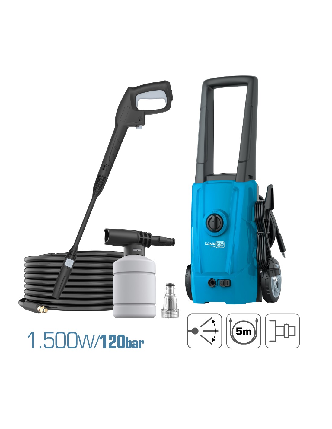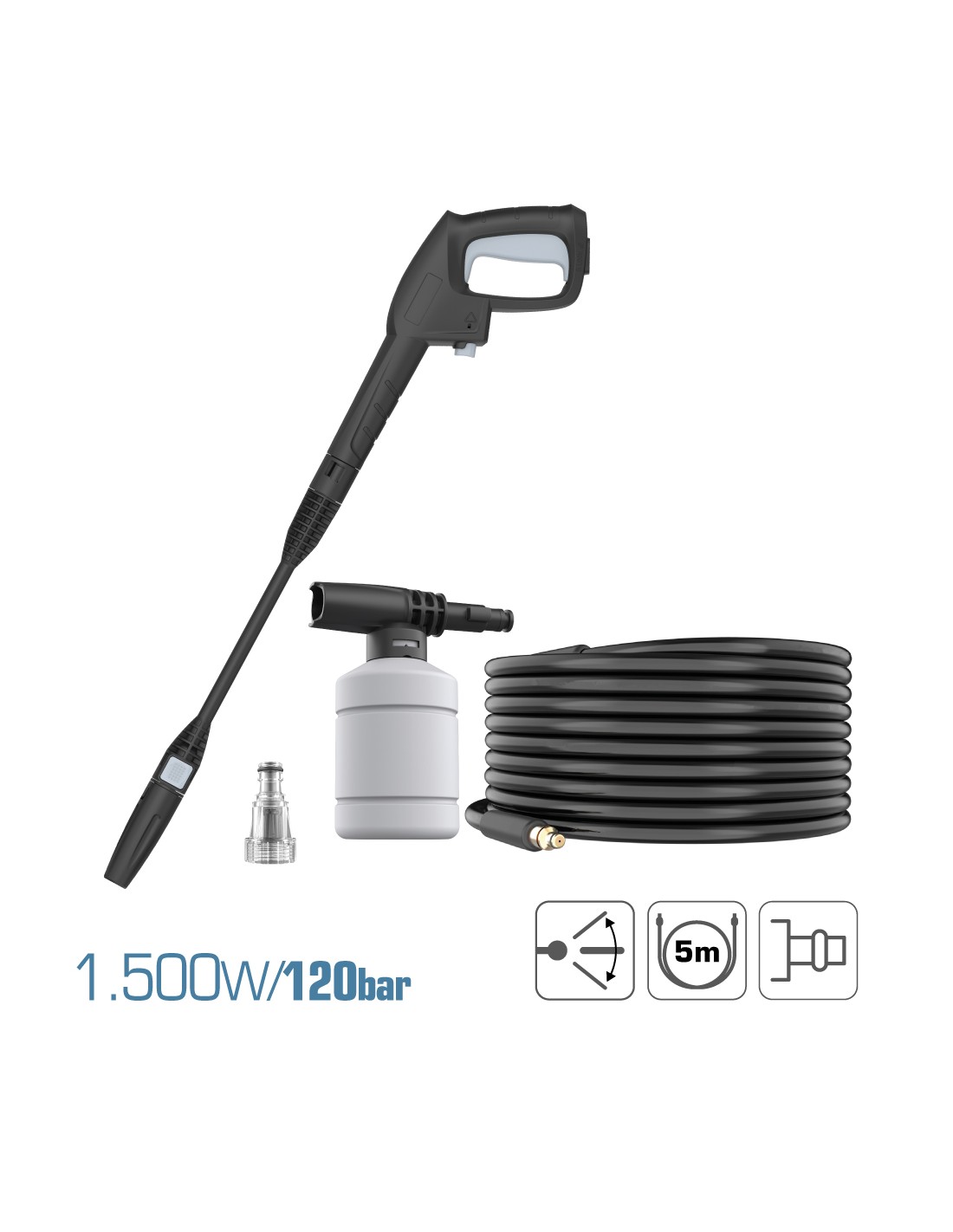 Hidrolimpiadora 1.500w 120 bar. presión nominal 80 bar. bomba de agua de aluminio. boquilla ajustable. control inteligente de la bomba de agua. manguera 5 m. conexión eléctrica 5 m. filtro agua. conexiones con cambio rapido. incluye accesorios: boquilla graduable + extension de lanza + manguera y pistola ergonomica + depósito de jabón. 220-240v, hl-1500, dimensiones: 23,5 x 27 x 67,8 cm