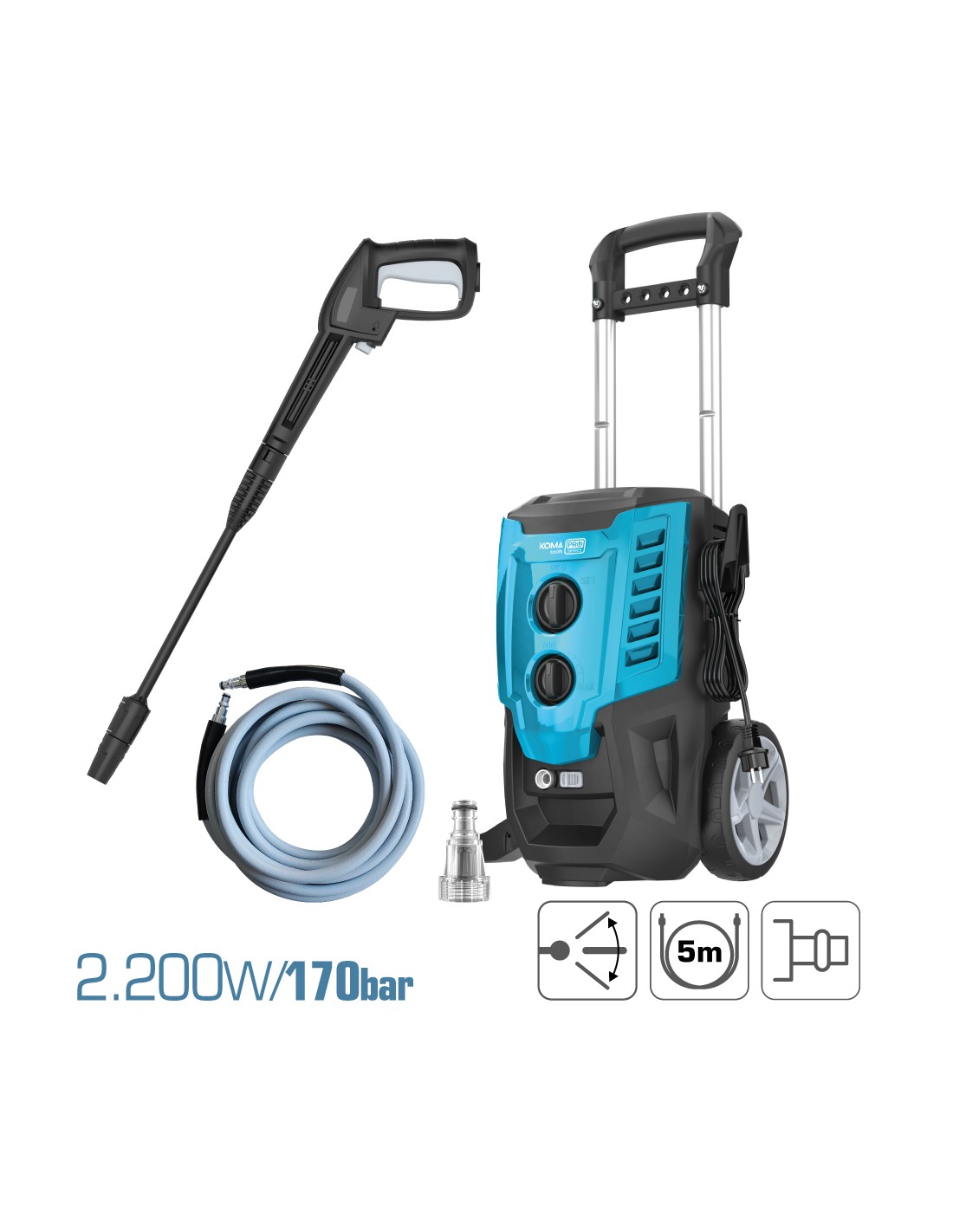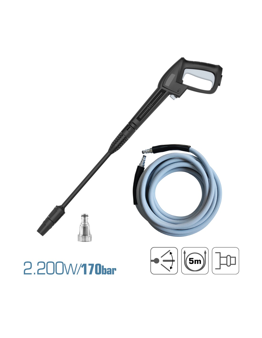 Hidrolimpiadora 2.200 w 170bar. presión nominal 120bar. caudal 390 l/h. bomba de agua de aluminio. boquilla ajustable. control inteligente de la bomba de agua. manguera de tpu de 5 m. conexión eléctrica 5 m. filtro agua. conexiones con cambio rapido. incluye accesorios: boquilla graduable + extension de lanza + manguera y pistola ergonomica + depósito de jabón. 220-240v 50~60 hz. hl-2200, dimensiones: 36,6 x 36 x 90,2cm