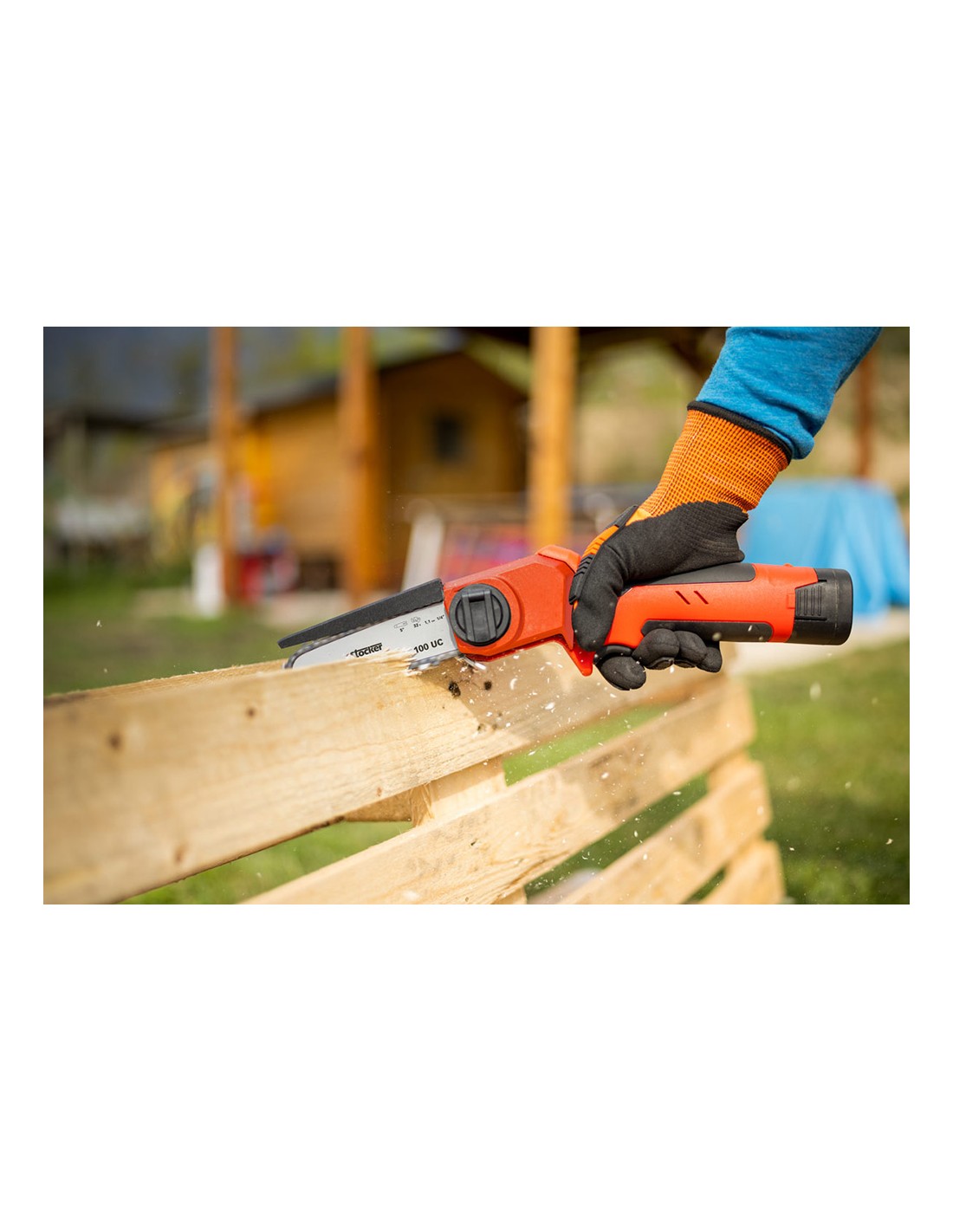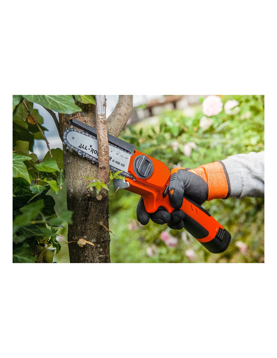La motosierra all-rounder e-100 uc es una herramienta versátil y excelente para todas las situaciones de bricolaje. un peso de sólo 940g, batería incluida, y una longitud de 38cm, la motosierra all-rounder e-100 uc alcanza una velocidad de corte de 10 m/s y es eficaz hasta diámetros de hasta 90mm. la motosierra all-rounder e-100 uc también dispone de tensado automático de cadena, tiene una autonomía de 90-120 cortes con un diámetro medio de 6cm gracias a la batería de 2,0 ah / 16,8 v. el paquete se completa con una batería de iones de litio, el cargador de doble batería, una botella vacía de transferencia de aceite y el manual de instrucciones. especificaciones técnicas peso con batería: 940g
