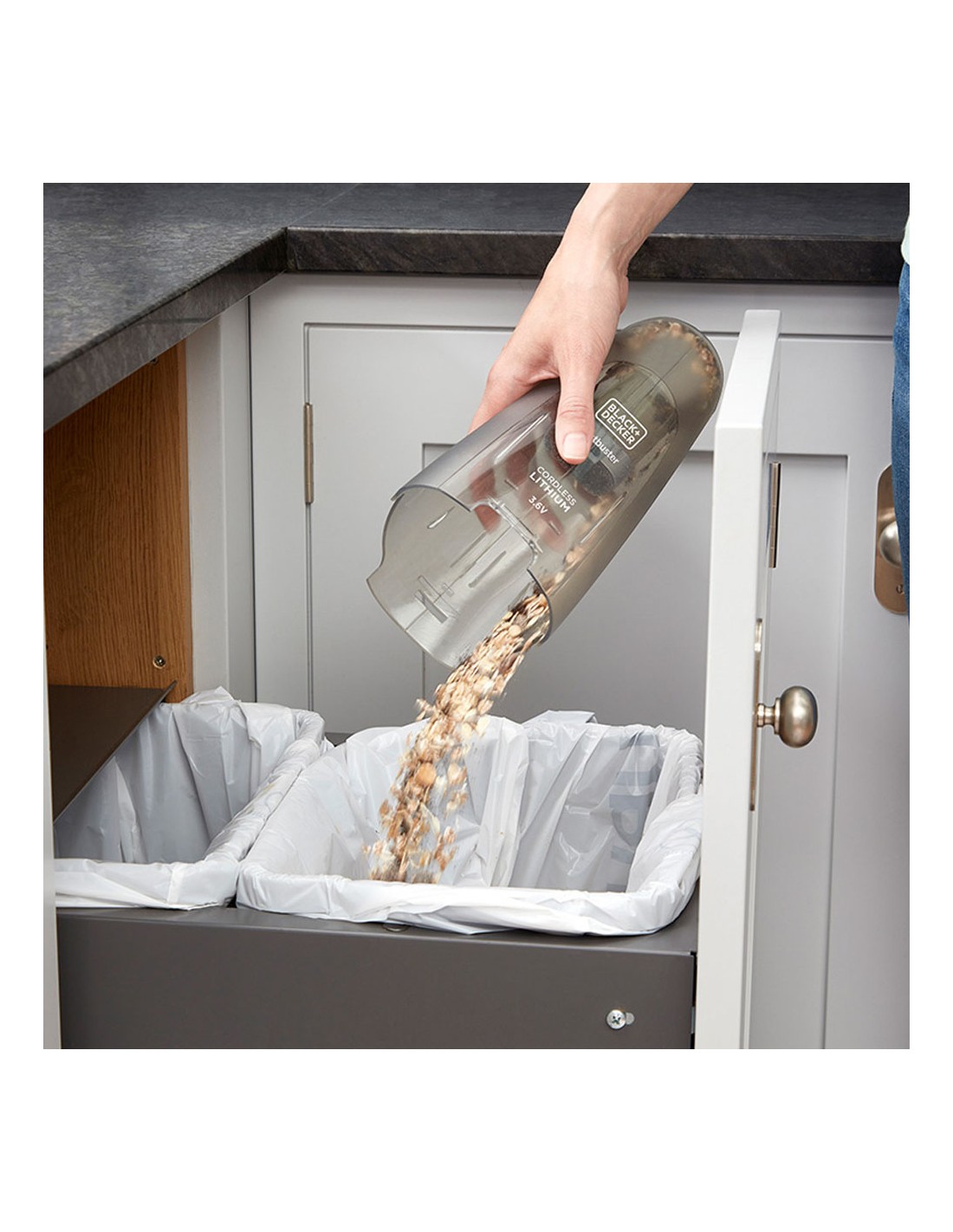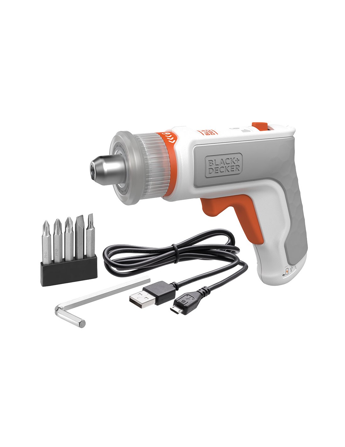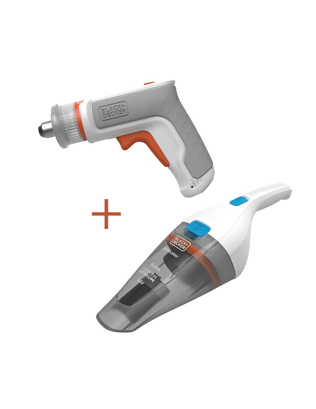 Kit: atornillador hexdriver 3,6v + aspirador de mano 3,6v bcknvcrta01-qw black & decker potencia 3,6v, par máximo 5,5nm, porta-accesorios universal, velocidad 180rpm, batería integrada de 1,5ah, luz led, sujeción magnética de los accesorios. incluye 5 puntas para atornillar, llave hexagonal y cable micro-usb + aspirador de mano 3,6v sin accesorios. potencia 3,6v y batería 1,5a litio.