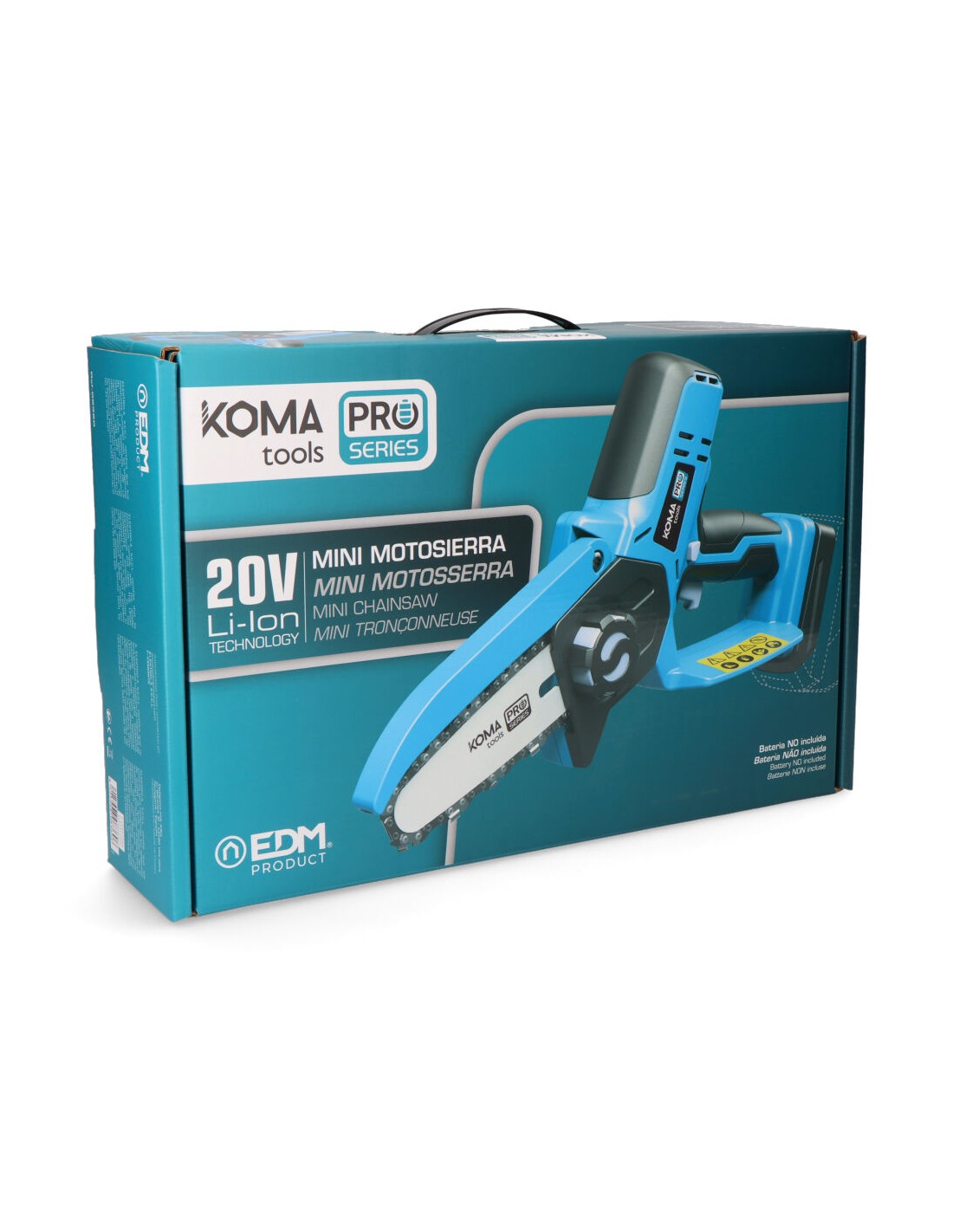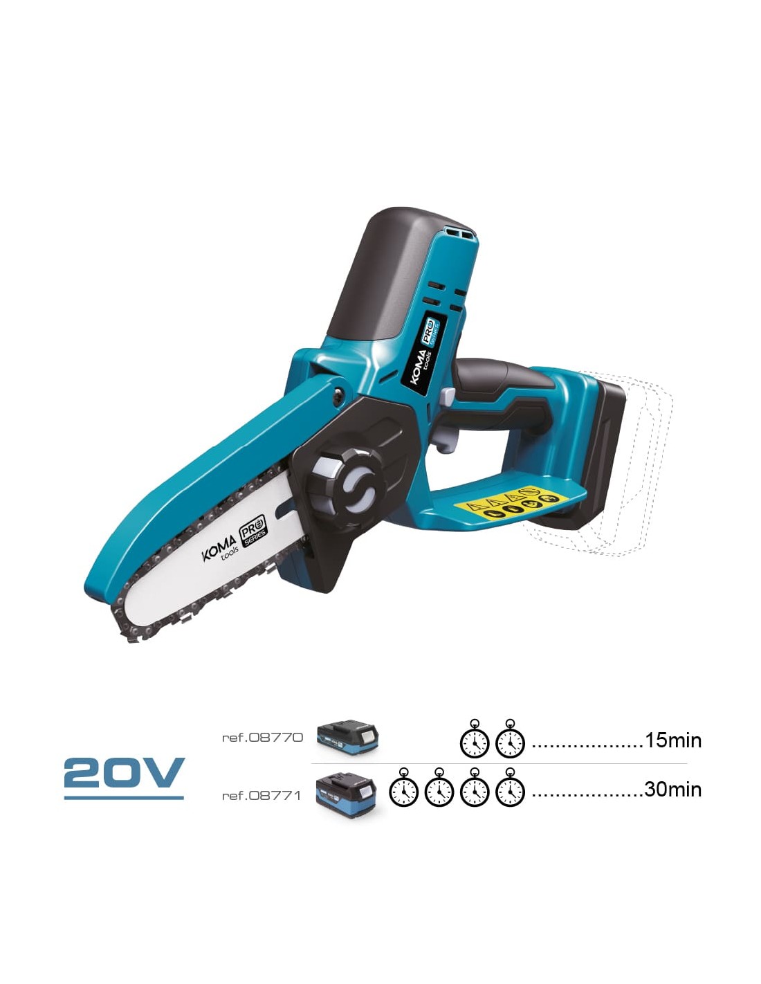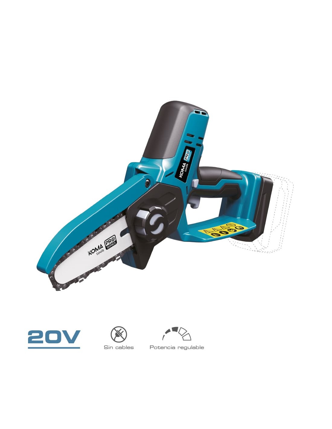 Mini motosierra 20 v, con botón de desbloqueo, tensado sin herramientas, longitud de espada 4(101mm), con 26 eslabones. velocidad en relentí 4,8m/s, nivel de presión sonora lpa, 78db(a), k3db(a). vibración 3,425m/s2,k1,5m/s2, velocidad 3200 rpm. sin deposito interior de aceite. bateria no incluida. 20v-mms. medidas: 35,5 x 8,3 x 23 cm