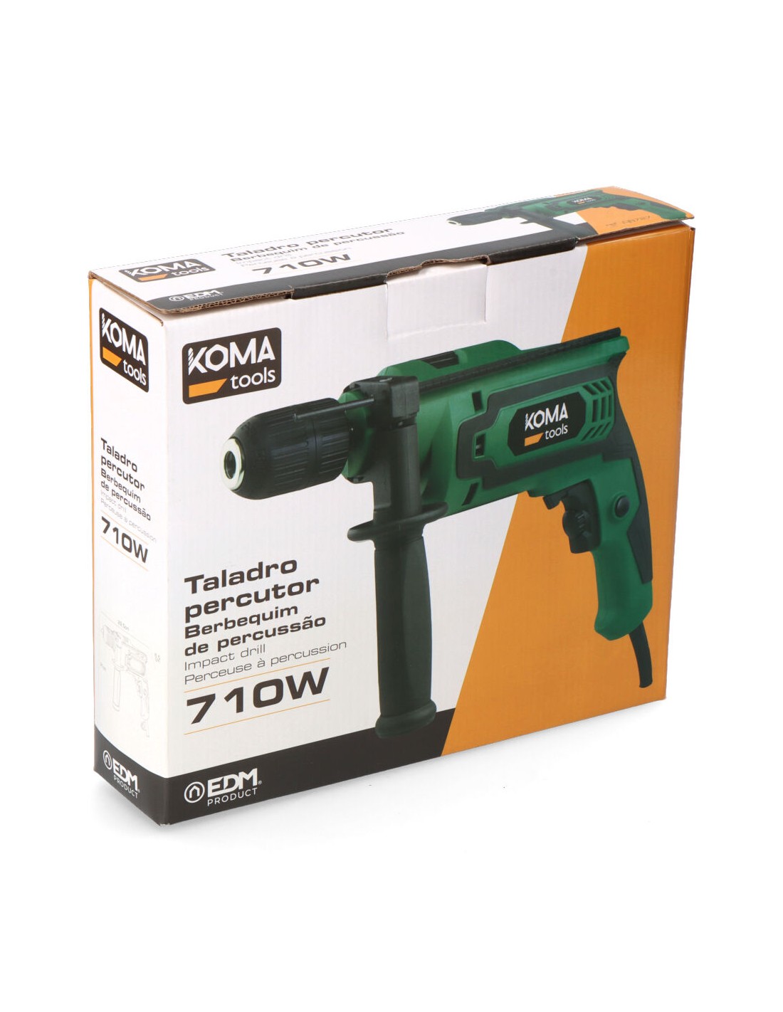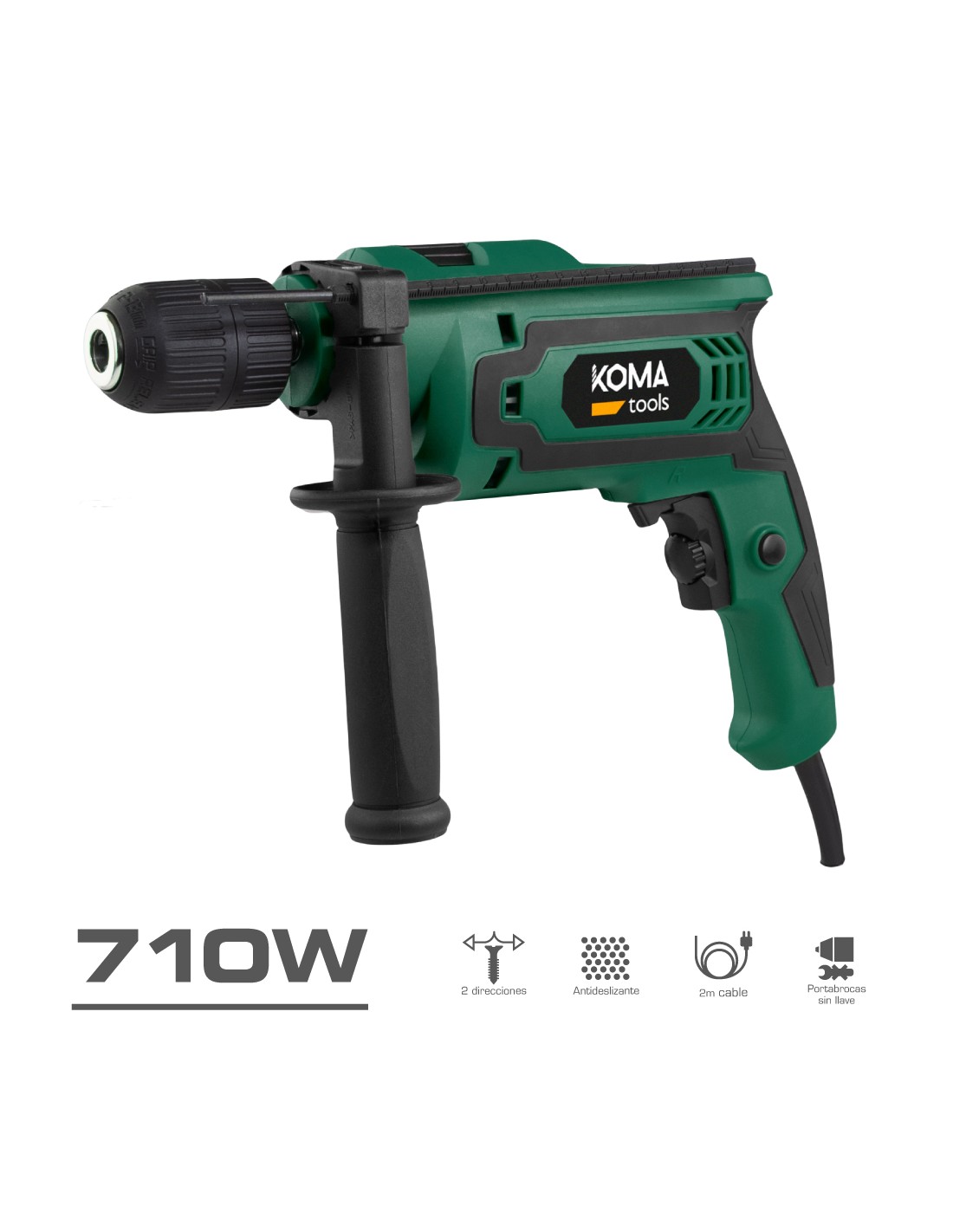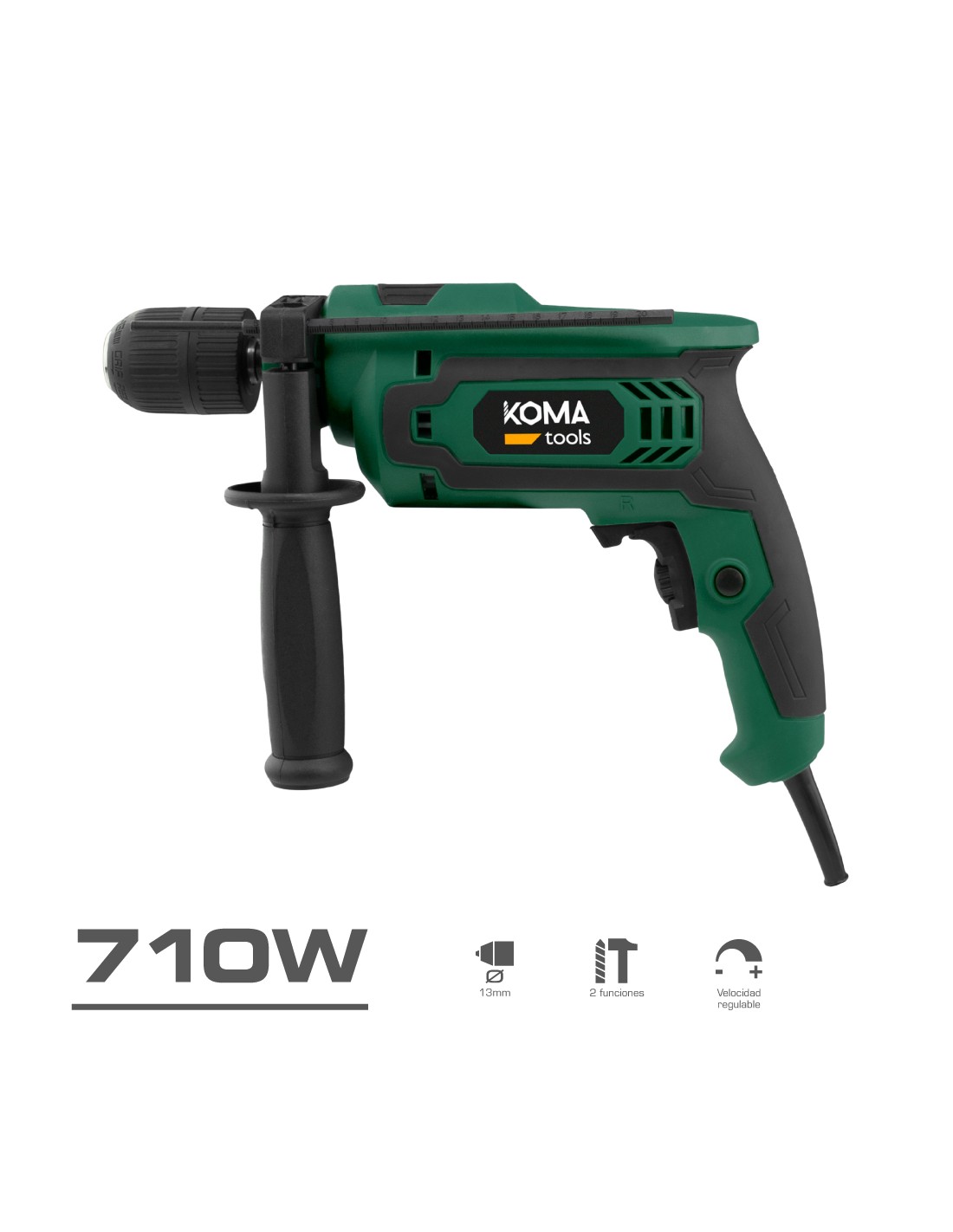 Taladro percutor, potencia: 710 w. velocidad regulable. 2 direcciones. 2 funciones (perforación/martillo). portabrocas sin llave de ø13 mm. mango antideslizante. 2 m de cable. 230-240v 50hz, tp-710, 295 x 65 x 210 mm.