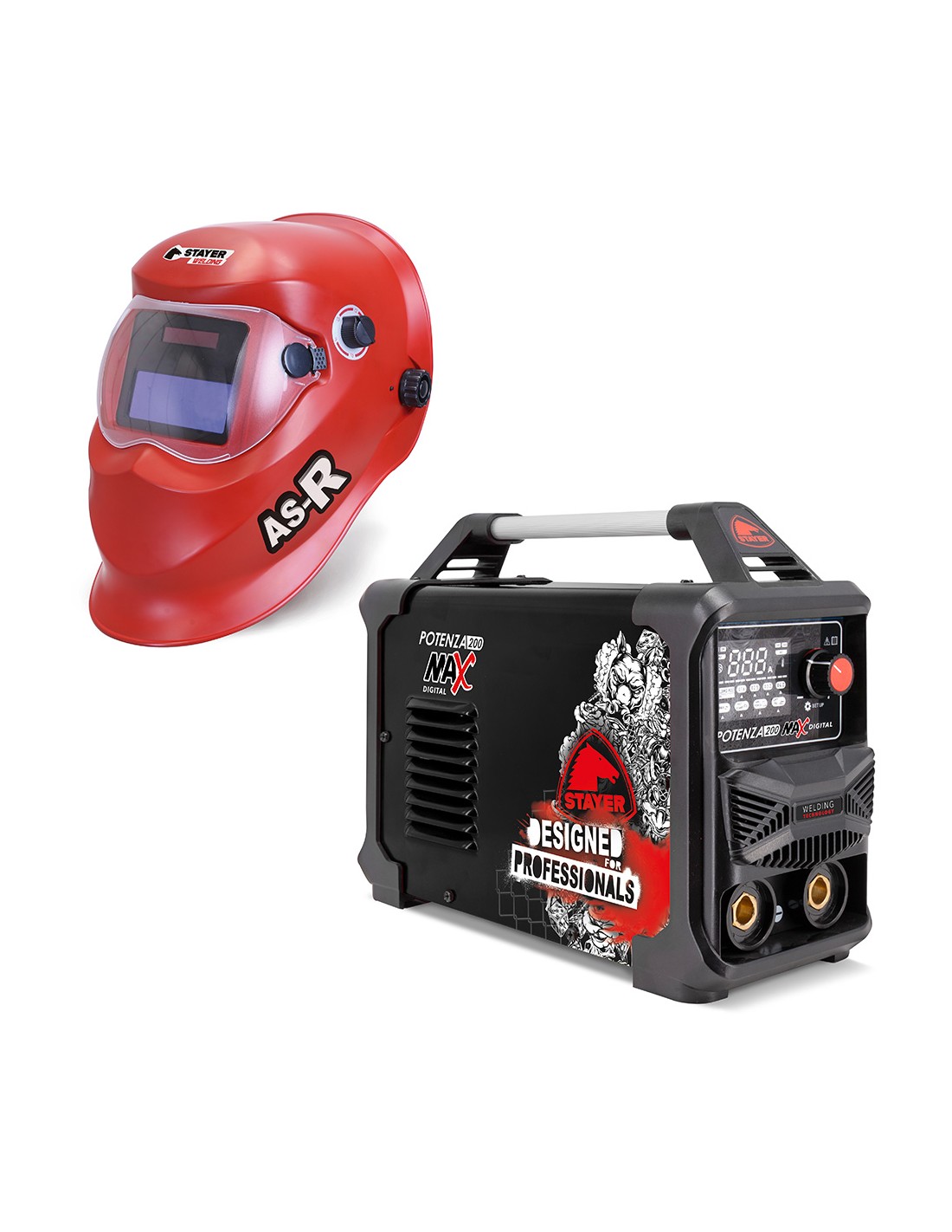 Equipo electrónico potenza 200 max digital, para soldadura por arco eléctrico de toda clase de electrodo recubierto, factor de marcha profesional de 60 %, intensidad 200 a, alimentación 230v, voltaje en vacío 68vdc, electrodo max. (1,6-5 mm), uso con generador (7-9), borna dinse ø1/2'' (35-50). apto para todo tipo de trabajos ligeros y medianos en los campos de mantenimiento, construcción, prestaciones incomparables frente a modelos similares de otras marcas. incorpora sistema profesional de refrigeración con estabilidad térmica y máximo rendimiento en su categoría, fácil realización de soldadura gracias al control inteligente stayer welding que incluye las ventajas hot start, arc force y anti stick para optimizar el cebado inicial del arco, mejorar su estabilidad durante el soldeo y evitar que el electrodo se pegue por mal manejo, equipo completamente preparado para uso seguro con generadores estabilizados con una tolerancia de +/-15%, sólida construcción de acuerdo con las especificaciones europeas 2011/65/eu, 2014/35/eu, 2014/30/eu e iec. 60974. mascara as r: as-r oscurecimiento ajustable de din 9 a din 13 con área de 96x45mm, posición de amolado para evitar oscurecimiento automático, controles de sensibilidad y retraso a claro, alimentación solar con respaldo de batería. incluye: cable de alimentación 1,8 m x 4 mm, cable de masa con pinzas 2m x 25 mm, cable porta-electrodos 2,5 m x 25 mm, martillo con cepillo, equipo y máscara as r. 32x13x25 cm