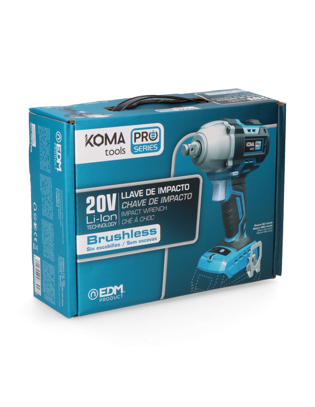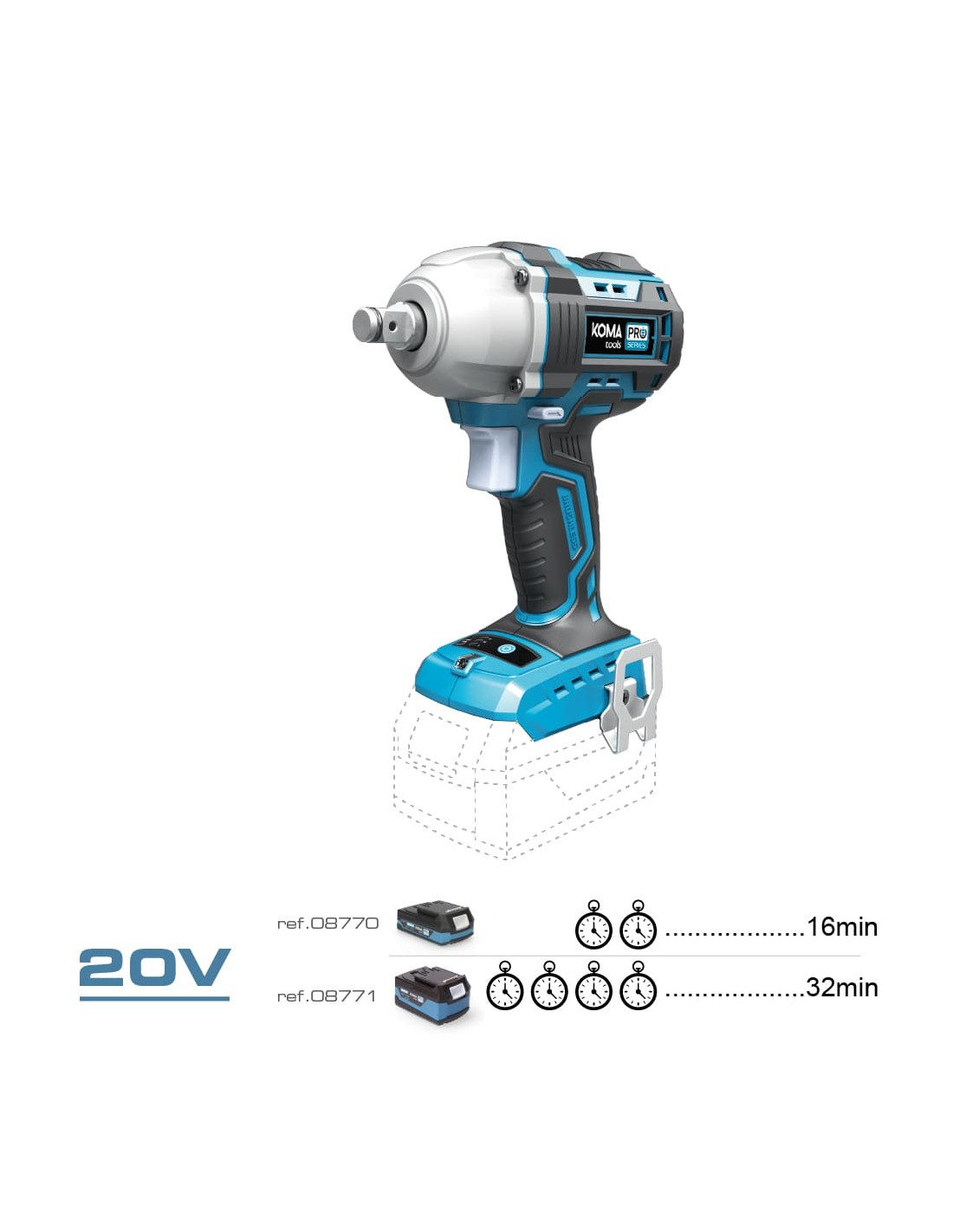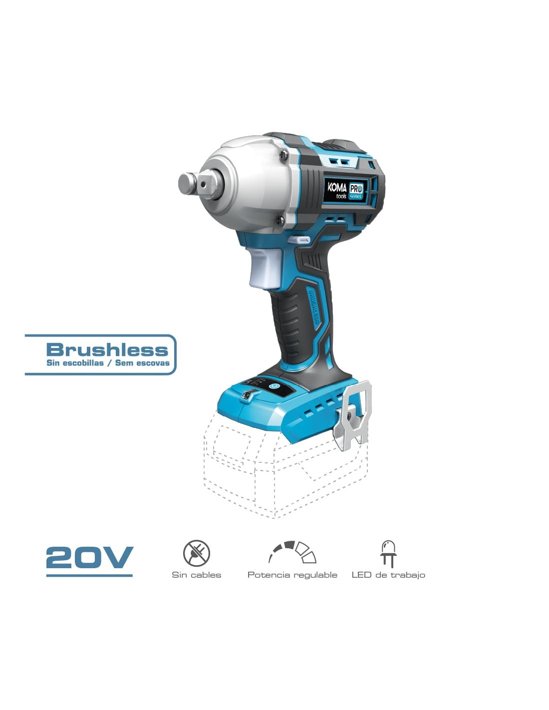 Llave de impacto 20 v brushless li-ion (sin batería ni cargador), portaherramientas 1/2". par de apriete: 150-200 nm, 250-300 nm par máximo: 450 nm. 0-3400ipm, velocidad: 0-1200rpm, 0-1600rpm, 0-2300rpm, luz de trabajo, clip para colgar, medidas: 16 x 6,5 x 20 cm