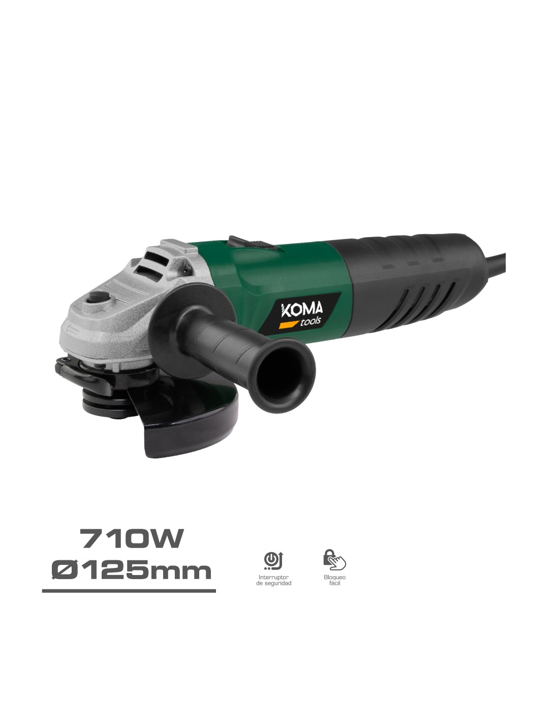 Amoladora angular de ø125 mm, con una potència de 710 w, 11000 rpm, con mango multiposición, tacto antideslizante, interruptor de seguridad, con bloqueo fácil y cable de alimentación de 2 m, incluye la llave para cambio de disco, con maletín para guardar todos los accesorios 230/240v 50hz am-1050 228 x 130 mm