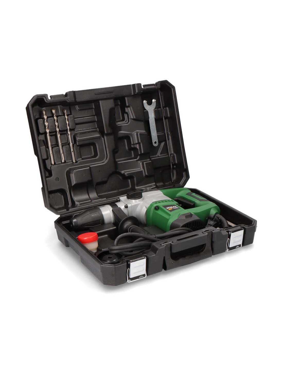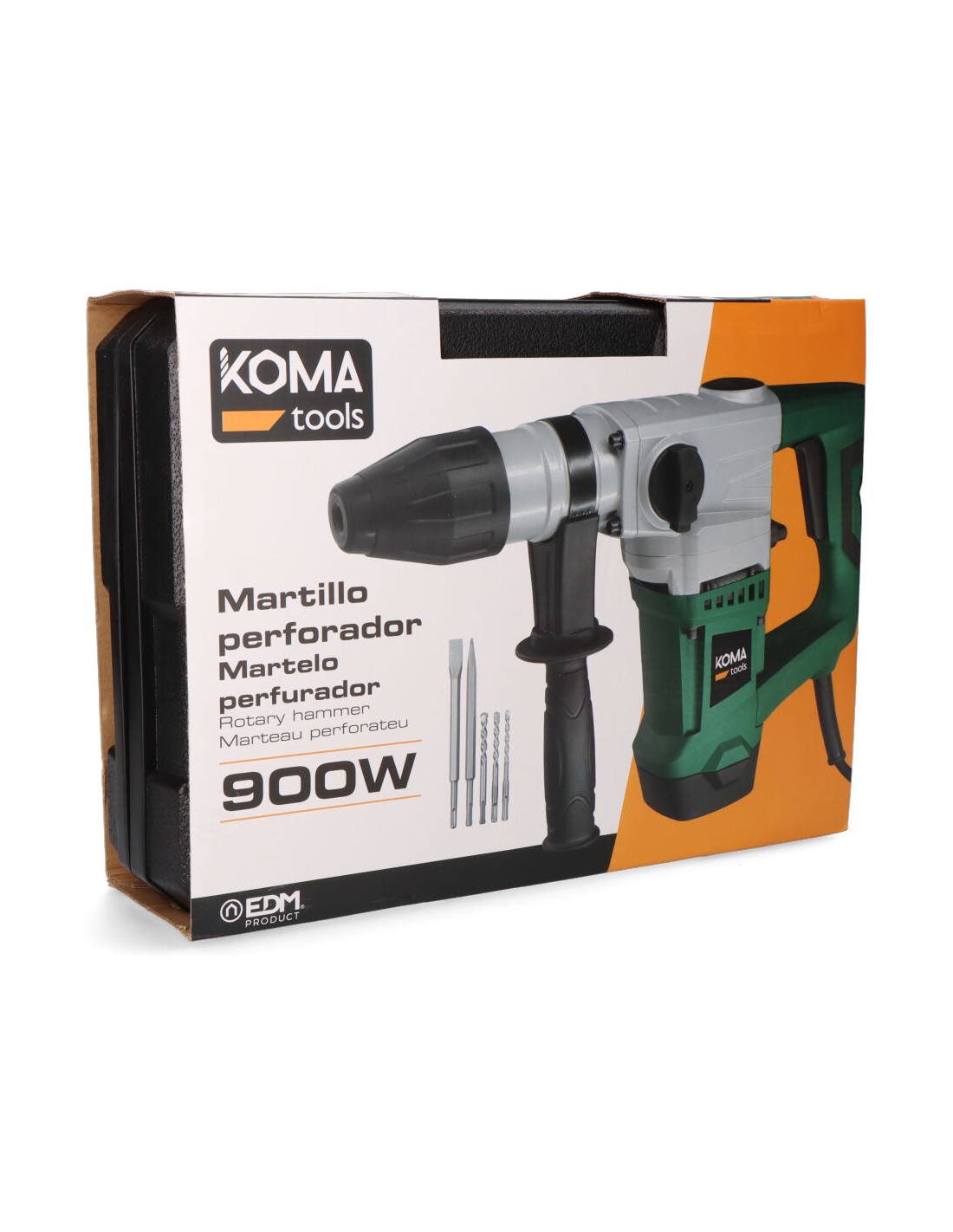 Martillo percutor dos funciones con una poténcia de 900 w, con una velocidad de repetición de 830 rpm y una velocidad de impacto de 4200 ipm. fuerza de impacto de 5 j. cable de 2 m. mandril con enganche sds+. incluye 3 brocas del n 8/10/12 y 2 cinceles uno plano y otro de punta. también incluye un bote grasa y la llave para el depósito de grasa, contiene cubierta antipolvo y viene con un maletín para transportar y guardar todos los accesorios. mp-900