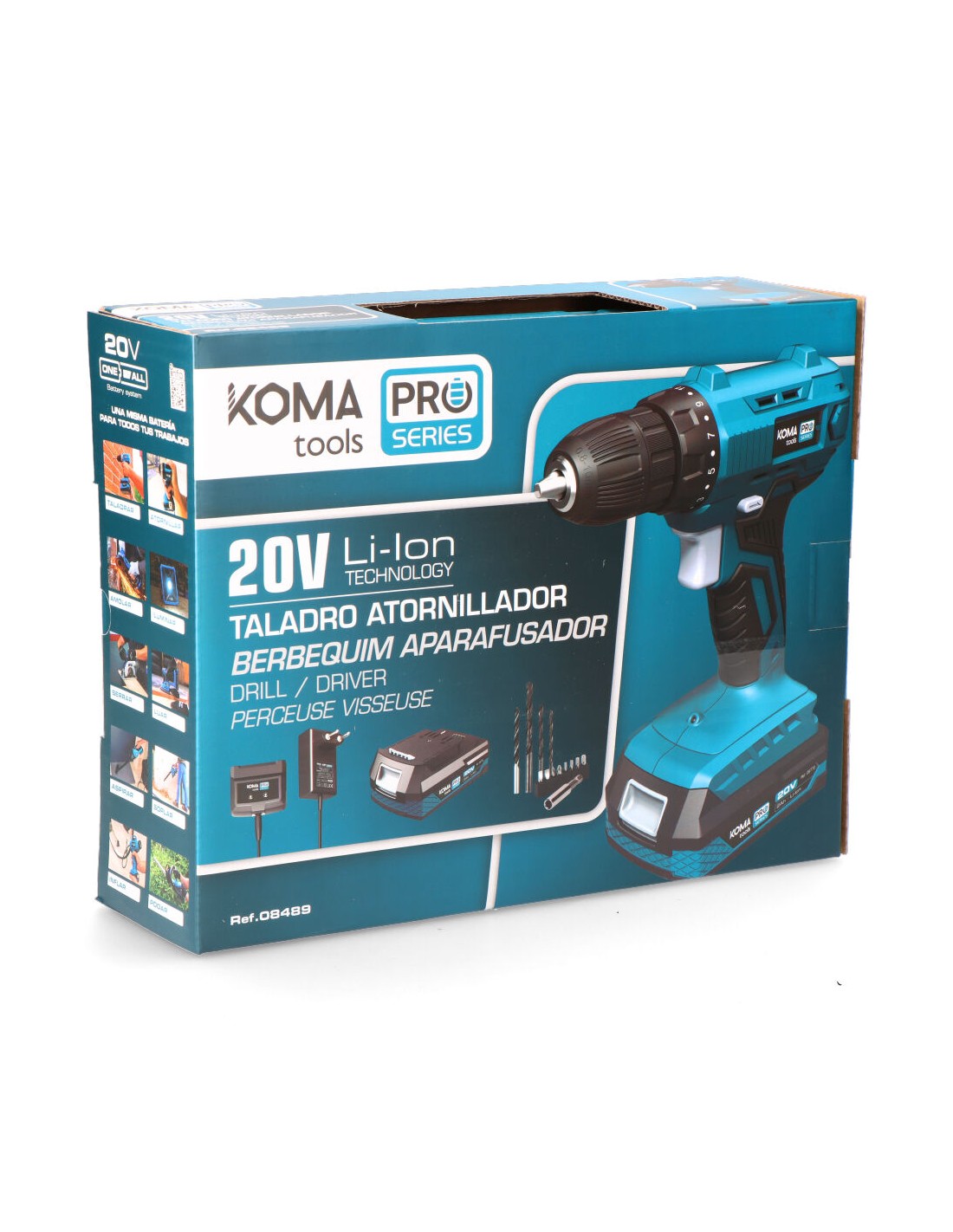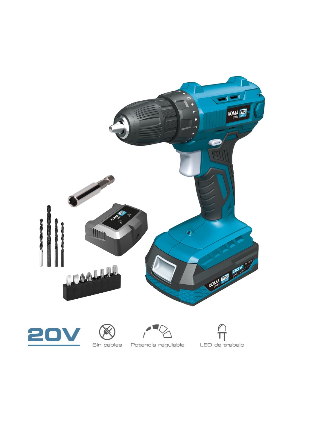 Kit maletín taladro atornillador. incluye: 1 bateria li-ion de 20 v y 2 ah cargador de 30 w y 1,0 a portapuntas imantado ( s5 / s6 / ph1 / ph2 / t15 / t20 / hex4 / hex5 ) 3 brocas para metal ( 5 / 6 / 8 mm ) 1 broca para madera 6 mm y 1 punta doble ph2. portabrocas sin llave de ø10 mm 1 velocidad de 0 a 700 rpm 19 + 1 posiciones de apriete ajustable (max. 15 nm) luz led para iluminar el punto de trabajo. dimensiones 16,9 x 17,8 cm