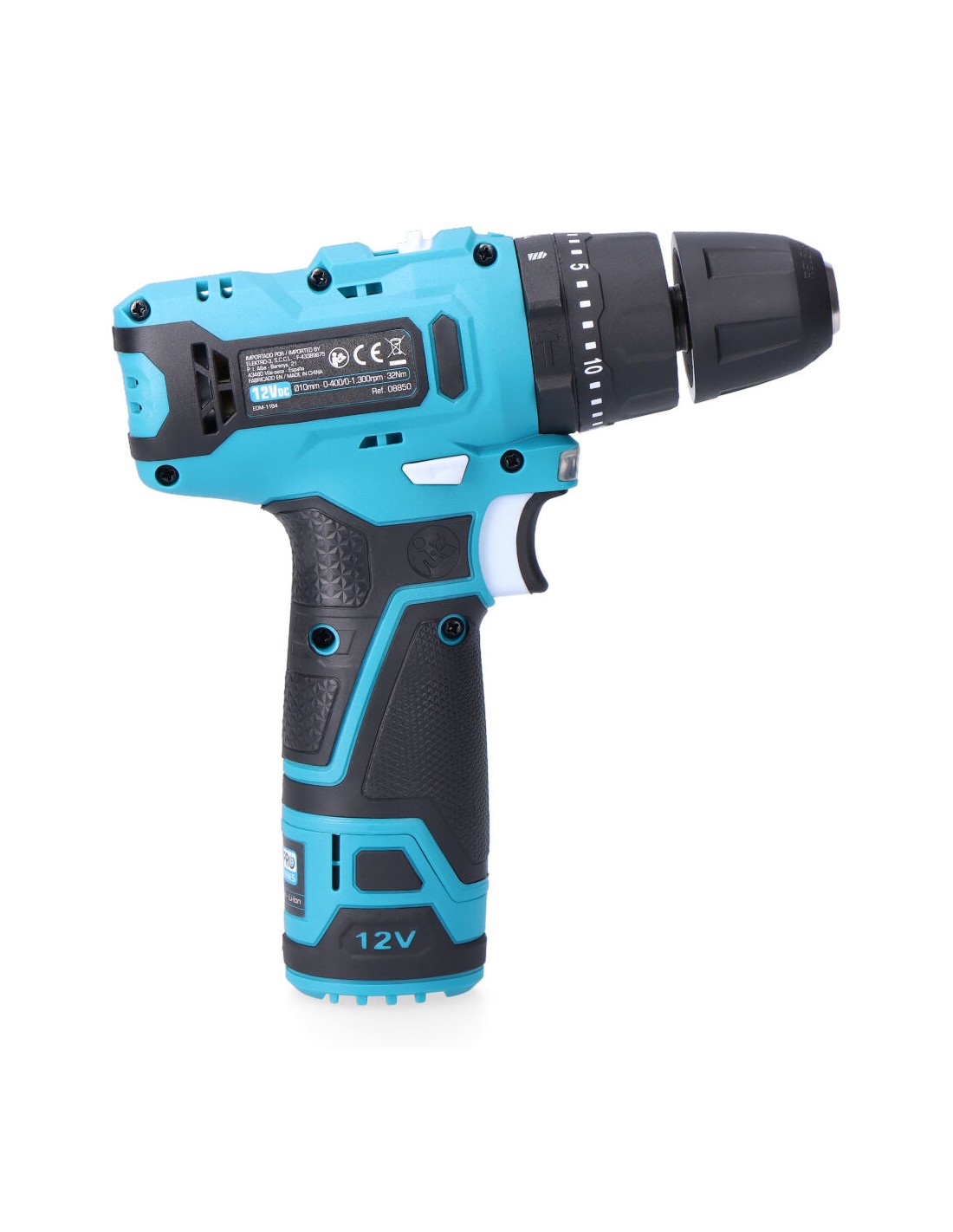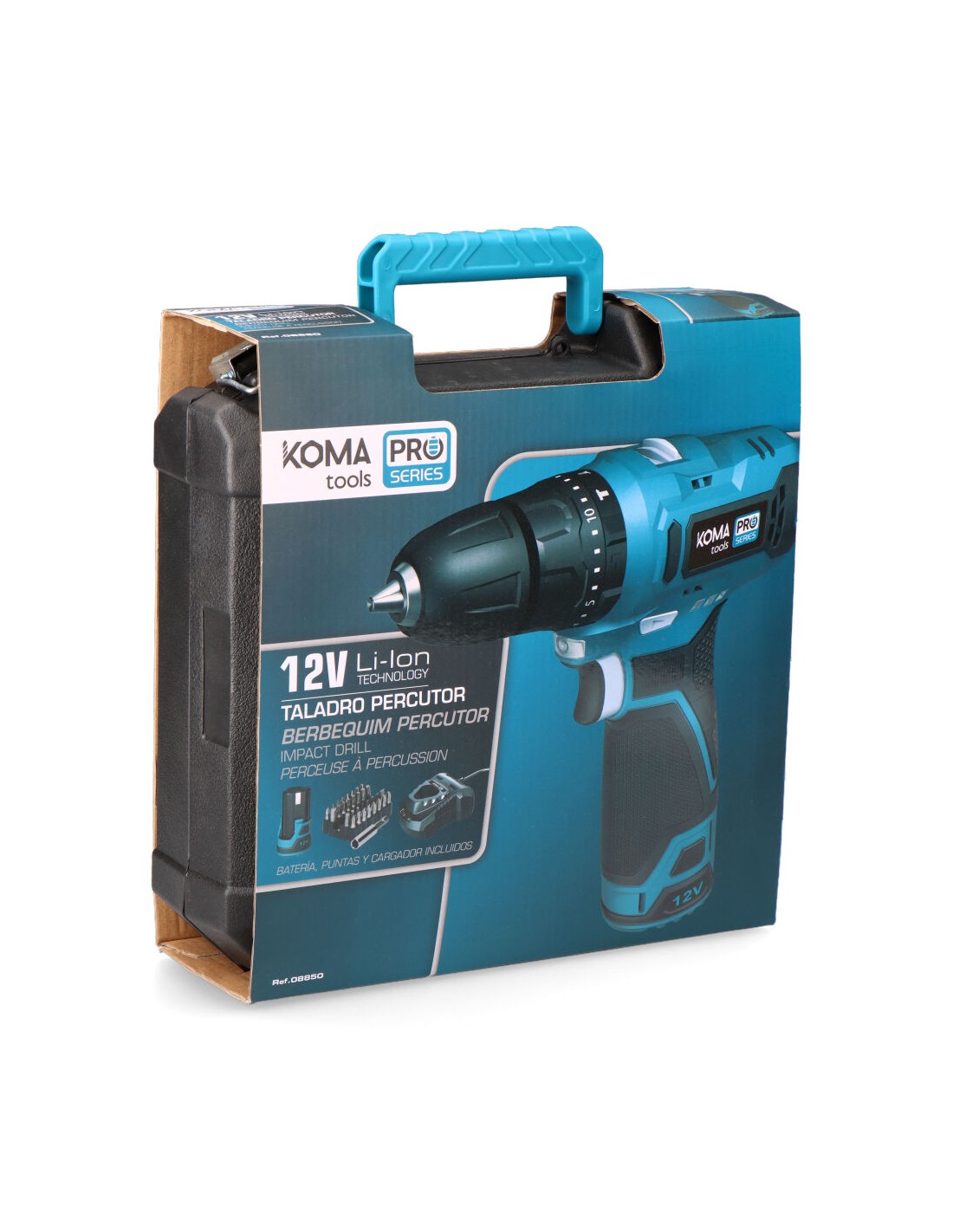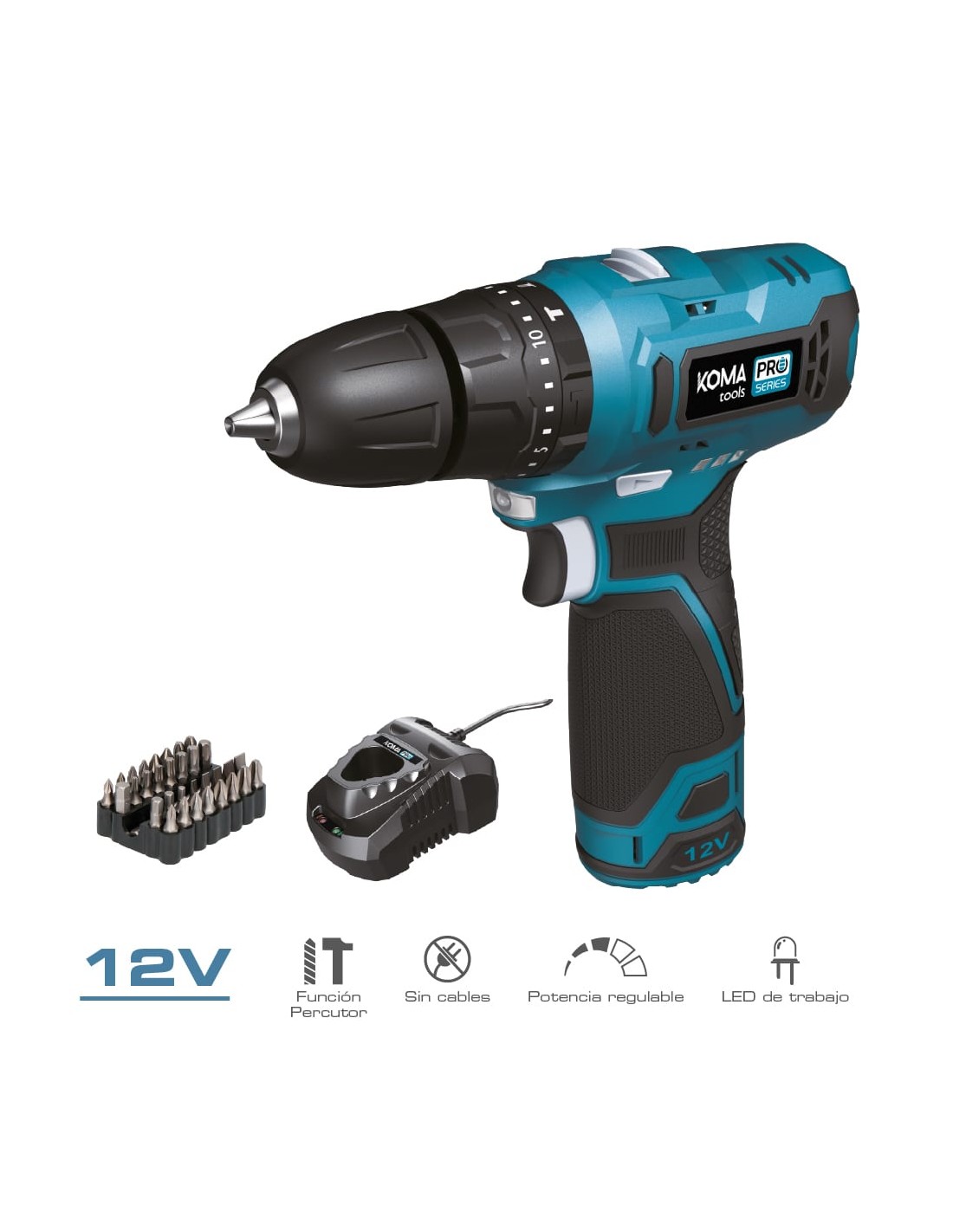 Taladro percutor 12 v, mandril ø10 mm sin llave, 2 velocidades, giro libre 400/1300 rpm, ratio impacto 6000/19500 bpm, apriete ajustable máx. 32 nm selecionable 21+1+1. luz led y indicador de batería. incluye batería 2.0 ah 12 v con carga auxiliar usb c, cargador 50 w 2,4 v, tiempo de carga aprox 3 - 5 h, portapuntas imantado y puntas: rectas (s3,s4,s5,s6,67), 2xpho, 2xph1, 2xph2, 2xph3, 2xpzo, 2xpz1, 2xpz2, 2xpz3, t10, t15, t20, t25, t27, t30, t40, hex3, hex4, hex5, hex6. con maletín para guradar y transportar. 12v-tp-k. medida 17,9 x 16,6 cm.