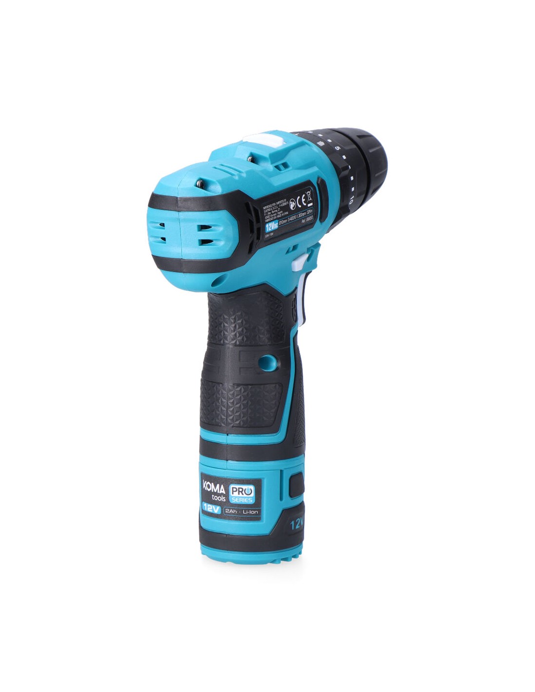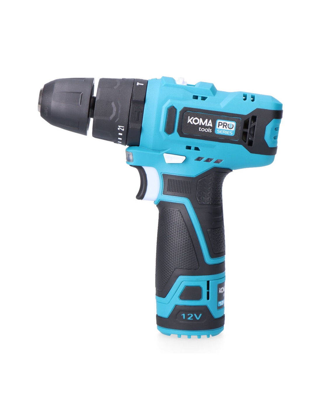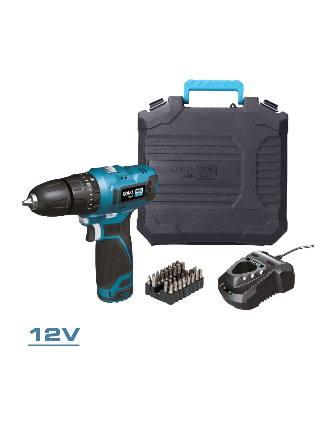 Taladro percutor 12 v, mandril ø10 mm sin llave, 2 velocidades, giro libre 400/1300 rpm, ratio impacto 6000/19500 bpm, apriete ajustable máx. 32 nm selecionable 21+1+1. luz led y indicador de batería. incluye batería 2.0 ah 12 v con carga auxiliar usb c, cargador 50 w 2,4 v, tiempo de carga aprox 3 - 5 h, portapuntas imantado y puntas: rectas (s3,s4,s5,s6,67), 2xpho, 2xph1, 2xph2, 2xph3, 2xpzo, 2xpz1, 2xpz2, 2xpz3, t10, t15, t20, t25, t27, t30, t40, hex3, hex4, hex5, hex6. con maletín para guradar y transportar. 12v-tp-k. medida 17,9 x 16,6 cm.