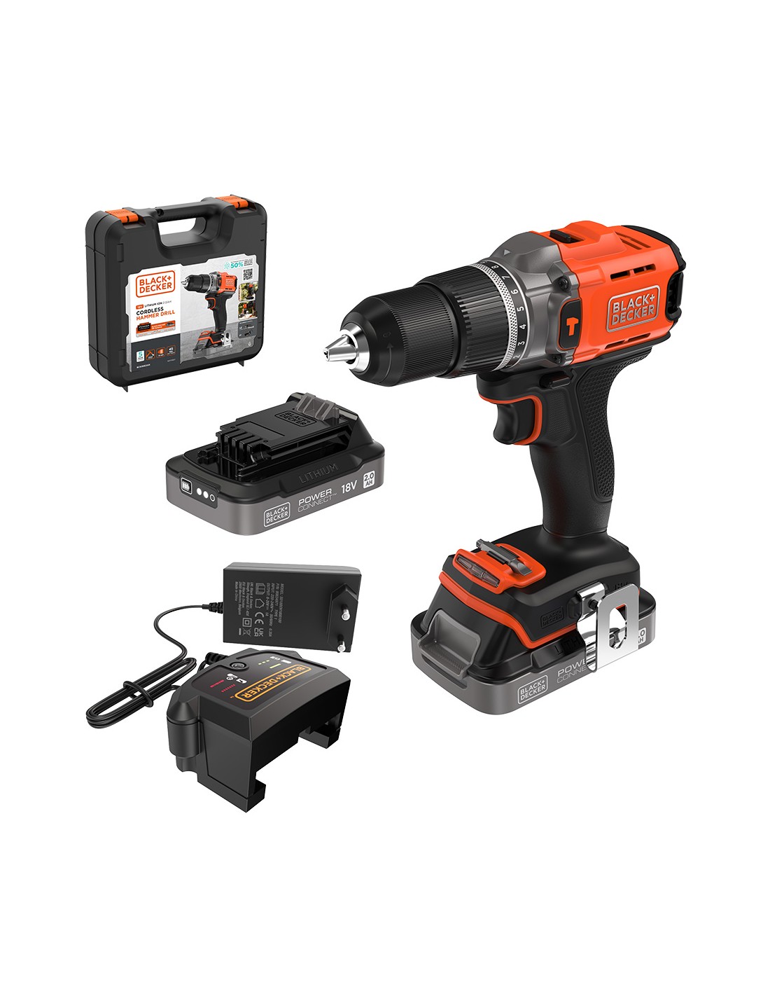 Taladro percutor 18 v, portabrocas 13 mm, 10 + 2 posiciones de par de apriete, par máximo 45 nm, 2 velocidades 0 - 400/1.550 rpm, impactos 0 - 6.400/24.800 ipm. incluye 5* años de garantía, 2 baterías 2 ah de litio de nuevo diseño, cargador rápido de 1 ah y maletín
