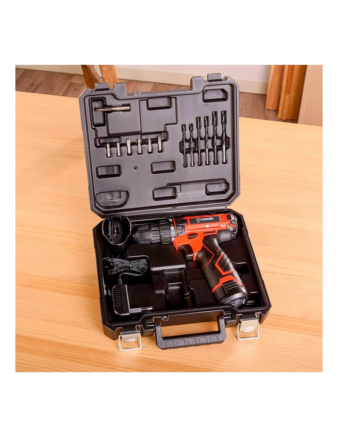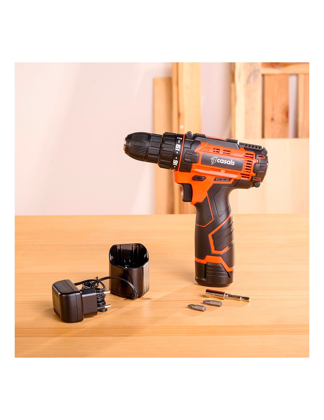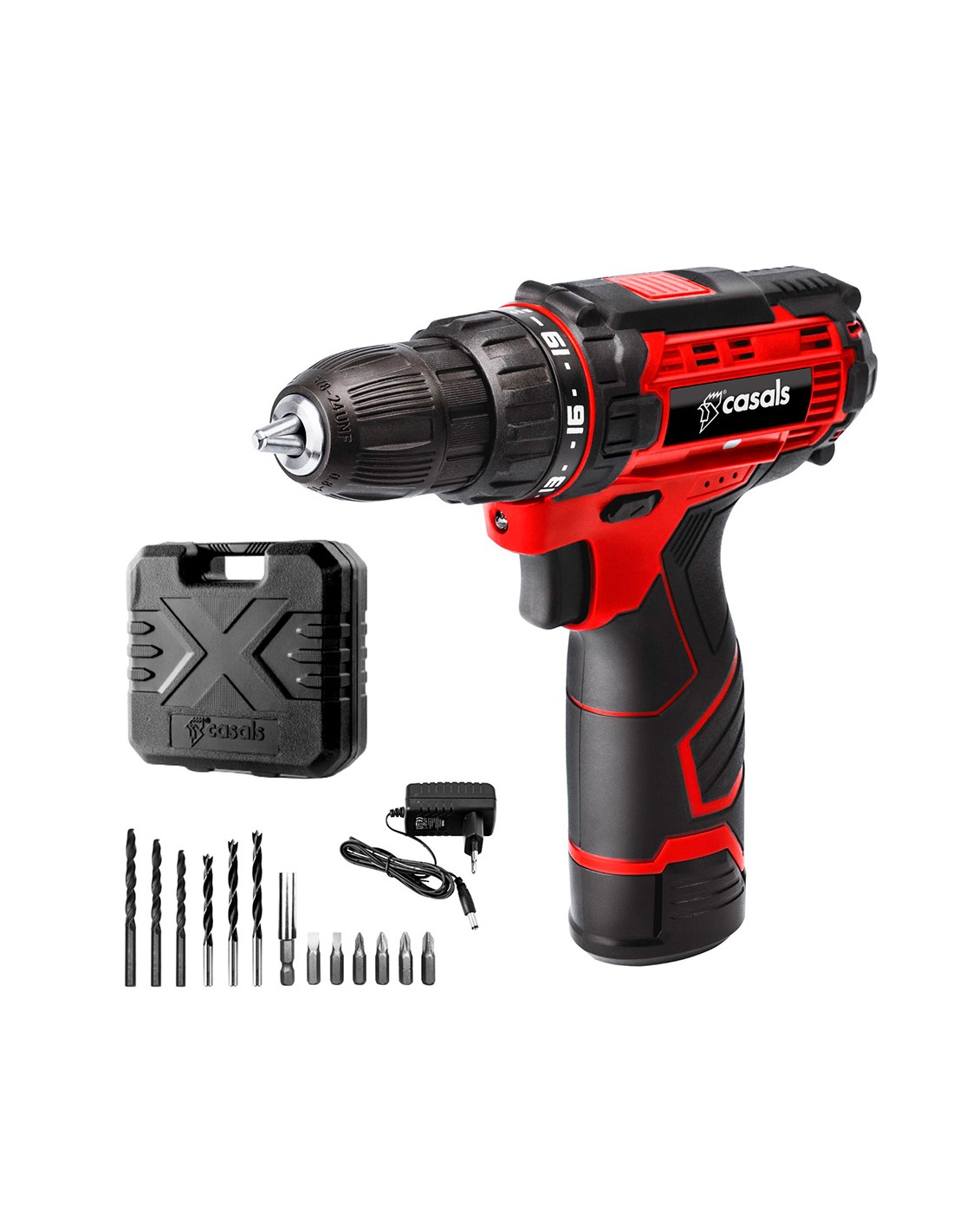 Taladro atornillador a batería 12 v. rpm: 0-800. tipo de batería: one power lithium 12 v (batería extraíble e intercambiable con el resto de herramientas de la misma gama), capacidad batería: 2.0 ah. tiempo de carga: 3-5 h. funciones: taladro y atornillador 19+1 posiciones. fuerza par máxima: 15 nm. portabrocas: ø10 mm. regulador de velocidad electrónico, led de trabajo, función reverse. incluye: maletín, cargador, set de 6 brocas, 6 puntas de atornillado y adaptador hexagonal