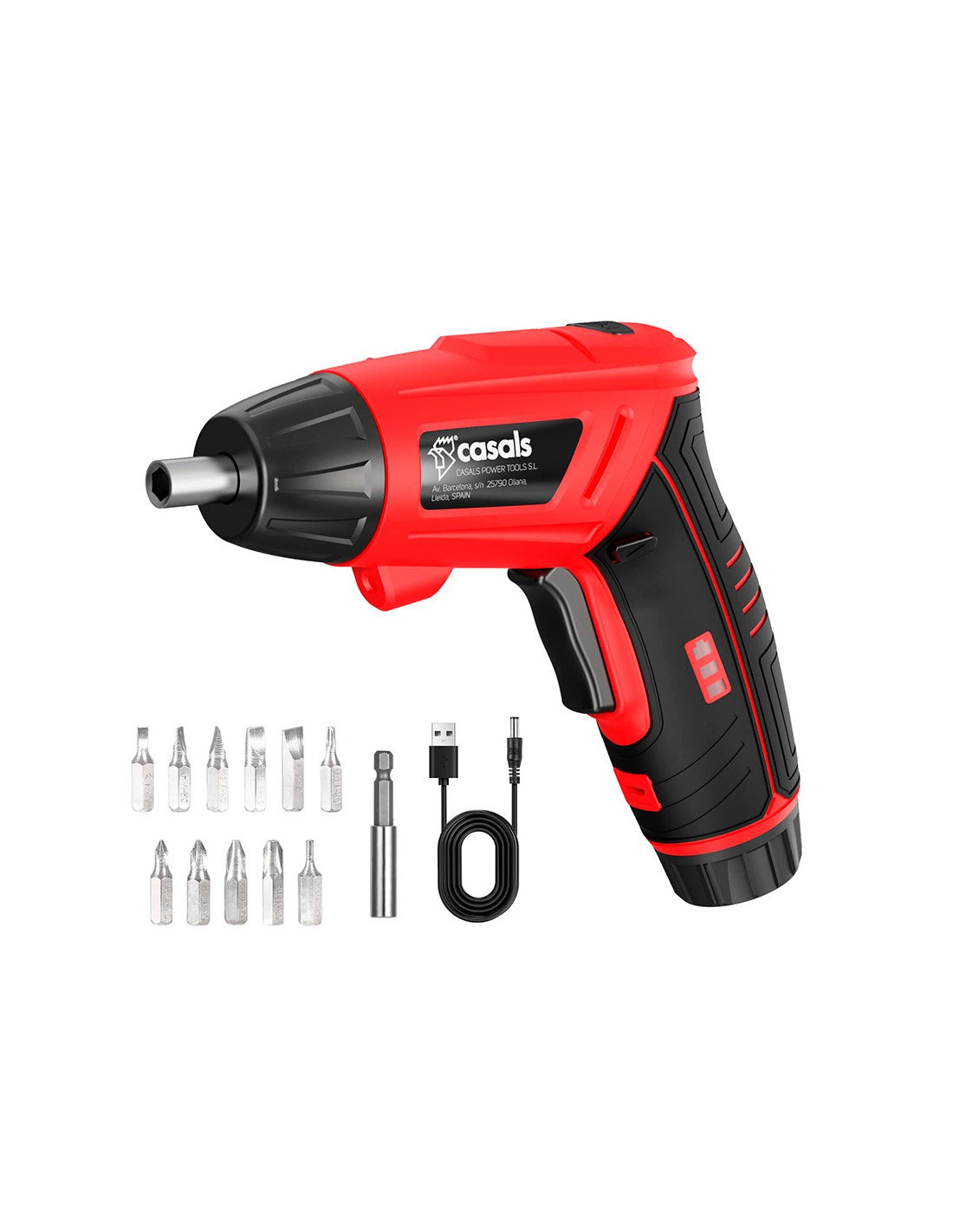 Atornillador a batería 3.6 v, 200 rpm, batería de litio 2000 mah. iluminación led en la zona de trabajo. indicador de capacidad de la batería. mango rotatorio. linterna en la base del atornillador. incluye: adaptador hexagonal, 11 puntas de atornillado y cable usb