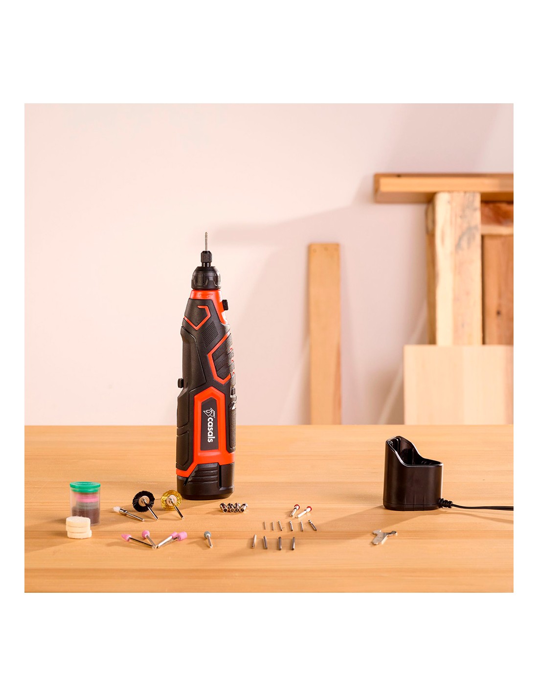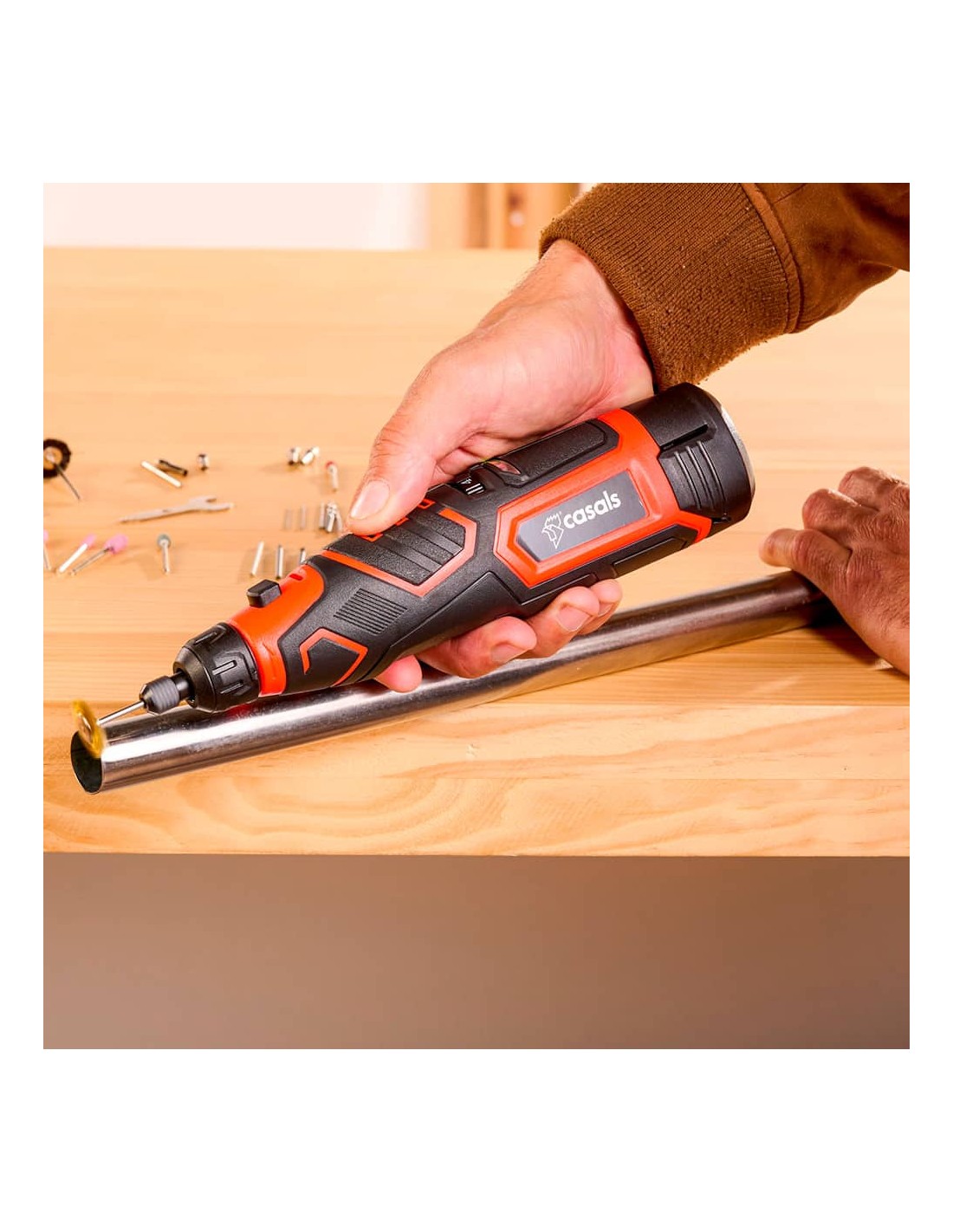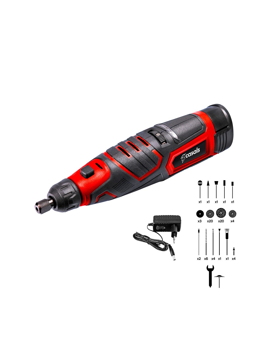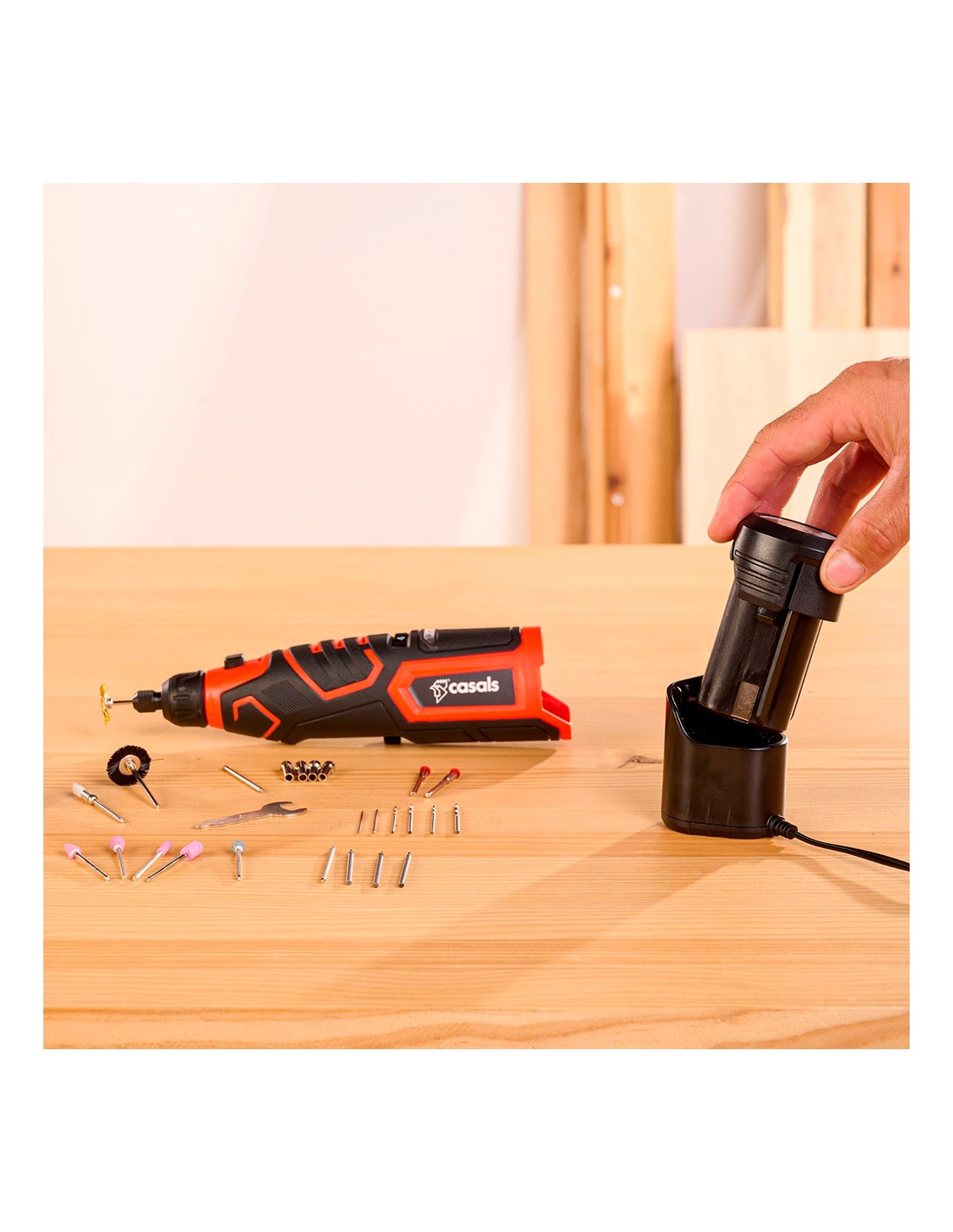 Herramienta multifuncional 12 v, batería: 2.0 ah (batería extraíble e intercambiable con el resto de herramientas de la misma gama), rpm: 5000-25000 rpm, número de velocidades: 6, indicador de estado de carga, tiempo de carga: 3-5 h, botón de bloqueo, portabrocas: ø2,4 mm, cuenta con 73 accesorios: cargador, set de 13 brocas y distintos cabezales para cortar, limar, pulir, abrillantar, etc