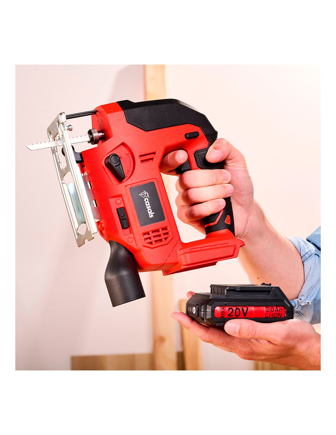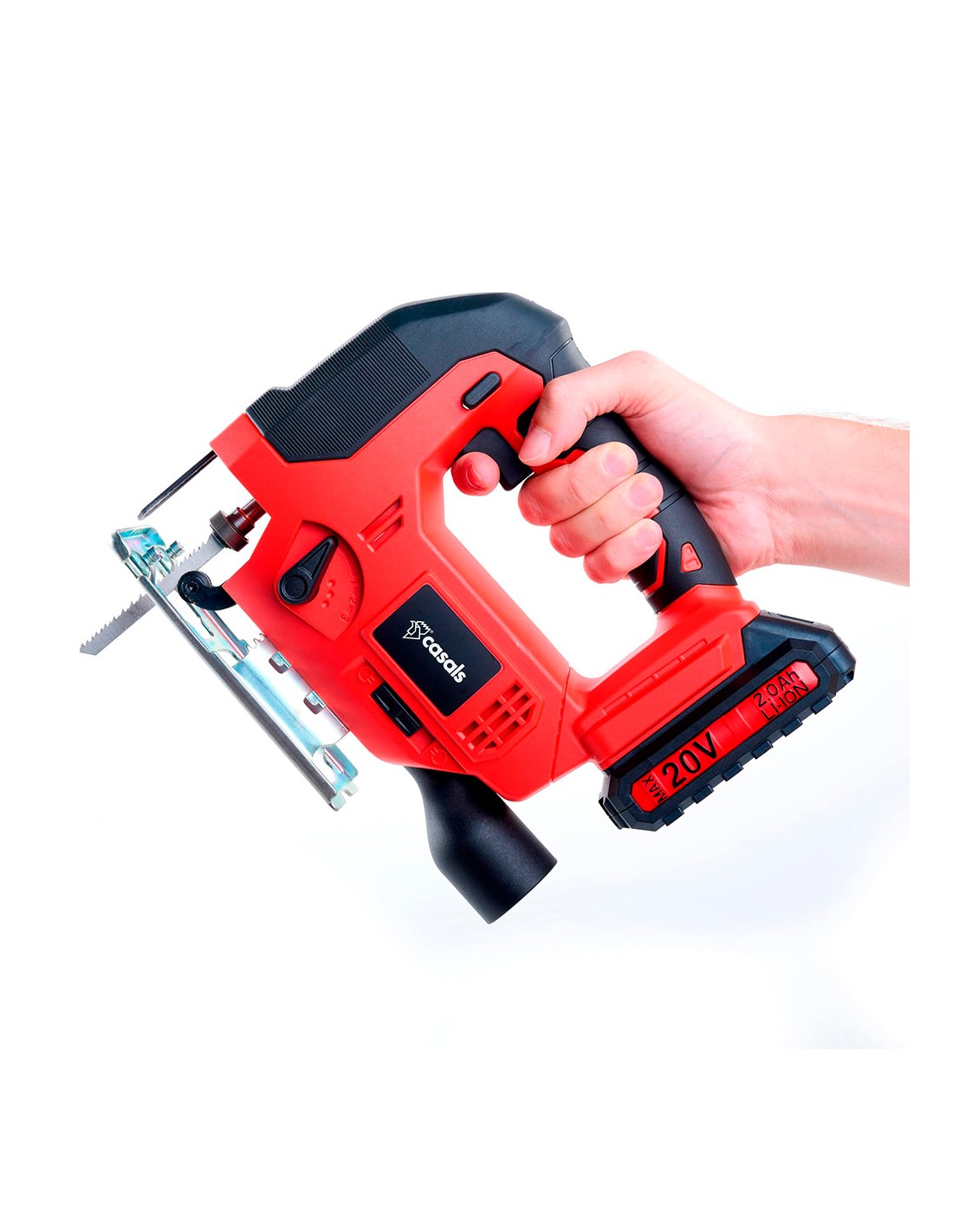 Caladora a batería, batería one power lithium 20 v intercambiable con el resto de herramientas de la misma gama. batería 2.0 mah extraíble con indicador de estado de carga. carga de la batería en 1 h. velocidad: 0 - 2500 rpm, regulador electrónico de velocidad, luz led de trabajo, profundidad de corte madera: 65 mm. profundidad de corte acero: 8 mm. profundidad de corte plástico: 40 mm. recorrido de sierra: 19 mm. altura de la carrera: 20mm. ajuste del ángulo de corte 0-45° izquierda o derecha. posiciones pendulares: 4. dirección de salida del aire double blow regulable hacia adelante o hacia atrás. adaptador para aspirador. agarre ergonómico. revestimiento engomado en el mango y el frontal. anclaje de sierra: t & u. sistema de fijación de la hoja quick fix