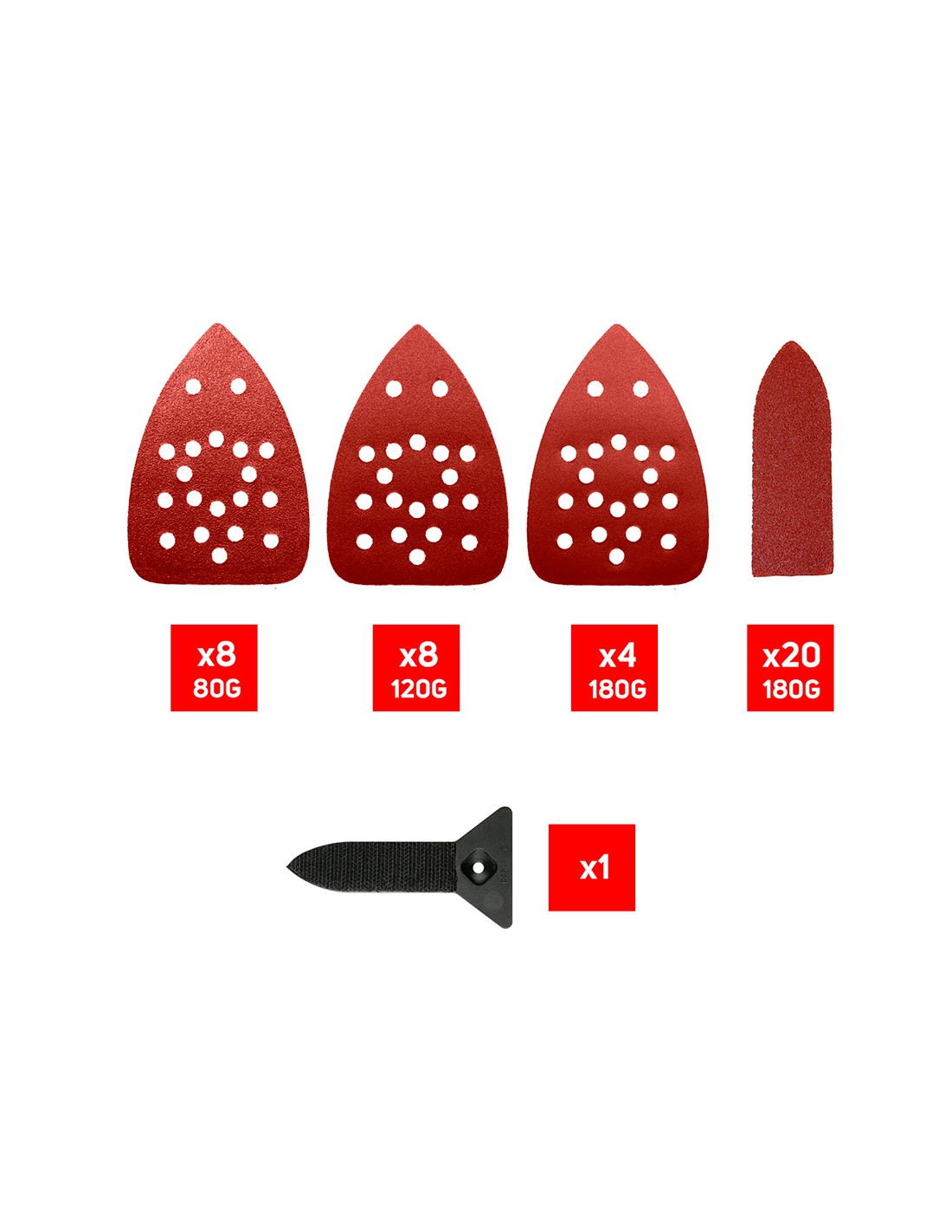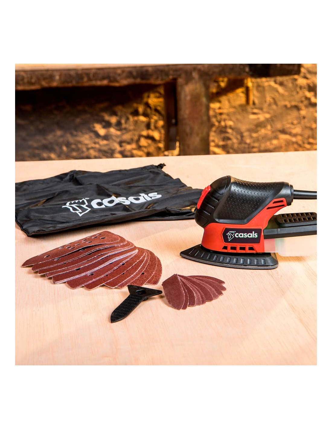 Multilijadora 75 w 230 v 50 hz para todo tipo de superficies, velocidad de 11.000 rpm para un trabajo limpio, rápido y preciso, incluye 20 hojas grano 180 (finger), 4 hojas grano 80, 8 hojas grano 120, 8 hojas grano 180 y bolsa. aspiración integrada para realizar el trabajo sin ensuciar. se puede utilizar en interiores. dimensiones de la base: 132 x 132 x 93 mm. agarre soft-touch para una mayor comodidad, fácil manejo y ligereza
