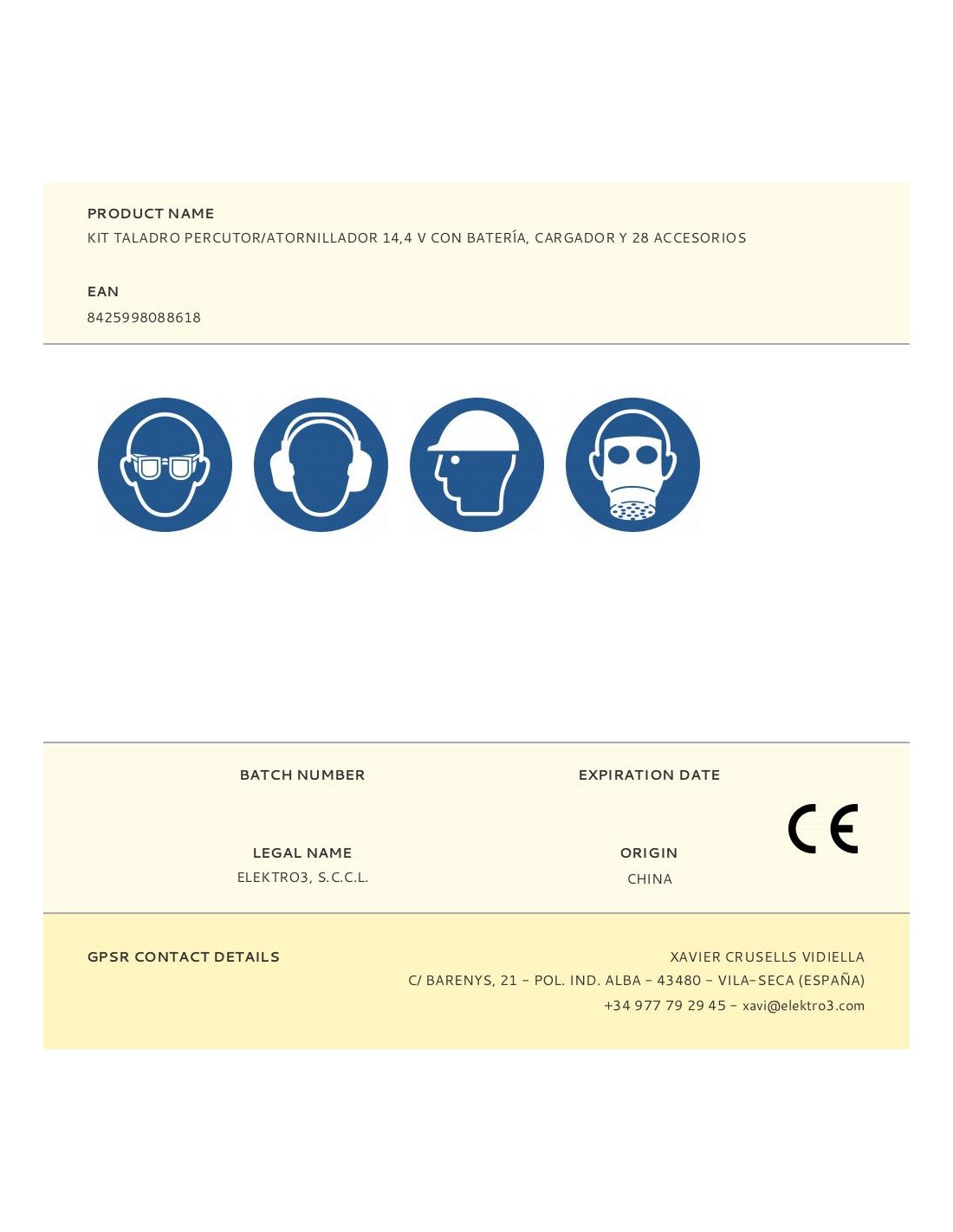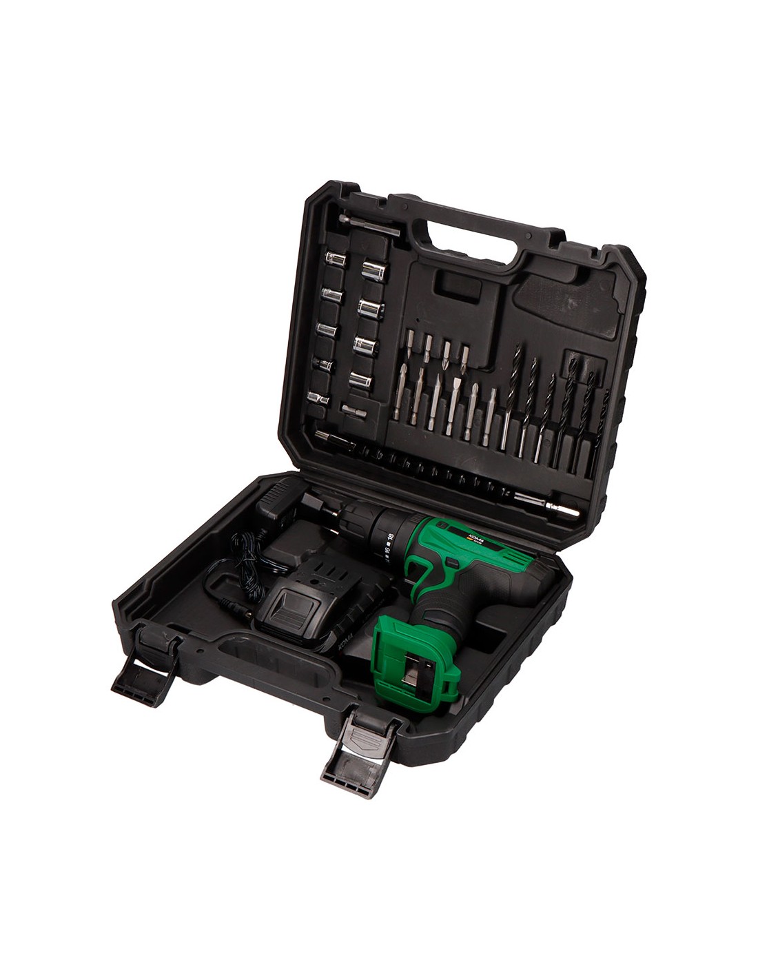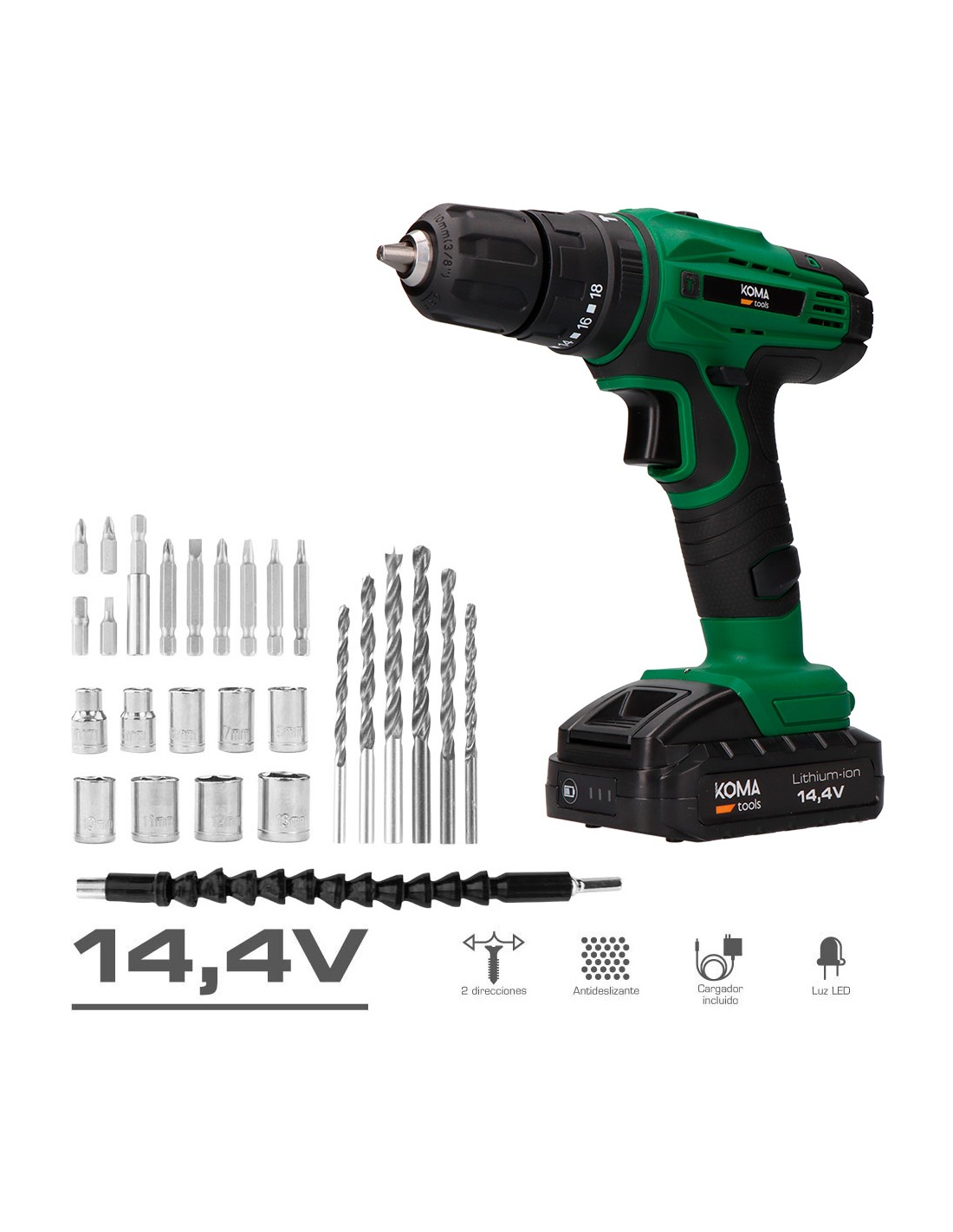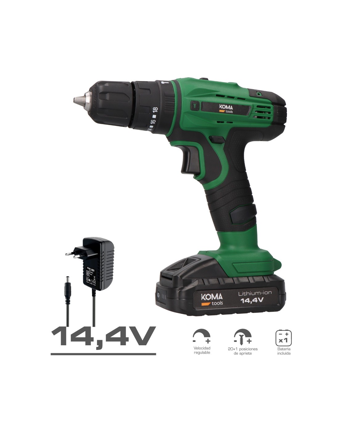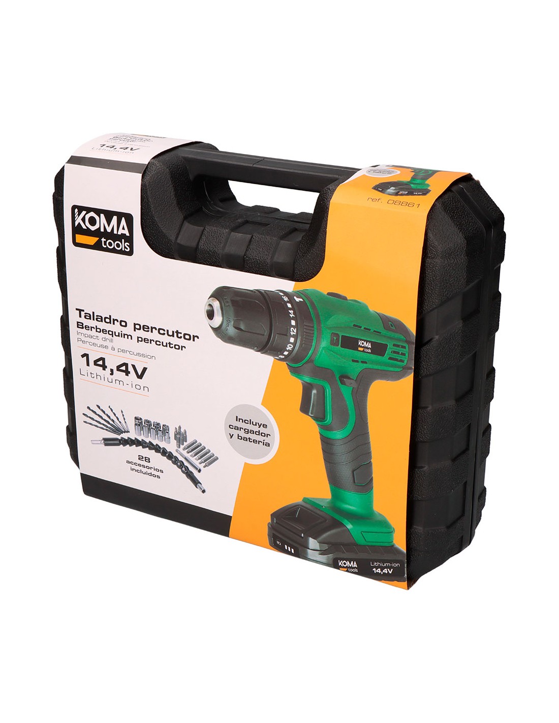 Kit taladro percutor/atornillador con batería de iones de litio de 14,4 v y 1500 mah (incluida). velocidad sin carga: 0-350/0-1400 rpm, frecuencia de impacto: 0-5750/0-23100 bpm. par de apriete: 18+1+1, par de torsión máximo de 22 nm. parada rápida y luz de trabajo led. rotación izquierda/derecha. contiene: portabrocas de ø10 mm de plástico (sin llave), 4 puntas de 25 mm y 6 de 50 mm, 3 brocas para madera (4/5/6), 3 brocas helicoidales (4/5/6), 9 vasos, 1 y un eje blando. además incluye maletín de transporte, batería con indicador de carga y cargador lento 100 - 240 v~50/60 hz 0,4 a máx. tiempo de carga: 5 horas. dimensiones: 19,5 x 7,5 x 21,6 cm