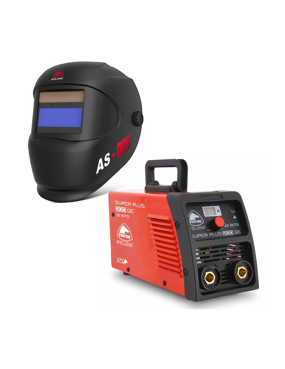 Soldador electronico de arco eléctrico para todo electrodo recubierto. factor marcha profesional 60 % aire a 30 c, 200 a, voltaje en vacío 63 vdc, con sistema de refrigeración con estabilidad térmica. optimo para electrodos de rutilo, básico, inox, fundido, alto rendimiento. completamente preparado para uso seguro con generadores estabilizados con una tolerancia de +/-15%. fabricado segun especificaciones europeas 2011/65/eu, 2014/35/eu, 2014/30/eu e iec 60974. máscara as one: área de visión 91x41 mm. filtro automático. máscara de alta resistencia. batería de litio incorporada con carga solar. apta para amolado