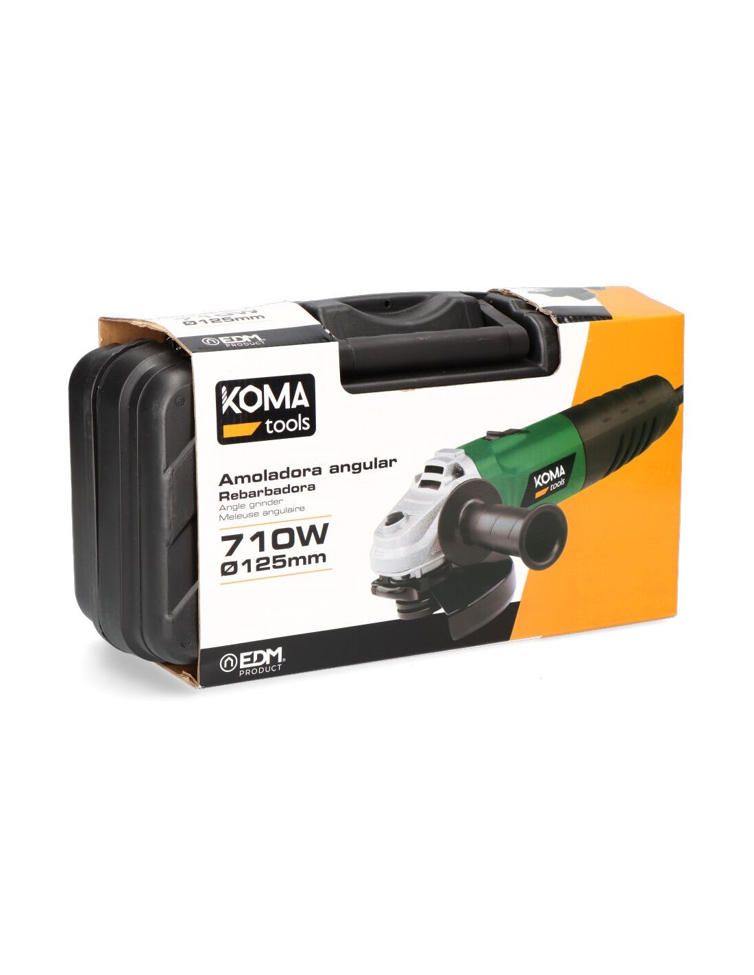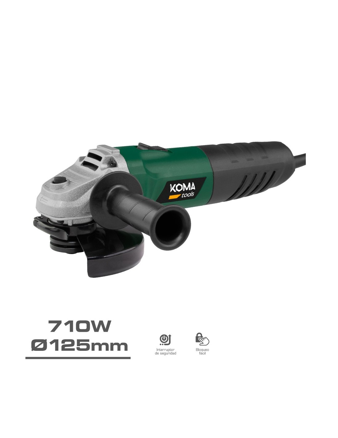 AMOLADORA ANGULAR DE Ø125 mm, CON UNA POTÈNCIA DE 710 W, 11000 rpm, CON MANGO MULTIPOSICIÓN, TACTO ANTIDESLIZANTE, INTERRUPTOR DE SEGURIDAD, CON BLOQUEO FÁCIL Y CABLE DE ALIMENTACIÓN DE 2 m, INCLUYE LA LLAVE PARA CAMBIO DE DISCO, CON MALETÍN PARA GUARDAR TODOS LOS ACCESORIOS; 230/240V 50Hz; AM-1050; 228 x 130 mm