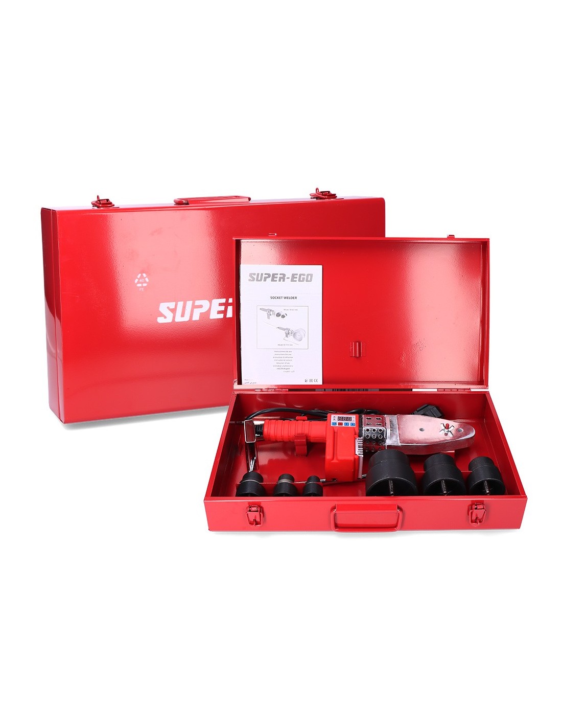 POLIFUSOR PARA PPR 20,25,32,40,50 y 63mm 1500000448 SUPER EGO. POLIFUSOR ELECTRÓNICO CON REGULACIÓN DE TEMPERATURA PARA TUBERÍAS Y ACCESORIOS DE PLÁSTICO DISEÑADO PARA SOLDAR TUBERÍAS Y ACCESORIOS DE PE, PP, PB Y PVDF, TANTO EN TALLER COMO EN OBRA. PANEL DE CONTROL Y REGULACIÓN ELECTRÓNICO. Ø20, 25, 32, 40, 50, 63mm. APLICACIÓN: PE, PP, PB Y PVDF. CAPACIDAD: MAX. Ø63mm. VOLTAJE 110V/50-60 HZ - 230V/50-60 Hz. POTENCIA: 800 W. BOTÓN ON/OFF. CÁMARA AISLANTE DEL ELEMENTO CALEFACTOR DE LA EMPUÑADURA. PLACA CALEFACTORA PARA MÁS DE UNA MATRIZ SIMULTANEAMENTE SIN QUE SOBRESALGAN DE LA PLACA. DISIPADOR DE CALOR DEL CONJUNTO ELECTRÓNICO. SOPORTE PARA POSICIÓN DE REPOSO.