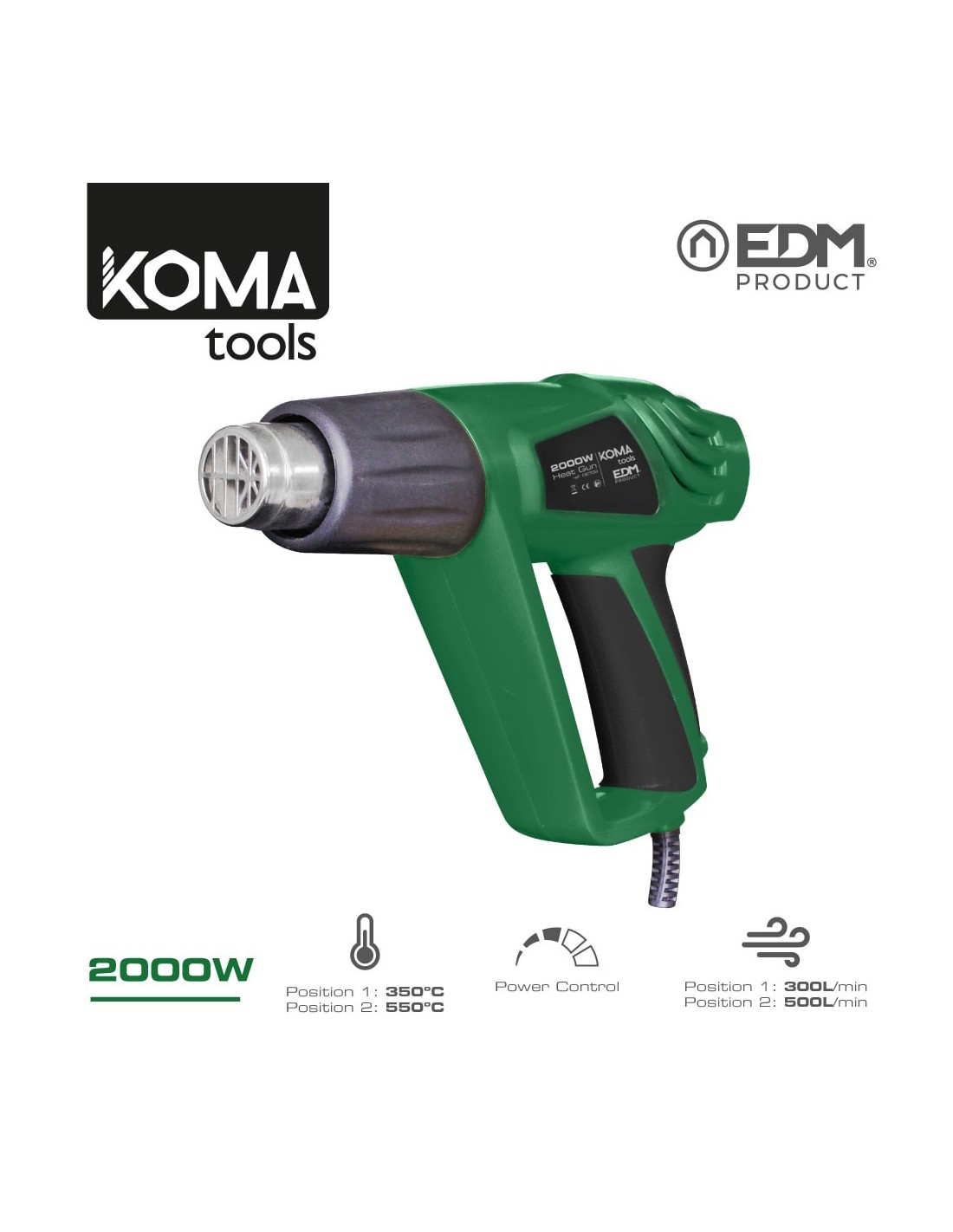 DECAPADOR DE 2000 W; 230/240V 50Hz; MANGO ERGONÓMICO DE TACTO SUAVE; 2 m DE CABLE; 2 POSICIONES DE TEMPERATURA Y FLUJO DE AIRE: (POSICIÓN 1: 400°C Y 250 L/min; POSICIÓN 2: 600°C Y 500 L/min). ACCESORIOS: 4 BOQUILLAS, DC-2000; 265 x 206 mm