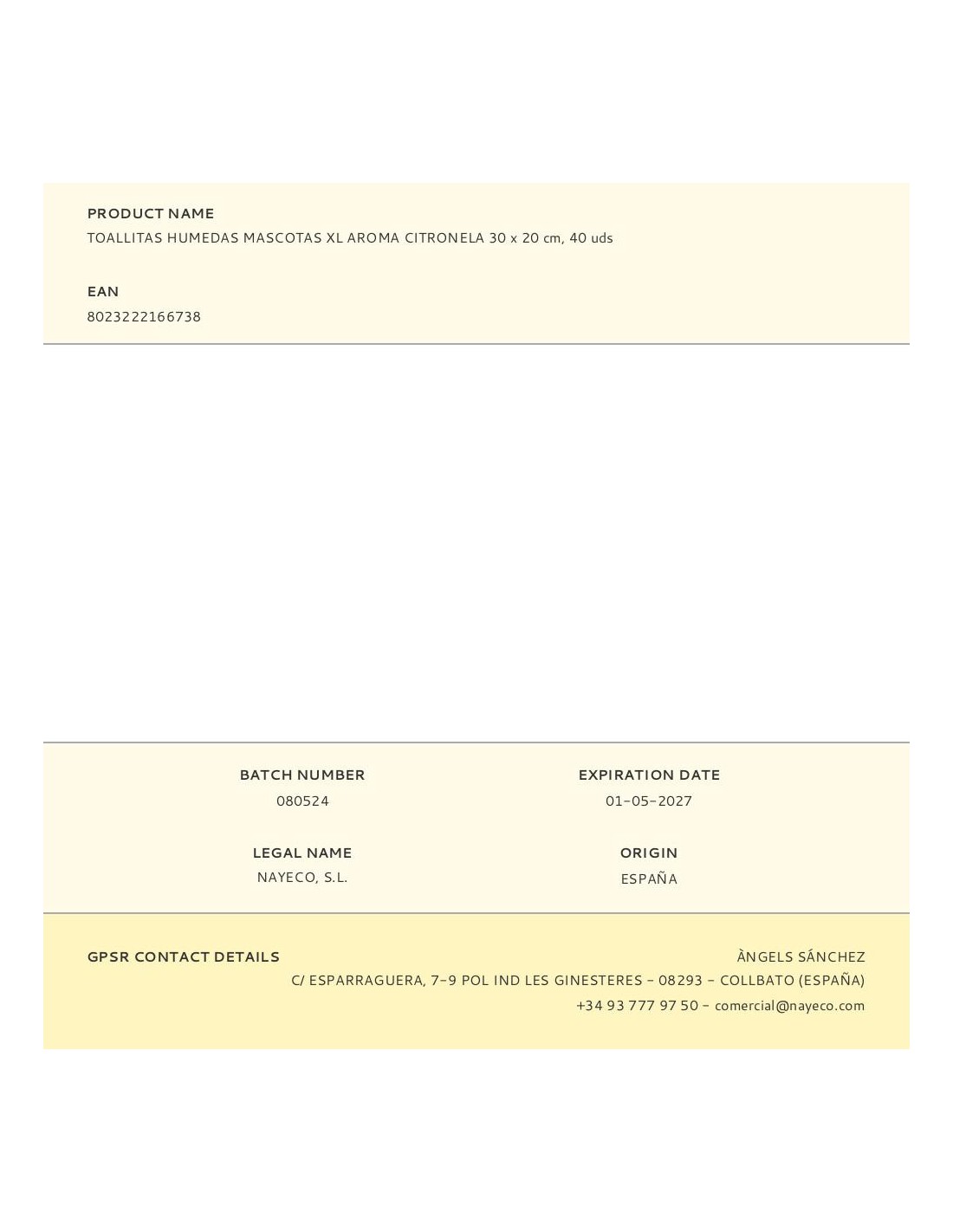 Toallitas humedas xl aroma citronela 40 unid. (30x20cm) gill's fragancia de larga duración. tejido en relieve para una limpieza más eficaz y una mayor absorción. cierre open/close que mantiene la humedad. sin alcohol. tamaño: 30x20cm. 40 unid. apto para perros, gatos y cachorros.