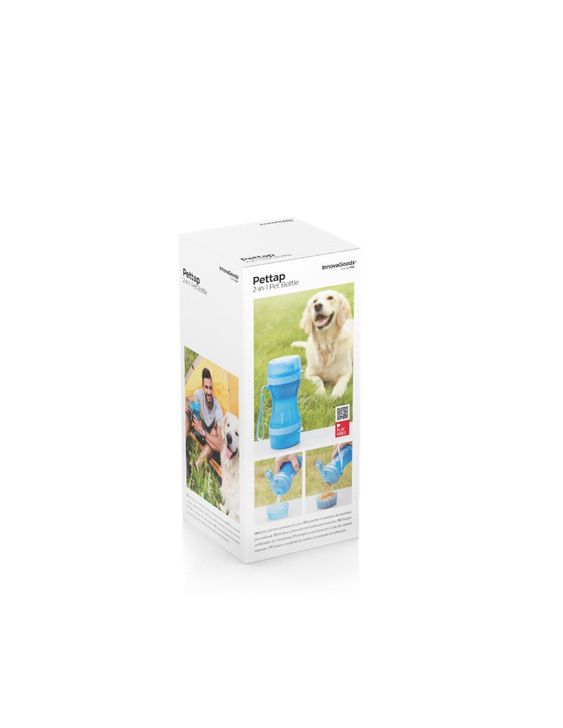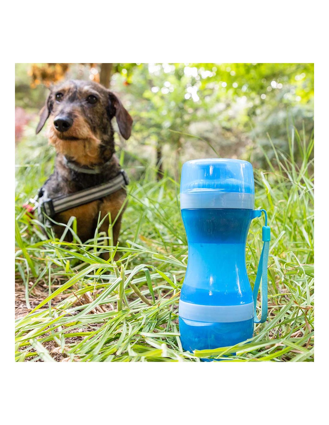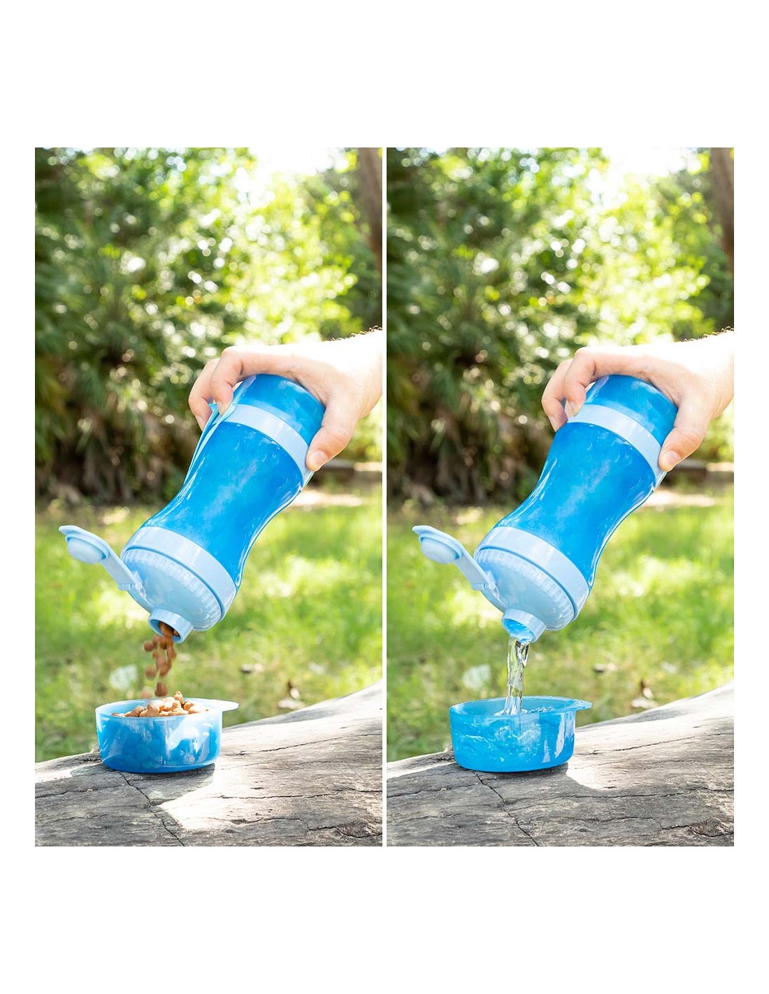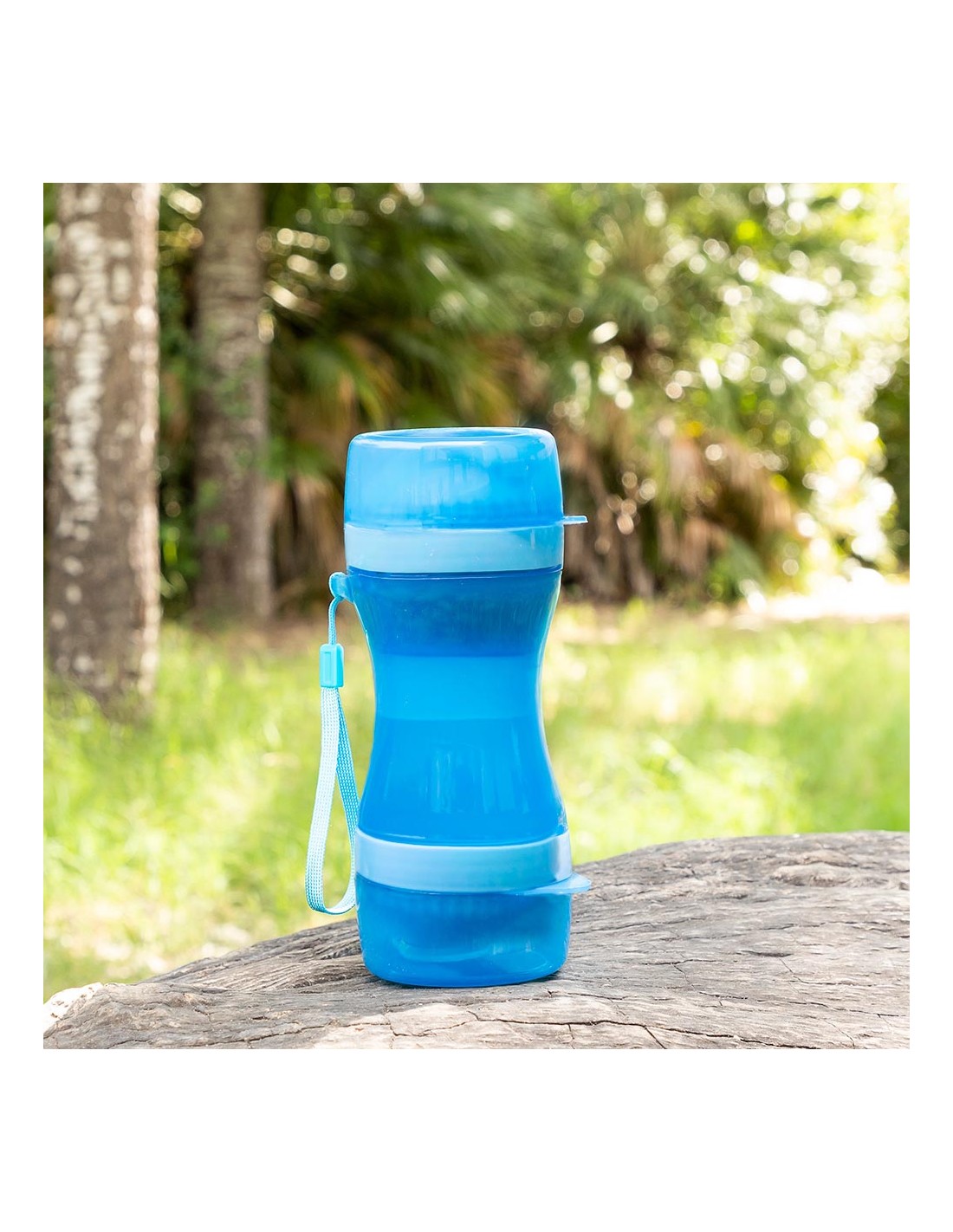 Botella con depósito de agua y comida para mascotas 2 en 1 pettap v0103141 innovagoods un original y práctico recipiente para agua y comida con forma de botella muy útil para dar de beber y alimentar a las mascotas fácilmente en cualquier momento y lugar. su interior está dividido en dos partes separadas, una para depositar el agua y otra para la comida. además, las dos tapas se utilizan como cuencos para servir el agua y la comida al animal. se desmonta y se limpia con facilidad y su sellado con silicona evita escapes y derrames. gracias a su innovador diseño portátil con cordón para colgar, se puede llevar cómodamente colgado en la mochila, en el bolso o en la muñeca durante los paseos, excursiones, viajes, etc.