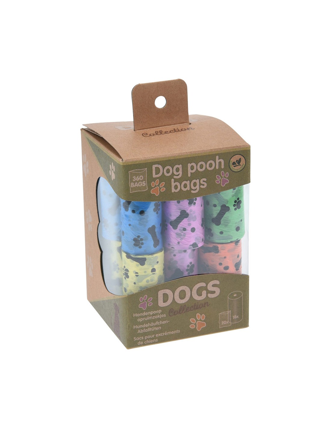 Bolsas higienicas para perros, 360 unidades (18 rollos, 20 unidades por rollo) 100% polietileno reciclado, colores variados impresos en negro, 22 x 30 cm, 7 micrómetros, packaging certificado fsc