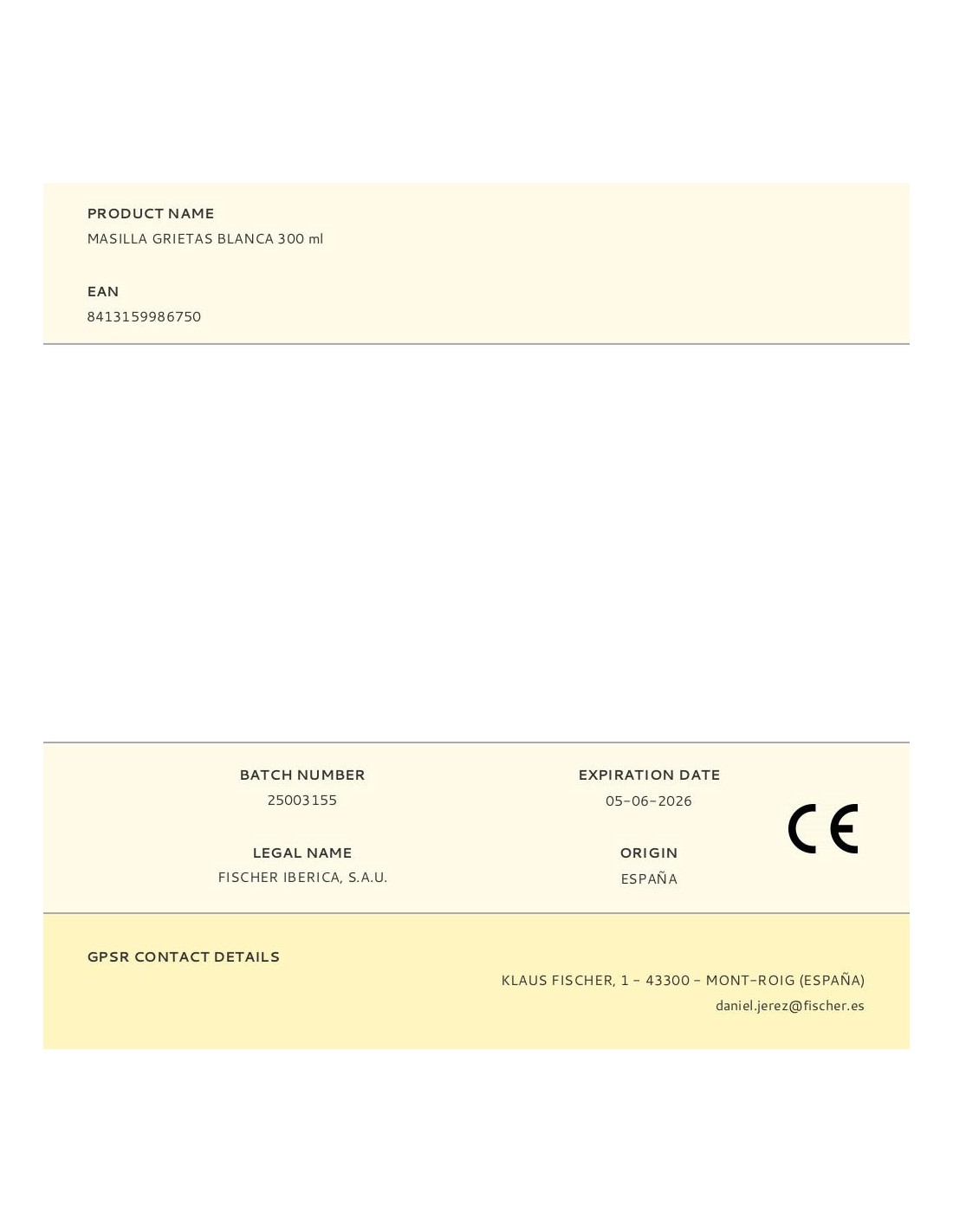 Masilla grietas blanca300 ml. masilla acrilica a base de resinas modificadas. uso general sobre juntas con movimiento inferior al 10%. compatible con la mayoria de los materiales utilitzados en la construccion (hormigon, madera, ladrillo, piedras naturases y artificiales, etc)