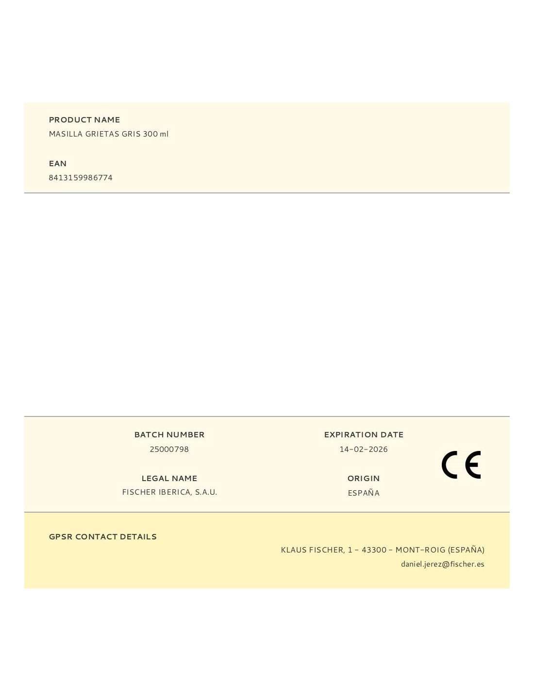 Masilla grietas gris 300 ml. masilla acrilica a base de resinas modificadas. uso general sobre juntas con movimiento inferior al 10%. compatible con la mayoria de los materiales utilitzados en la construccion (hormigon, madera, ladrillo, piedras naturases y artificiales, etc)