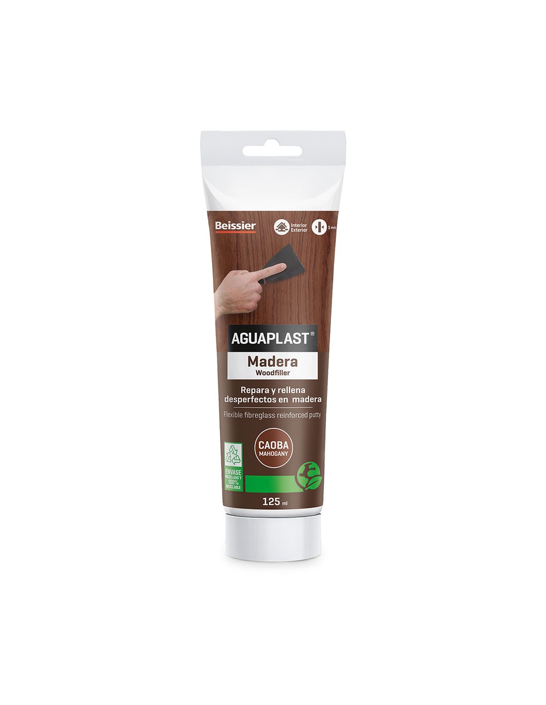 Masilla lista al uso para reparar, rellenar y nivelar pequeñas grietas, agujeros y desperfectos sobre todo tipo de maderas. reforzado con fibra de vidrio. moldeable. recortable. sin disolventes. muy flexible, se adapta a las deformaciones de la madera hasta un 20%. ligero, no descuelga. para interior y exterior. color caoba. 125 ml
