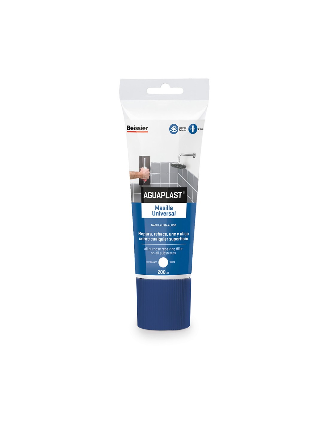 Masilla universal tubo 200 ml lista al uso para reparar, rehacer, unir y alisar sobre cualquier material. reparación de juntas de cerámicas. renovación directa sobre paredes con revestimiento cerámico, sin necesidad de eliminar las baldosas. por su resistencia al agua y a la humedad ambiente su uso está especialmente recomendado en cuartos de baño, cabinas de ducha, cocinas... color: muy blanco. para interior y exterior