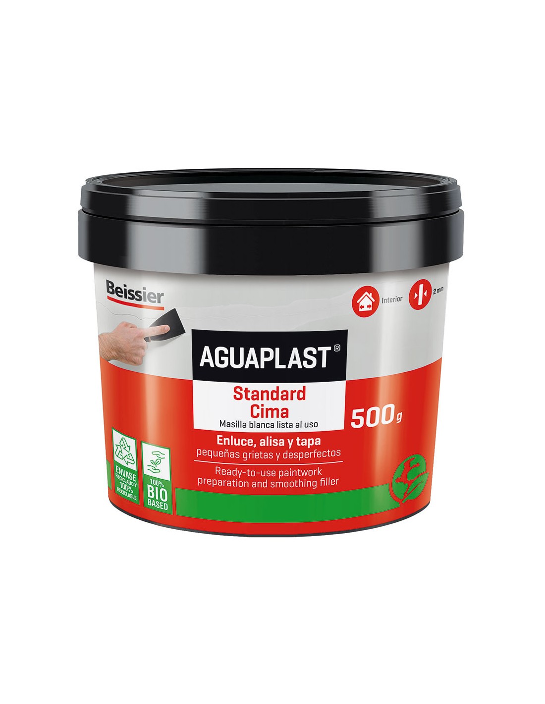 Masilla standard cima 500 g lista al uso para enlucir, alisar y tapar fisuras. reparar y alisar paredes después de arrancar papel pintado. tendido de paredes nuevas. cubrir desperfectos superficiales desconchados, rayaduras, etc antes de pintar o revestir el soporte. proporciona un acabado de extraordinaria finura y gran calidad, apto para la mayoria de las pinturas. no deja marcas de empalmes. reduce la absorcion del soporte, ahorrando pintura. merma minima. no fisura en el espesor recomendado