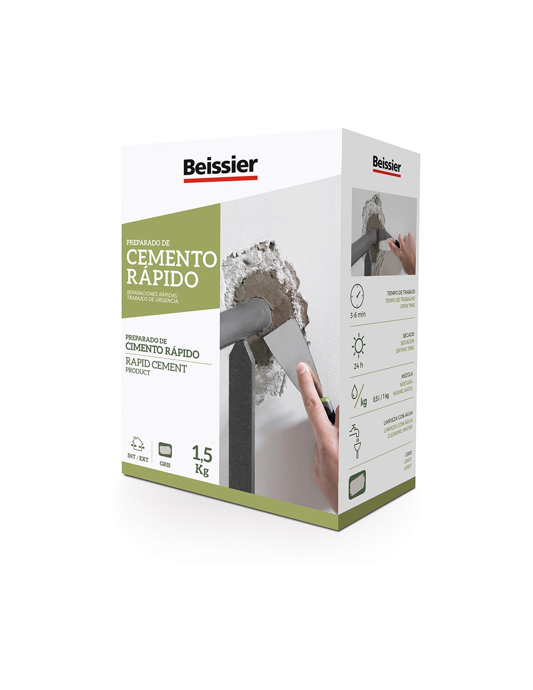 Cemento rápido 1,5 kg para obturar o tapar rápidamente fugas de agua. reparación y juntas de desagües. puede mezclarse con arena de 1 a 3 volumenes para hacer morteros rápidos de enfoscado. resistente a la intemperie y a la humedad. impermeable. alta resistencia y dureza. la sujeción puede ser sometida a esfuerzos en 20 minutos. color gris