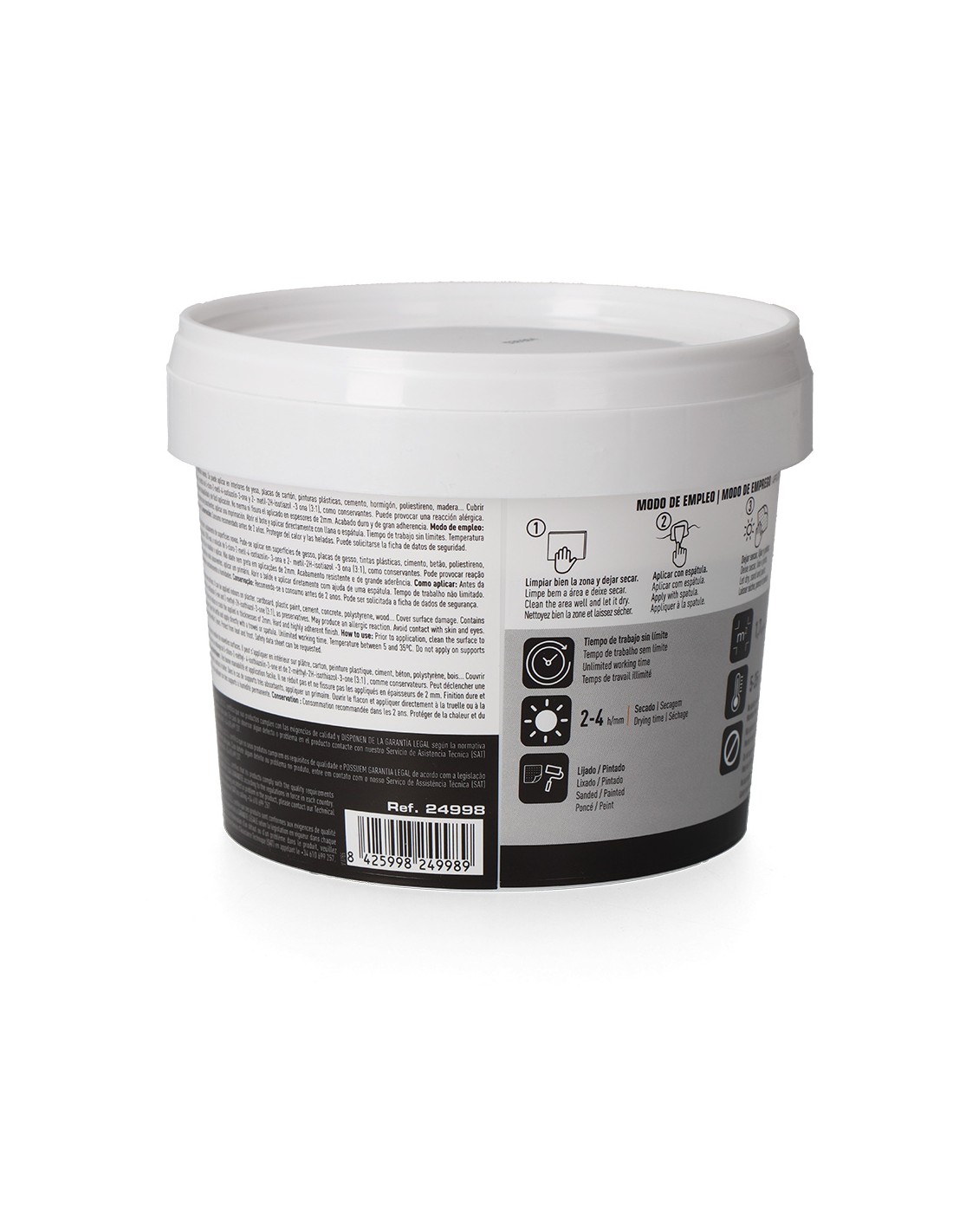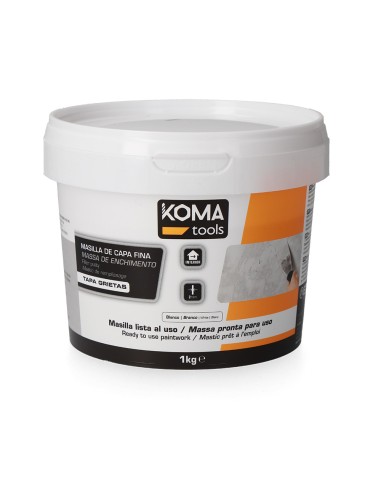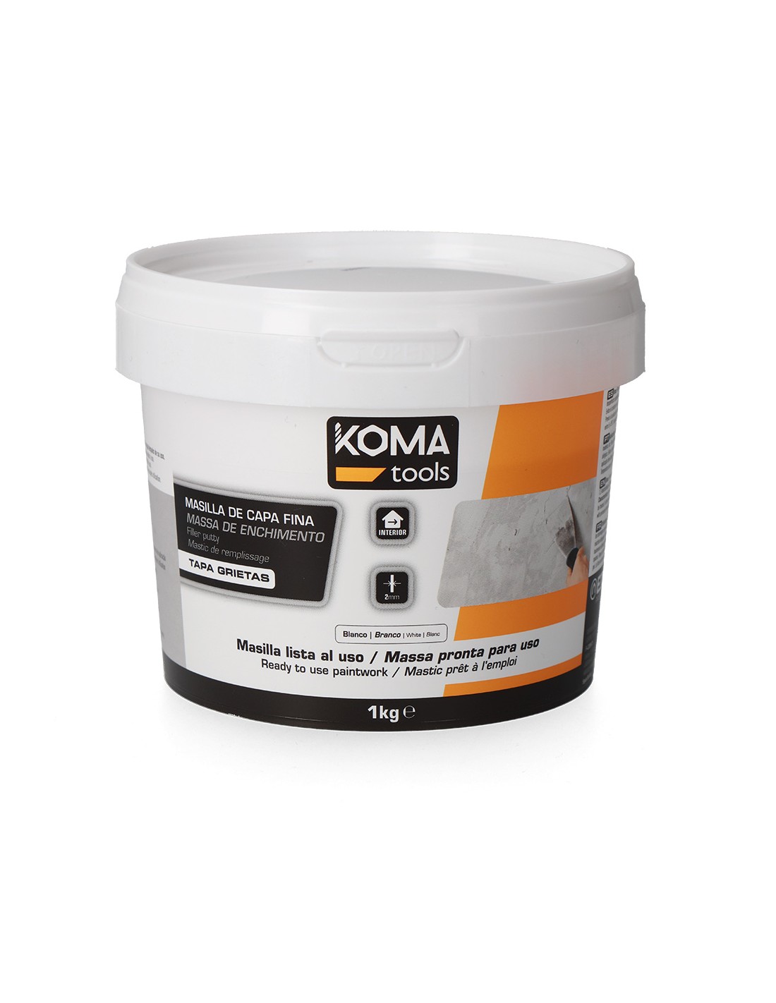 Masilla de capa fina lista al uso 1 kg. tapa grietas para reparaciones rápidas. pasta de secado rápido para la reparación de pequeñas fisuras, grietas y agujeros de clavos, sobre paredes y techos. aplicar sobre soportes limpios y sanos. lijar y pintar tras el secado completo. contiene bit, cmit/mit como conservantes. puede provocar una reacción alergica. tiempo de trabajo: sin limites. se puede trabajar (lijar, pintar) casi inmediatamente, en 10-15 min. tiempo de secado: 2-4h/mm. rendimiento: 1.70kg/m/mm