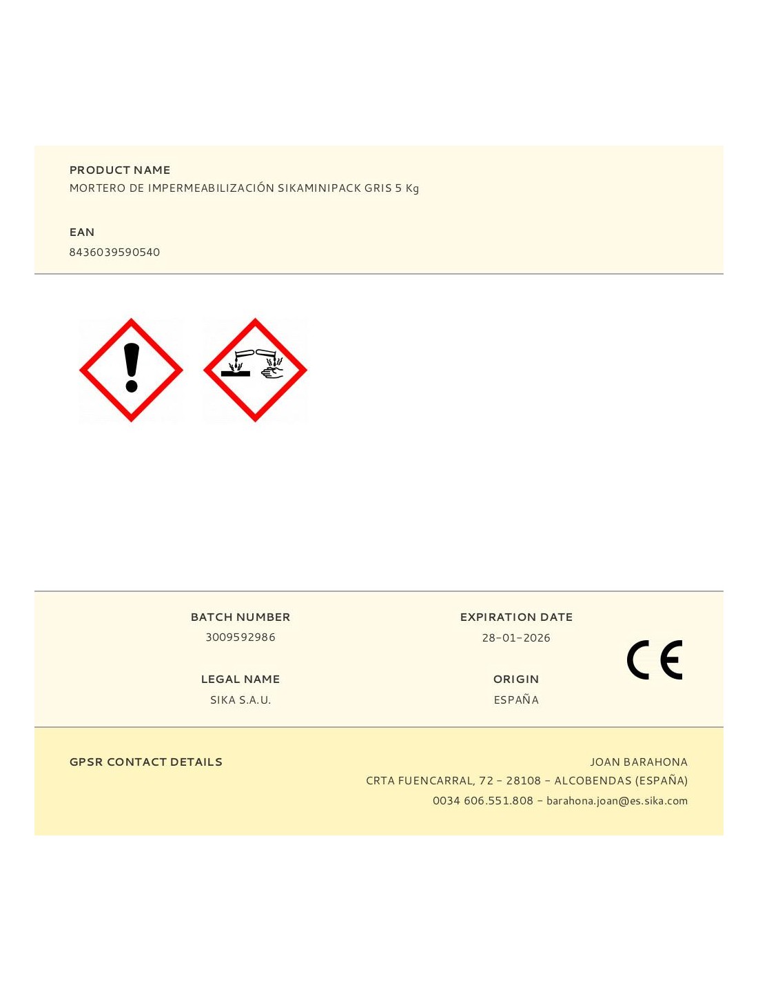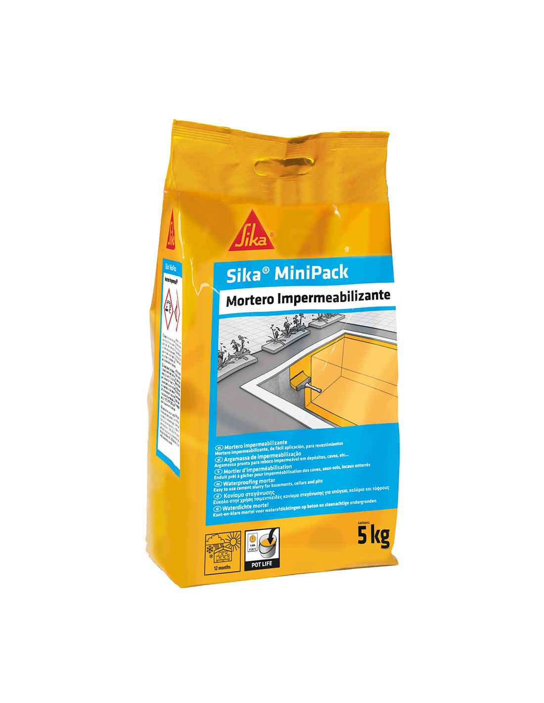 Sikaminipack, mortero impermeabilizante, monocomponente, gris para revestimientos de capa delgada. especialmente desarrollado para la impermeabilización y protección de cimentaciones, sótanos, fosos de ascensor y muros parcialmente enterrados.puede ser aplicado sobre hormigón, mampostería y enfoscados. bolsa de 5 kg una vez abierto consumir antes de 12 meses