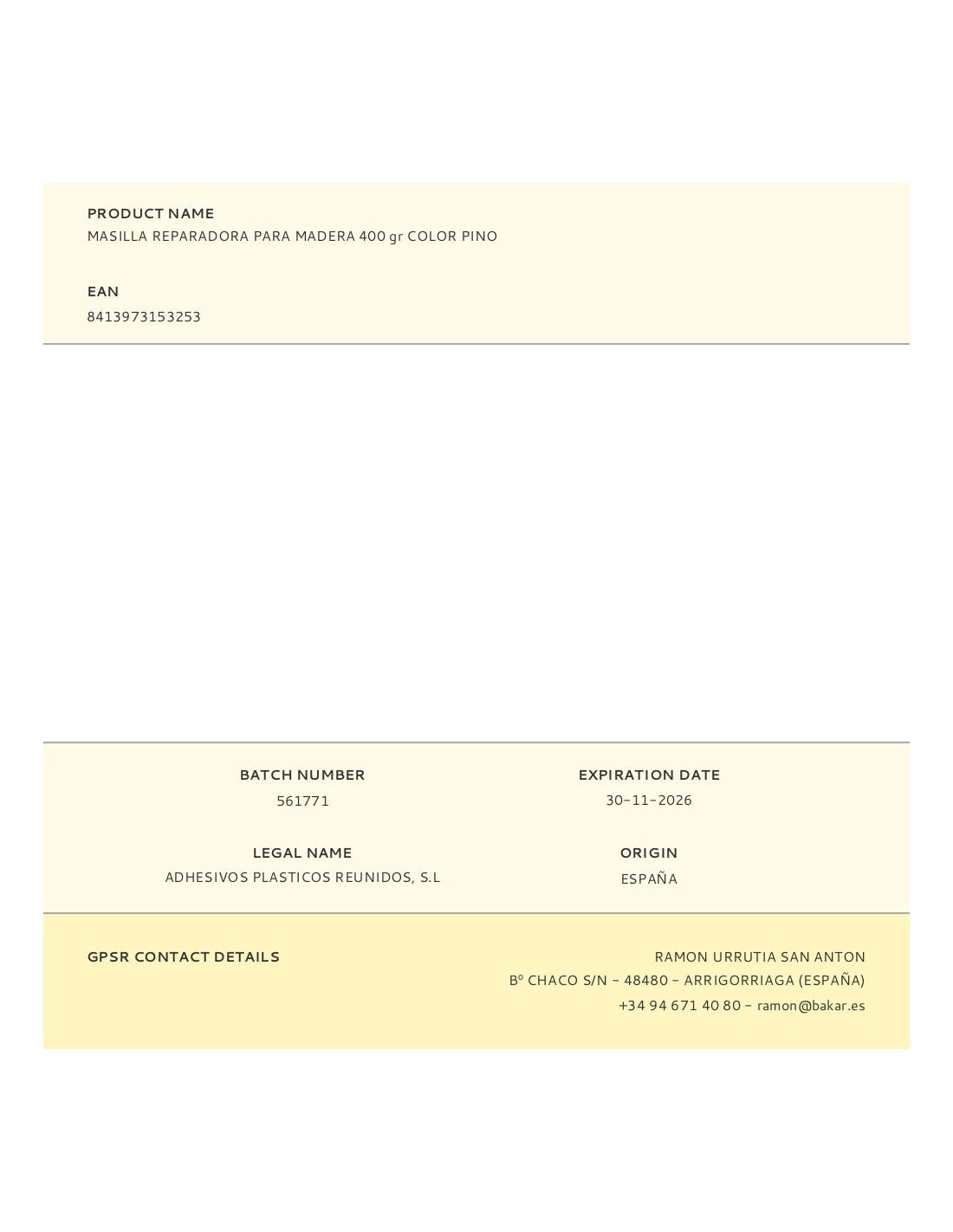 Masilla reparadora para madera color pino 400 g. preparado de alta calidad para la restauración y corrección de muebles, secado entre 2 y 8 horas, una vez seco se puede lijar, barnizar, y colorear. la dureza total se obtiene 24 horas después de su aplicación