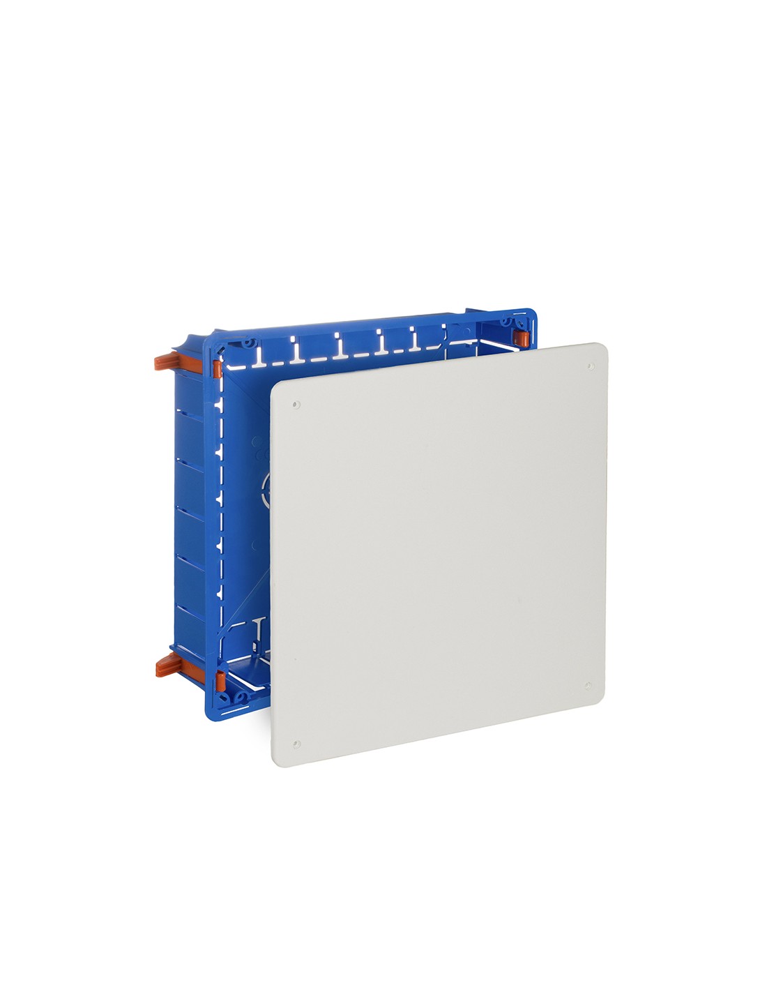 Caja de empalme para empotrar en tabiques huecos 250x250x50mm. caja con fijacion mediante bridas. entradas para tubos de ø25mm y 12 de ø32mm solera (retractilado) 324gw
